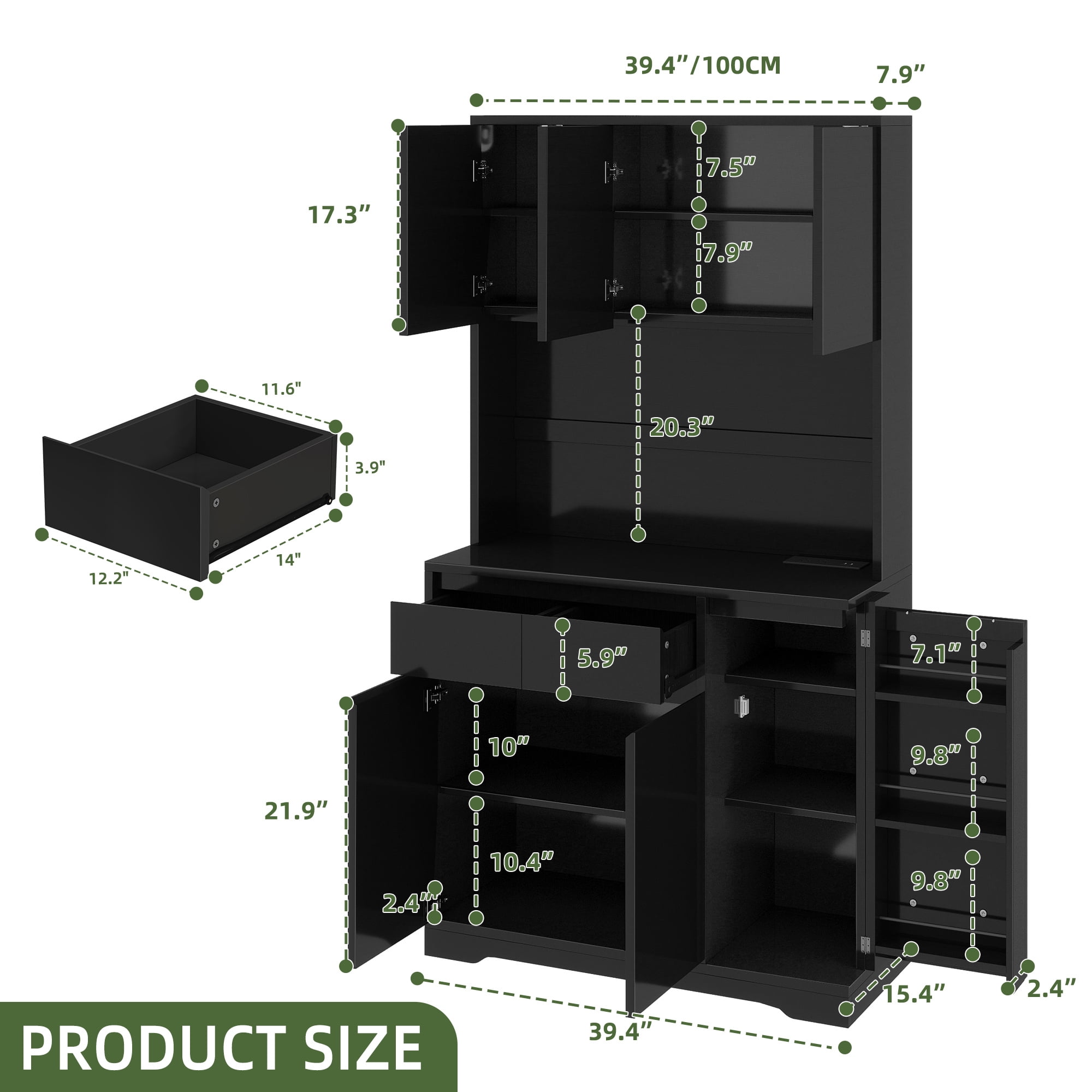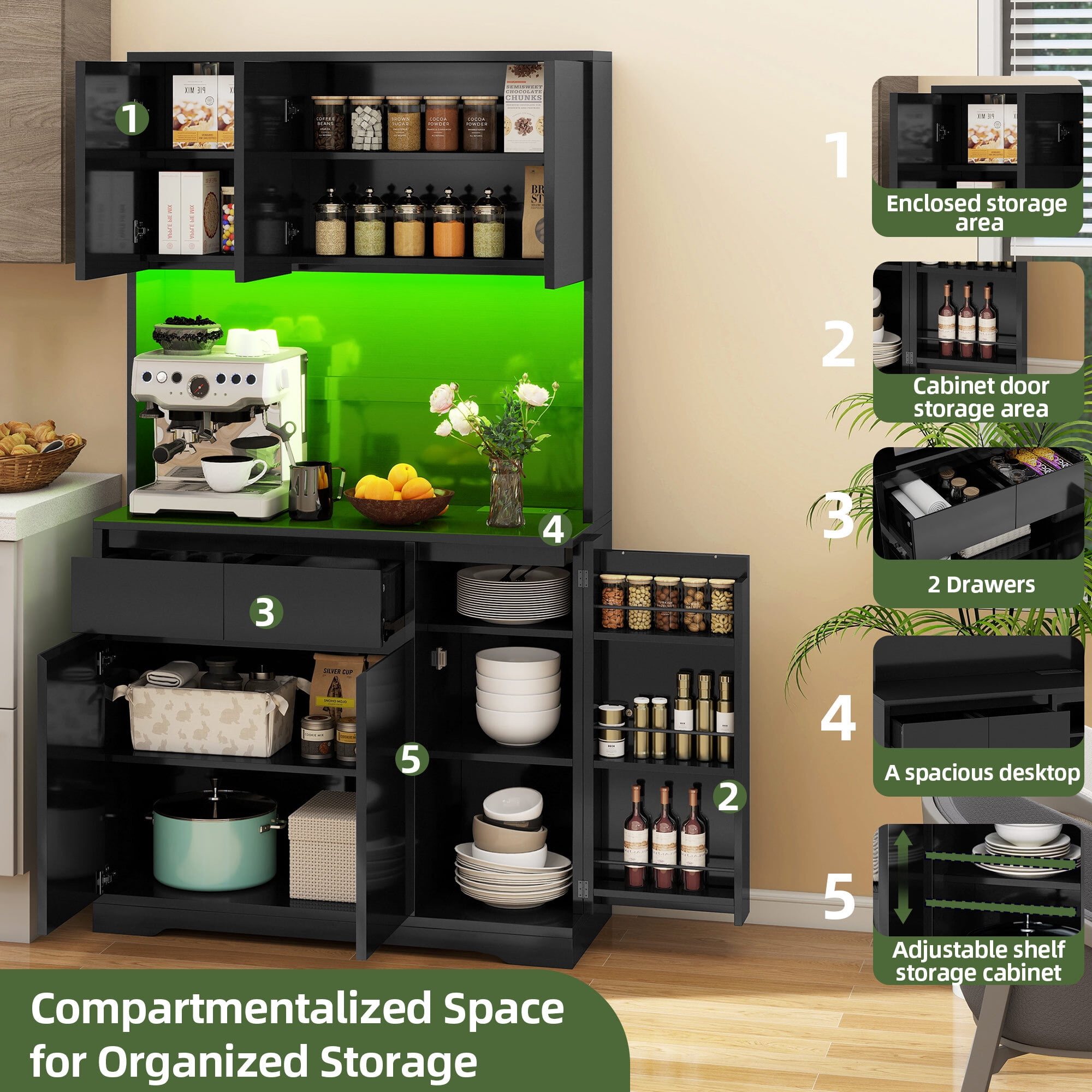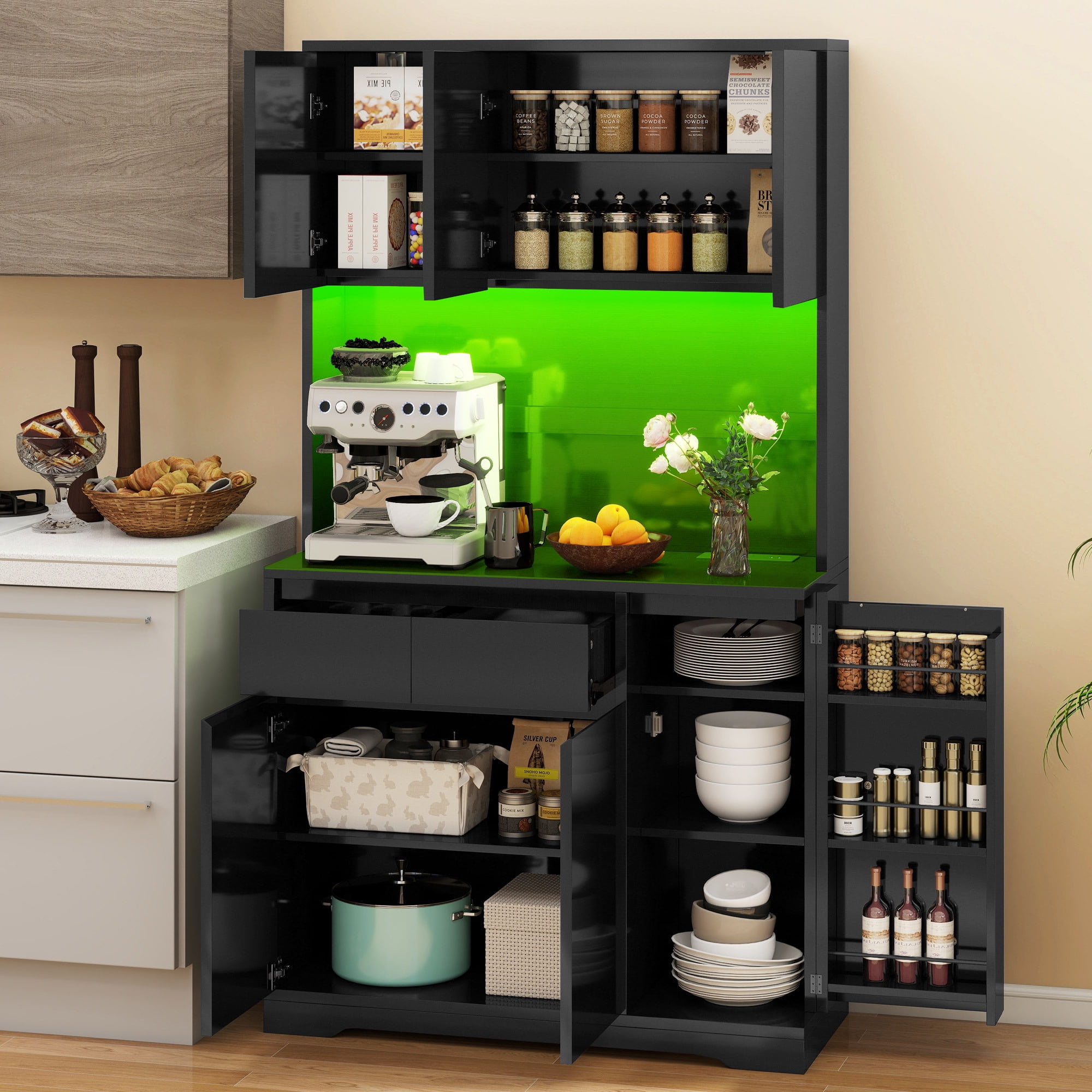 Ample Storage: The Uforic pantry storage cabinet provides a wealth of storage with 4 sizable cabinets, a single drawer, and an expansive countertop, ideal for keeping your kitchen organized and essentials within reach Sturdy Build: Made from robust MDF, this kitchen cabinet is engineered for durability and long-lasting use, offering a dependable storage solution that stands the test of time Charge Convenience: This kitchen pantry cabinet is outfitted with two AC power outlets and two USB ports, offering a convenient charging station for your devices, eliminating the need for extra cords Flexible LED Lighting: The pantry cabinet comes with Bluetooth-controlled LED lights, enabling you to adjust colors and modes to create the ideal atmosphere for various kitchen tasks and events Simplified Assembly: Assembly is straightforward with this cabinet, thanks to easy-to-follow instructions and parts that are clearly labeled, ensuring a quick and efficient setup without stress