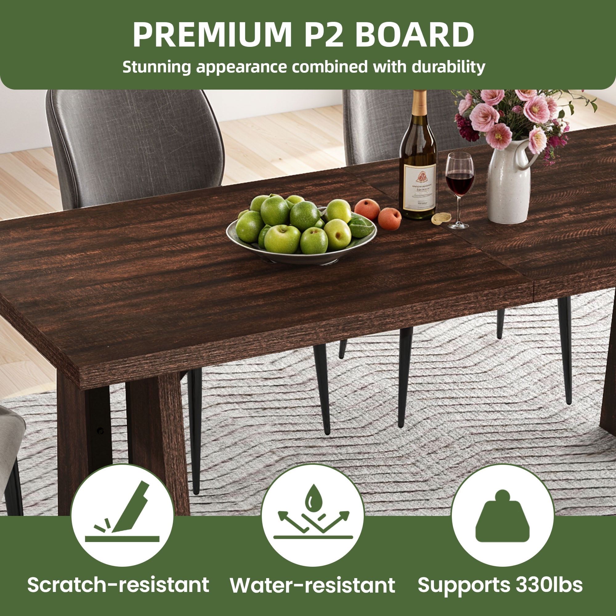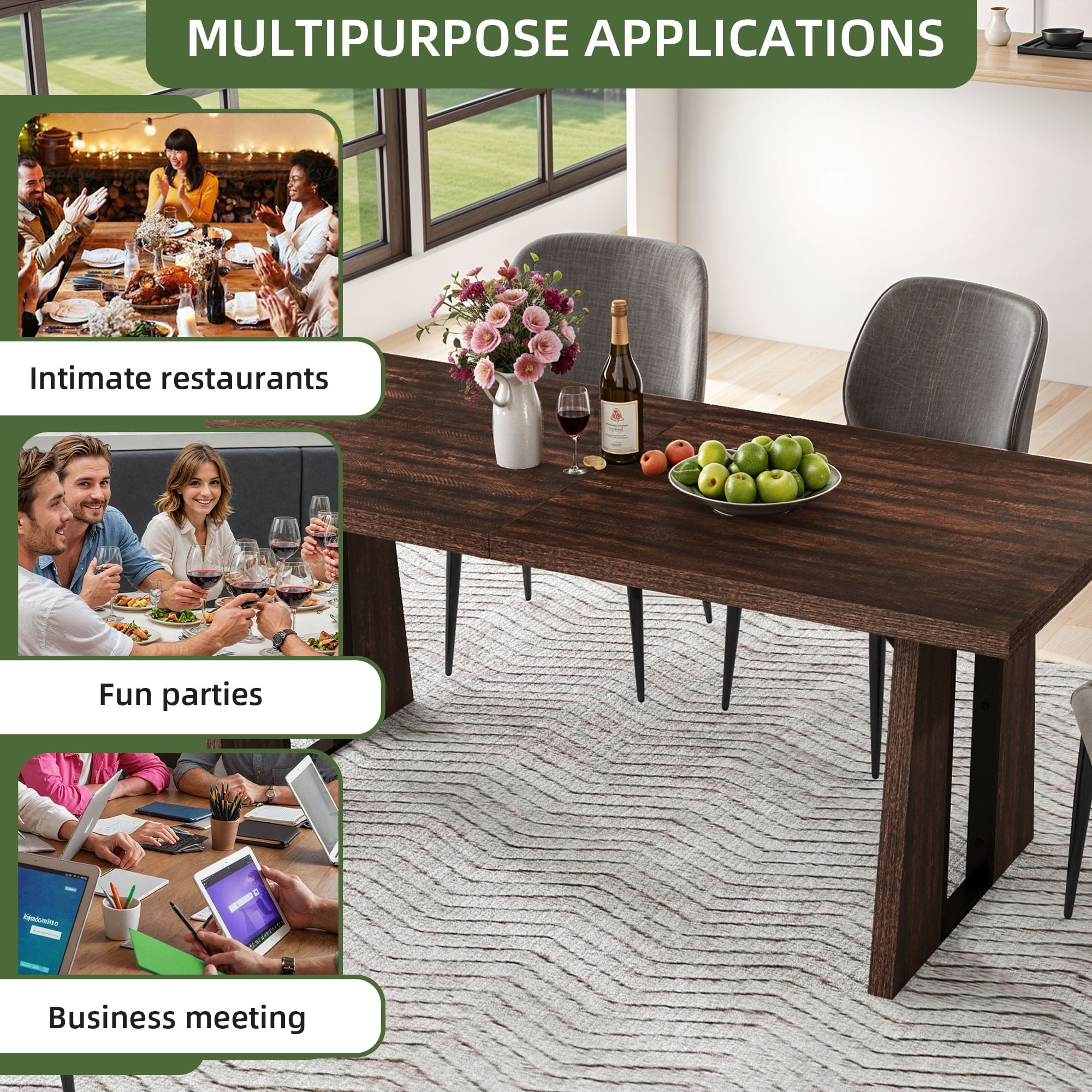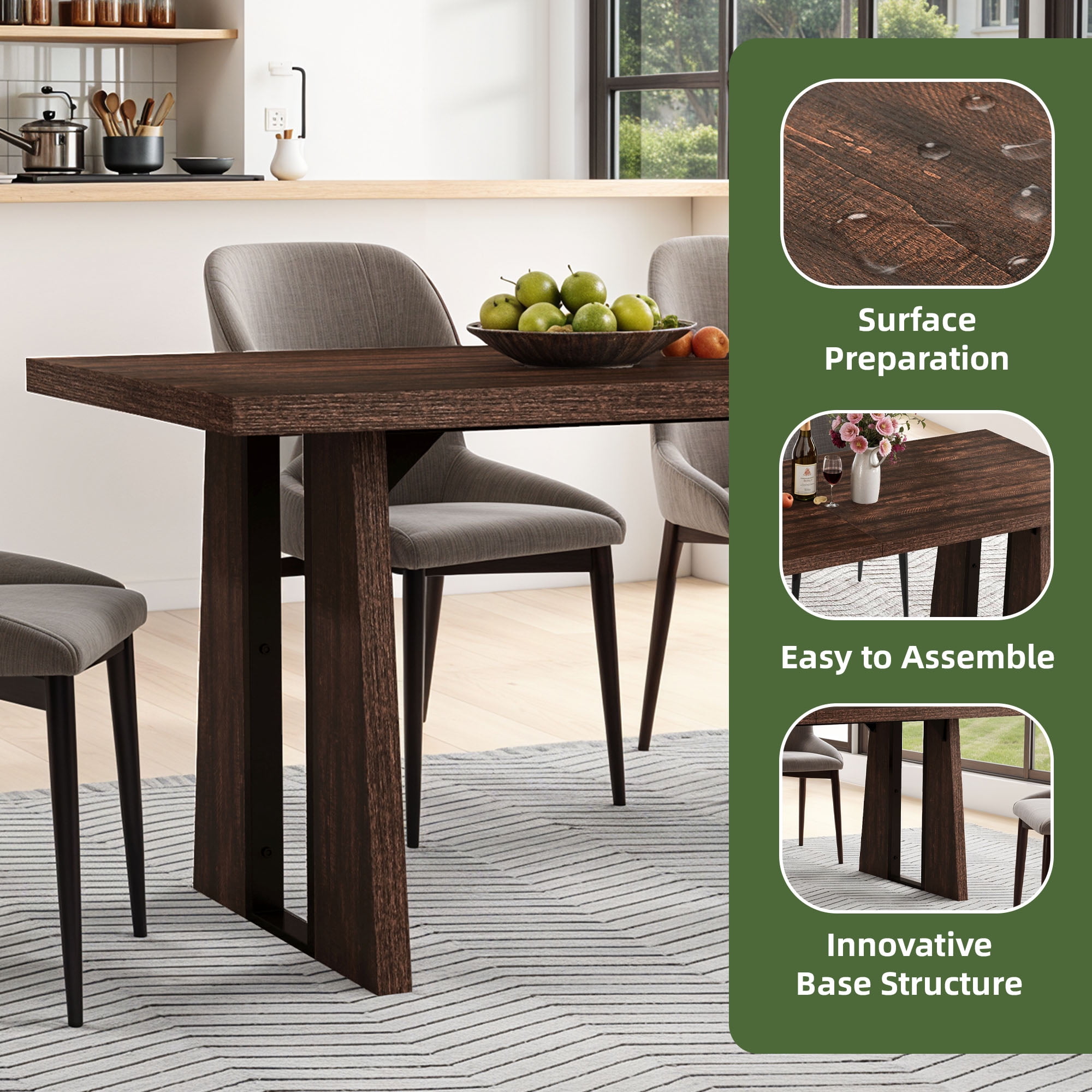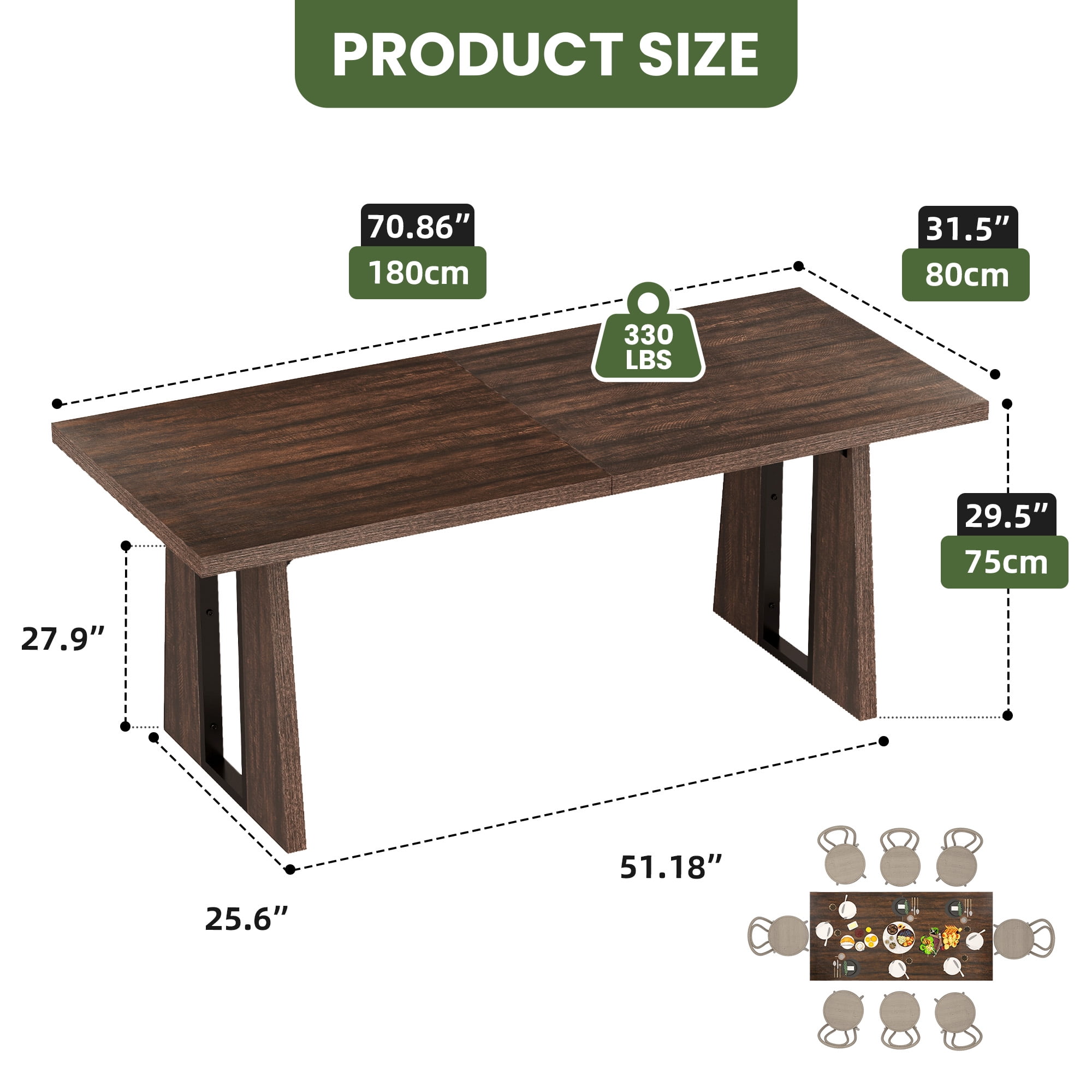 Space-Saving, Guest-Ready: Short on space but love to entertain? Our table comfortably seats more guests without crowding your room, giving you the flexibility to host gatherings with ease while keeping your dining area open and inviting. Lasting Performance: Featuring robust engineered wood with thickened surfaces, our dining table repels scratches and water. It effortlessly supports up to 330 lbs for all your dining needs, ensuring longevity and practicality for years to come. Gather in Style: Our dining table comfortably seats 6-8 people, fostering warmth and connection at every meal. Its blend of rustic charm and striking base design adds contemporary sophistication, making it the ideal centerpiece for any gathering. Versatile for Any Occasion: From charming gatherings to productive meetings, our rectangular dining table is designed to excel in any setting. Its versatility ensures it enhances every experience, making it a must-have for your dining area or office. Easy Build Commitment: Assembling our rectangular dining table is effortless, thanks to the clear instructions and pre-labeled parts included. We’re committed to delivering an outstanding product that ensures your satisfaction every step of the way.
