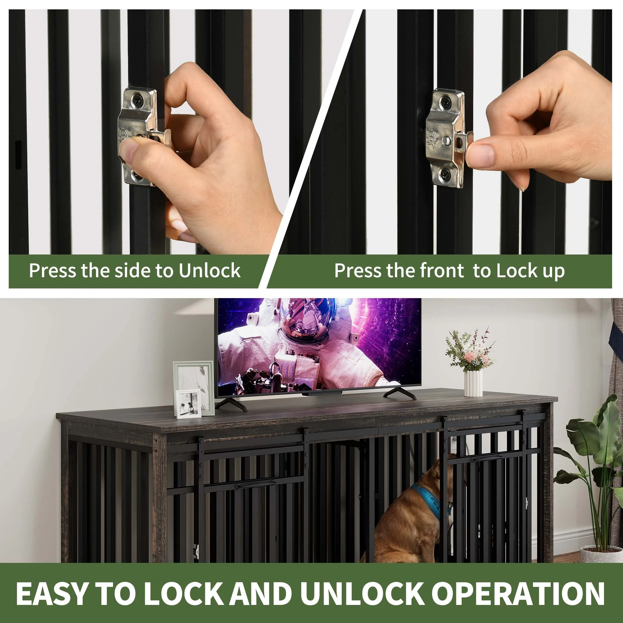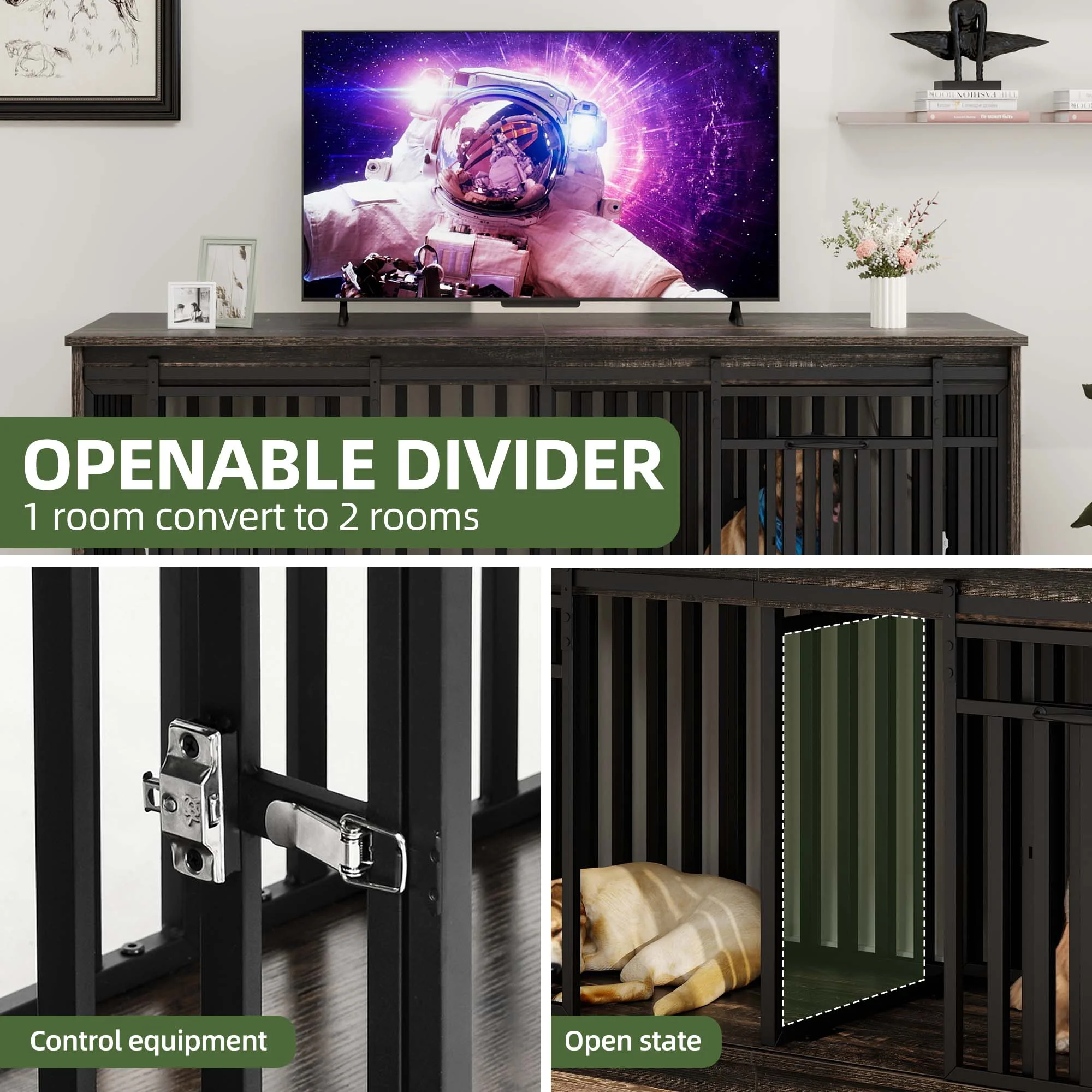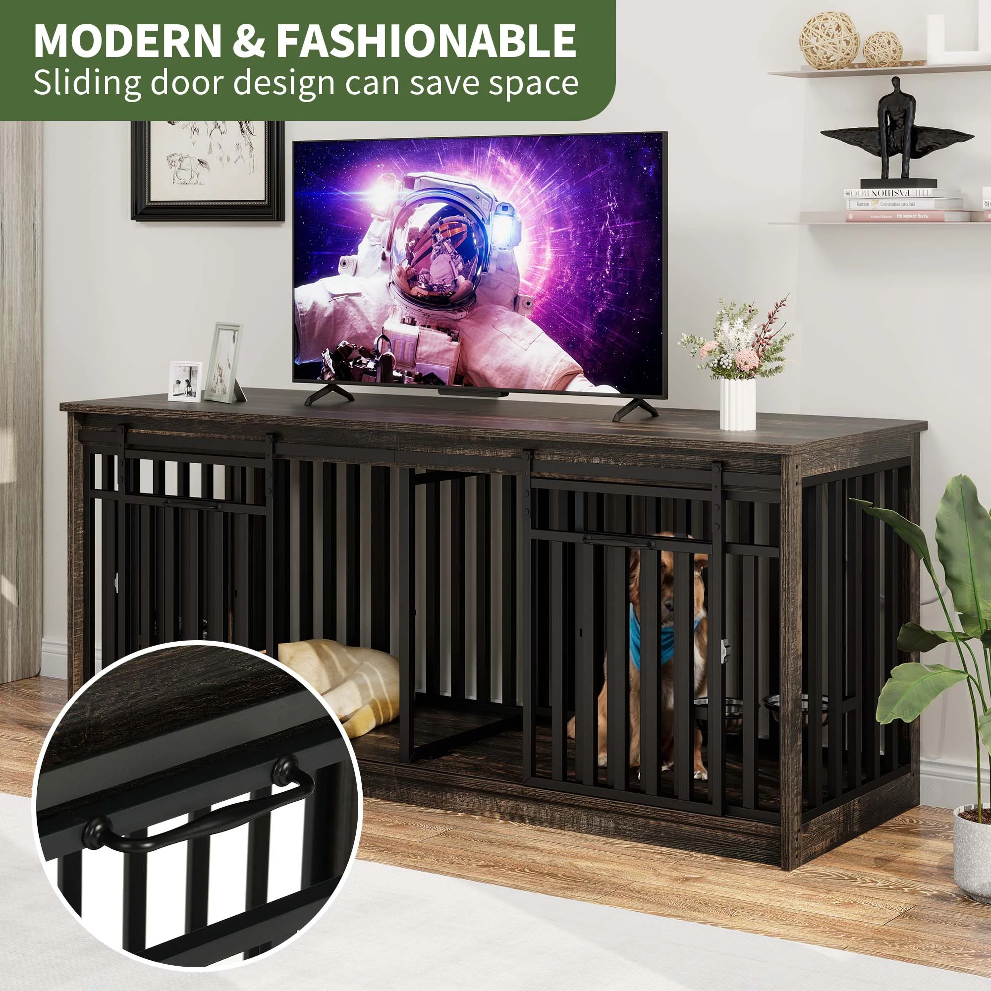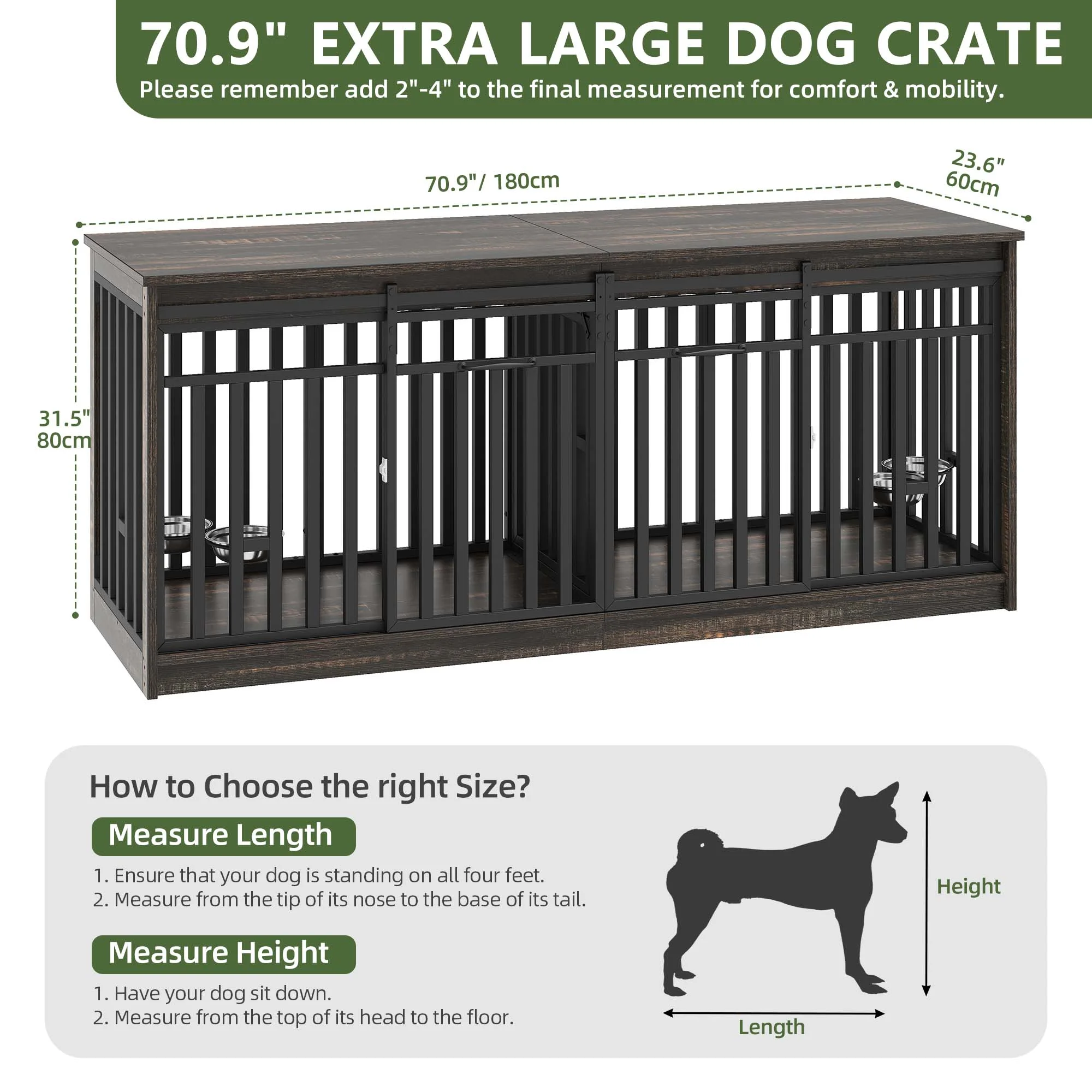 Sophisticated Design with Utility: This 71″ double dog crate furniture is crafted with heavy-duty wood and finished in a black oak hue, serving the dual purpose of a kennel for your dogs and a TV stand. Its sliding doors and decorative wooden design lend an air of elegance to any room. Efficient Use of Space: The dimensions of 70.9″L x 23.6″W x 31.5″H are thoughtfully designed to save space with barn-style sliding doors. This practical design allows for easy access to the internal compartments without needing to disassemble the crate, making it suitable for medium-sized dogs or one large dog. Interactive and Engaging Top: The crate’s top has a hollow design that facilitates interaction with your pets. This feature is perfect for playing, feeding, or bonding with your dogs, enhancing the relationship between you and your pets. Sturdy and Long-Lasting Build: The double dog crate is constructed with robust materials, including 20x10x0.6mm square tubes, ensuring the crate will stand the test of time. It comes with four dog bowls for easy feeding and features anti-toppling accessories for increased safety. Multipurpose and Convenient: This furniture piece is not just a dog crate; it also functions as a TV stand and a decorative table. Its versatile design and spacious interior are ideal for housing two medium-sized dogs in separate areas or providing ample space for one large dog.