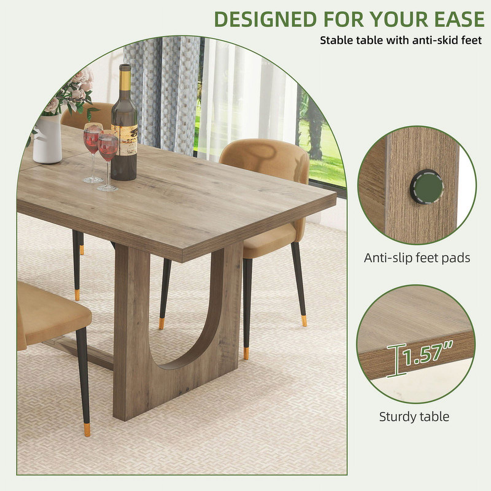 Warm Gathering Spot: This 70.86″ dining table caters to 6-8 diners, great for intimate gatherings. Share stories and treats with ease, creating cherished moments with loved ones around this inviting centerpiece. Retro & Sturdy: Embracing a sophisticated grey finish and a hollowed-out base, our table exudes a retro charm while maintaining durability. Enhanced with a sturdy bar at the bottom, it blends style with resilience seamlessly. Timeless Elegance: Crafted from robust engineered board in a scratch-resistant finish, this table is a lasting investment. Its enduring strength and practicality make it a standout piece for years to come. Versatile Charm: From family dinners to cafe-style meetups, this table adapts effortlessly to various settings. Whether hosting cozy gatherings or serving as a distinctive office meeting table, it adds a touch of practical elegance to any space. Effortless Setup: With labeled parts and clear instructions, assembling this dining table is a breeze. Spend less time on assembly and more time enjoying its beauty. Be prepared for your next delightful gathering or productive meeting with ease and style.