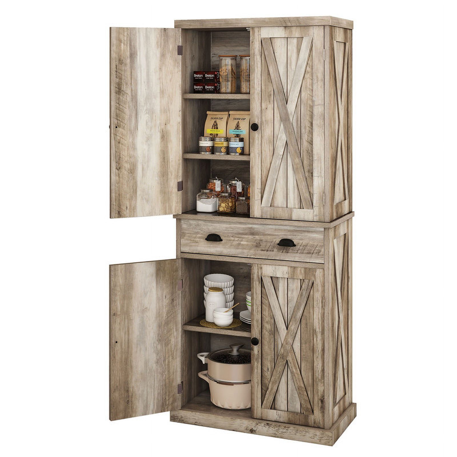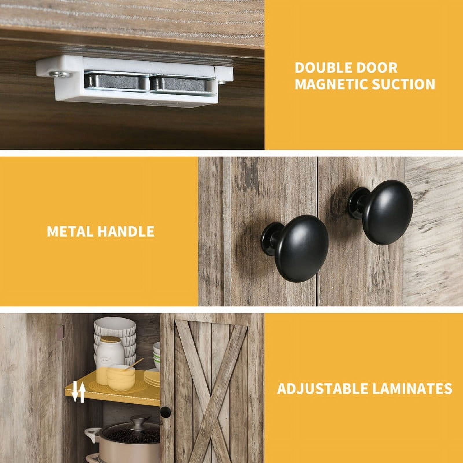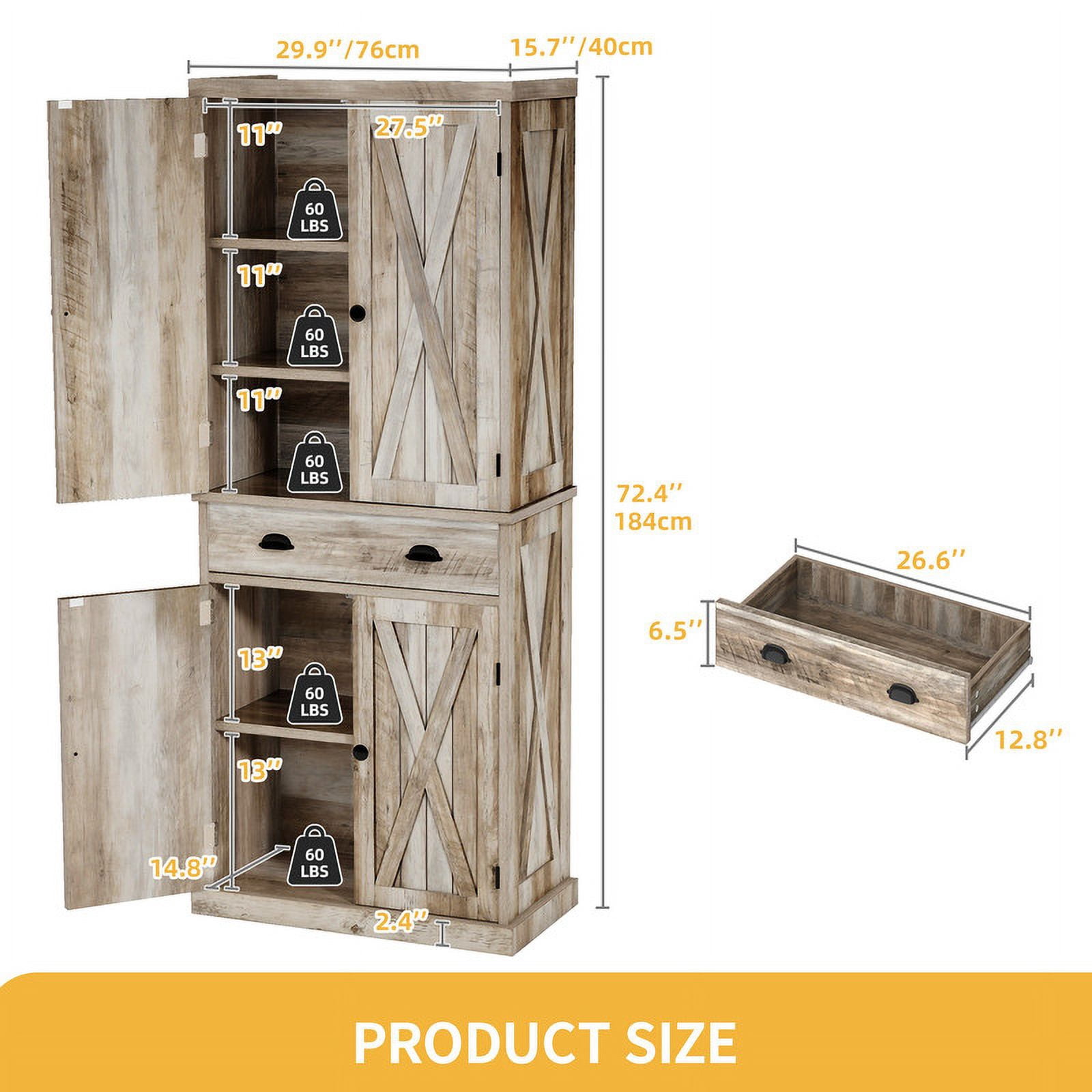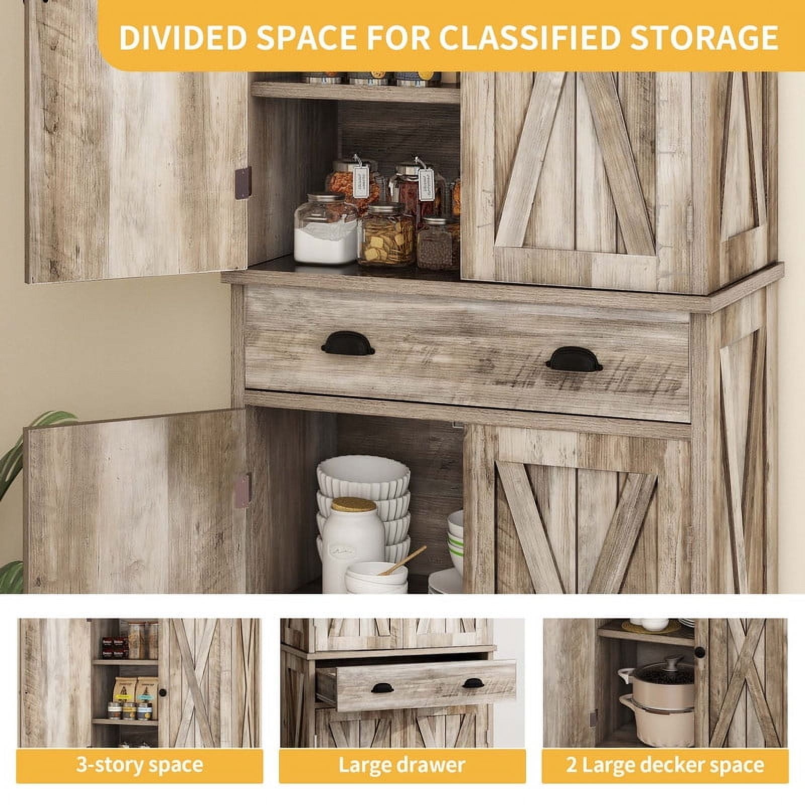 Ample Storage Capacity: The kitchen pantry cabinet offers generous storage space with its 5-tier shelves and large drawer, allowing you to organize and store a wide range of items such as dishes, pots, canned food, and plastic containers. Streamlined Organization for Your Kitchen: Our kitchen cabinet is designed to store everything from dry goods and canned items to appliances. Keep your essentials organized and easily accessible, making cooking and meal prep a delight. Organized Kitchen Made Easy: Designed for functionality, our kitchen storage features an enclosed cabinet with adjustable shelves for various-sized items, a large drawer for easy access, and bottom storage to safely hold fragile belongings. Long-Lasting Pantry Design: Made from solid engineered wood, our pantry storage is built for lasting use. The X-shaped barn door with magnetic suction ensures a snug closure, adding rustic charm while keeping your items securely stored and tidy. Versatile Cabinet for Any Room: More than just a kitchen or pantry piece, our cabinet fits beautifully in any room, from the living room to the dining room and more. Experience versatile storage that complements your home’s aesthetic. Smooth Assembly: Enjoy effortless assembly with our pantry kitchen, complete with simple instructions and pre-labeled parts. We’re dedicated to providing you with an excellent product that meets your needs and surpasses your expectations.