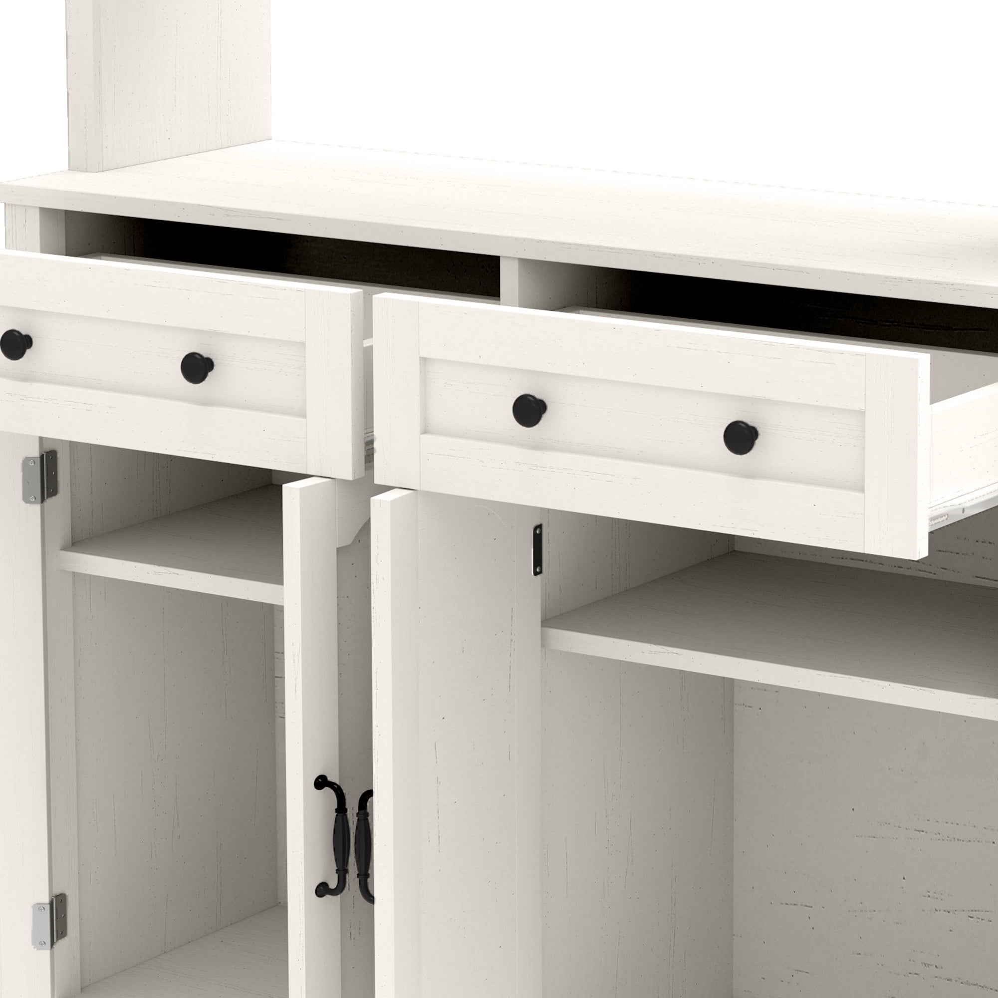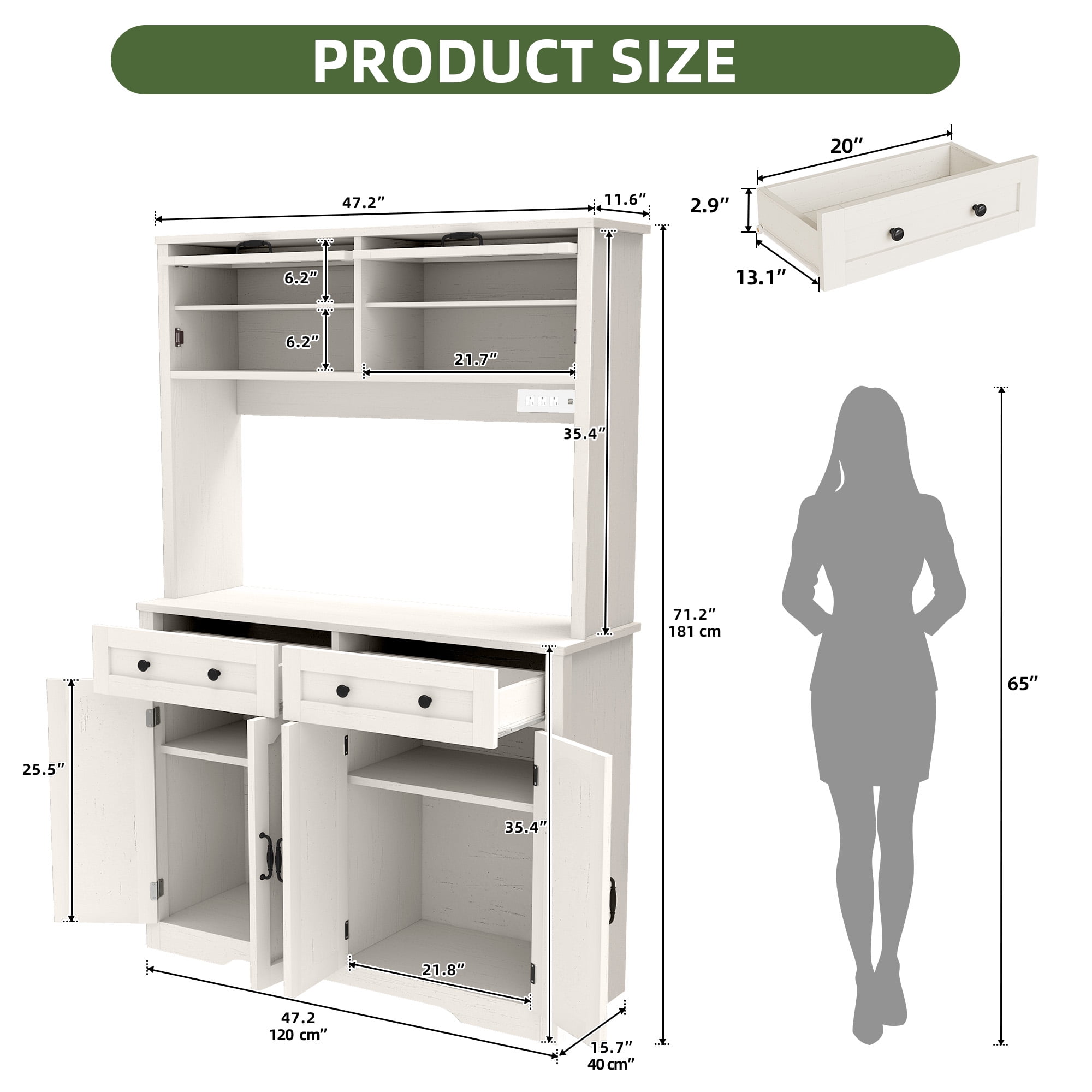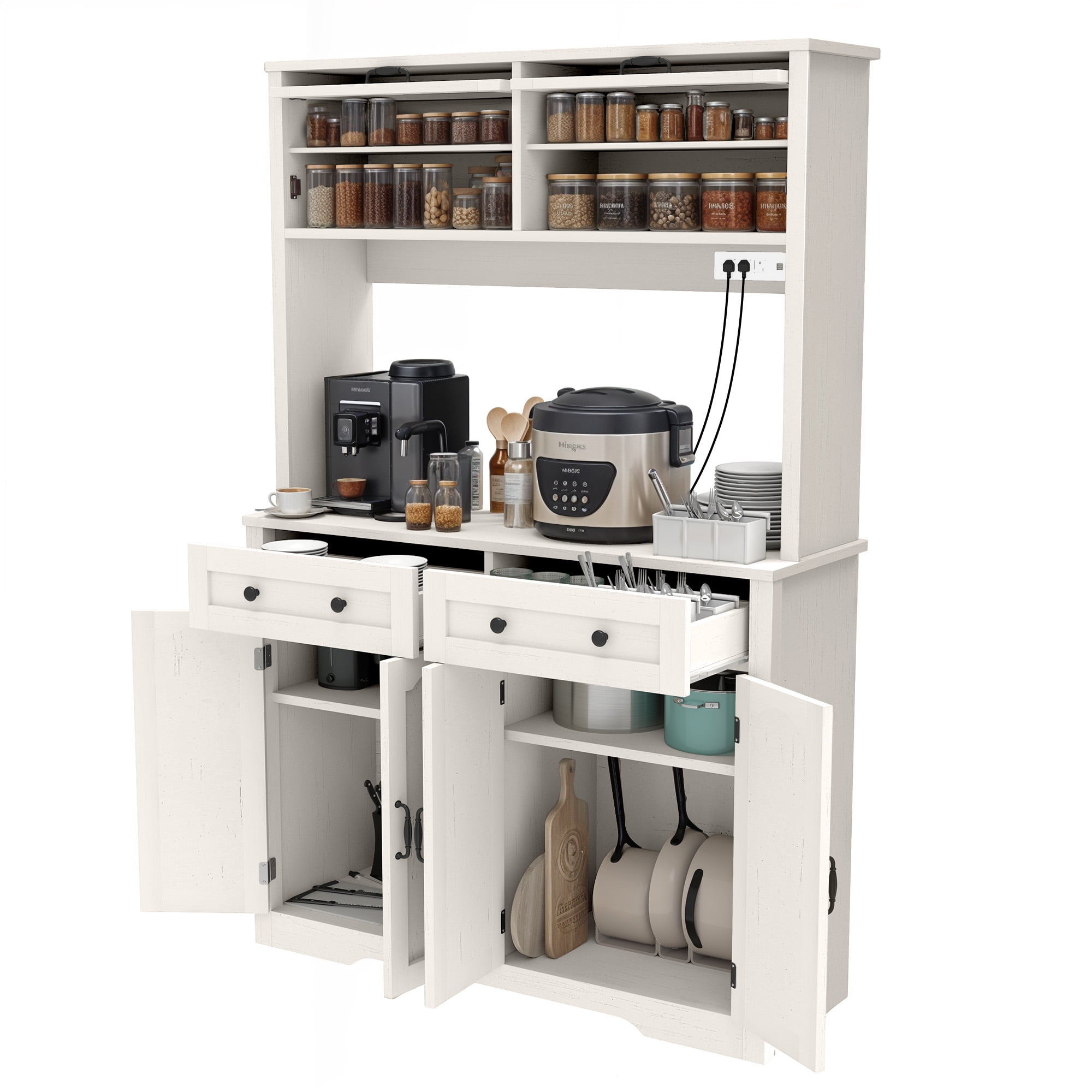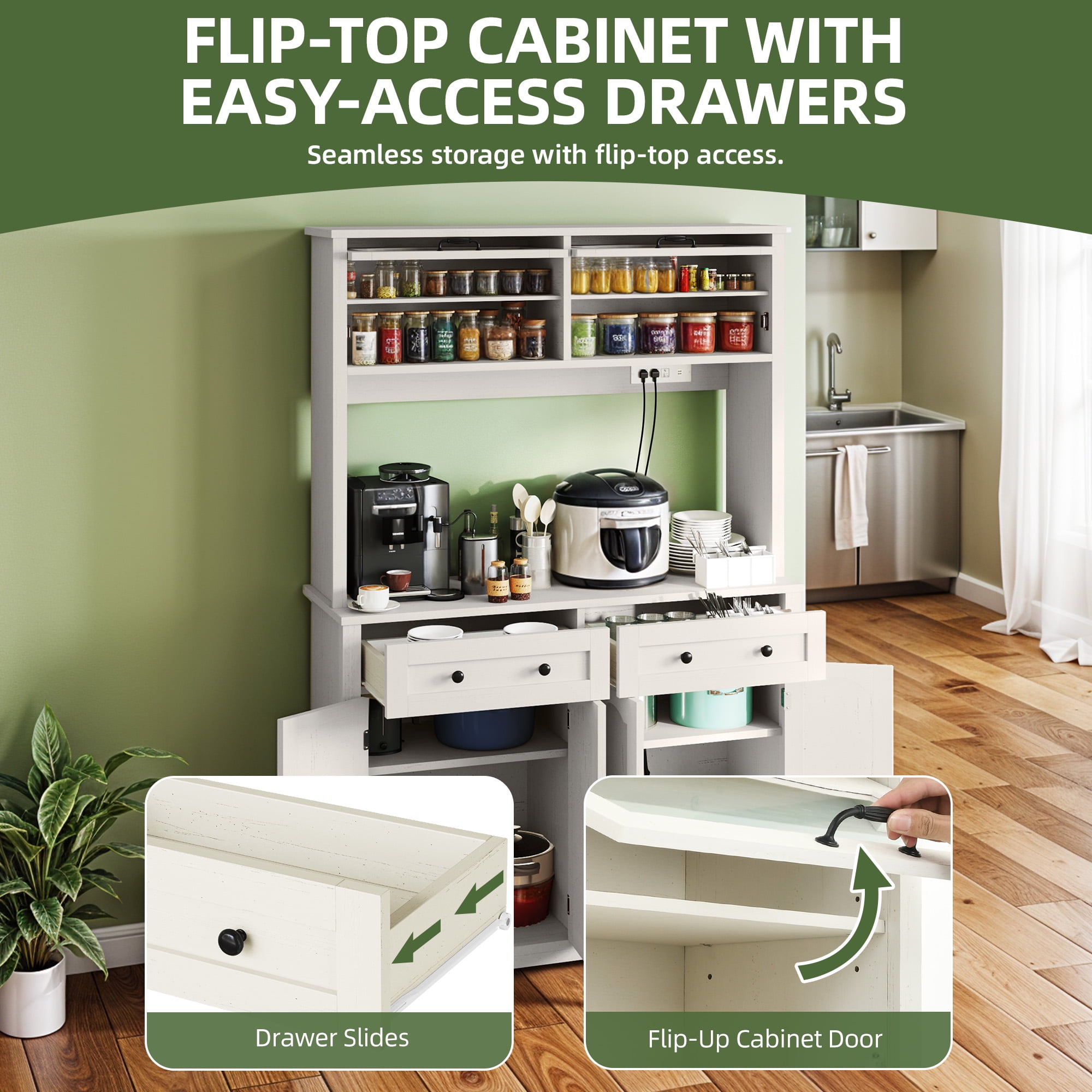 Smart Storage & Spacious Tabletop: With 2 display shelves for easy access to canned or instant food, our kitchen cabinet keeps everything organized. The spacious countertop is ideal for your microwave or coffee machine, making prep effortless. Efficient Kitchen Makeover: Revolutionize your kitchen with our compact yet spacious cabinet, expertly blending stunning design and smart storage solutions to make every corner of your space more functional, organized, and visually appealing. Efficient Pantry Organization: Keep your tableware organized and clean with the 2 roomy drawers in our tall pantry storage, suitable for spoons, forks, and knives. Plus, 2 cabinets with adjustable shelves let you store items of all sizes. Built for Stability & Durability: Built with robust engineered wood, our kitchen cabinet provides lasting durability and effortless maintenance. The tip-resistant design adds stability, keeping it steady and secure, while assembly is quick and easy. Stay Powered with Multiple Outlets: Keep powered up with our tall kitchen storage, featuring 3 AC outlets and 2 USB ports. Charge or power your microwave, phone, and more while enjoying cooking tutorials without low-battery stress.