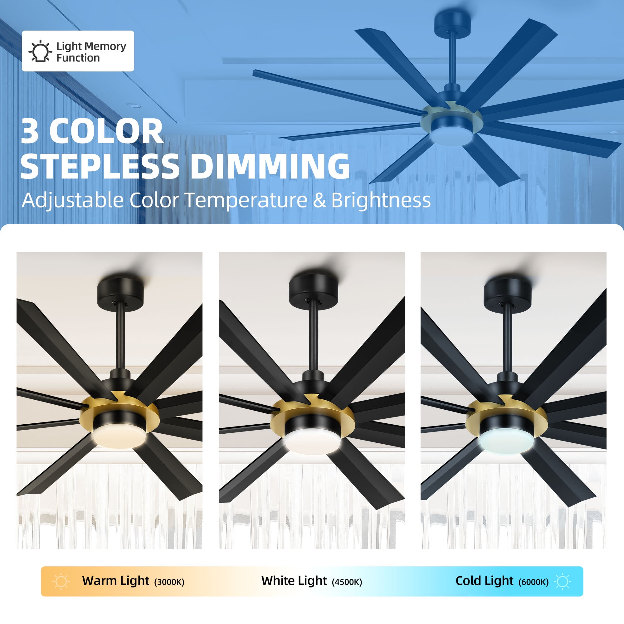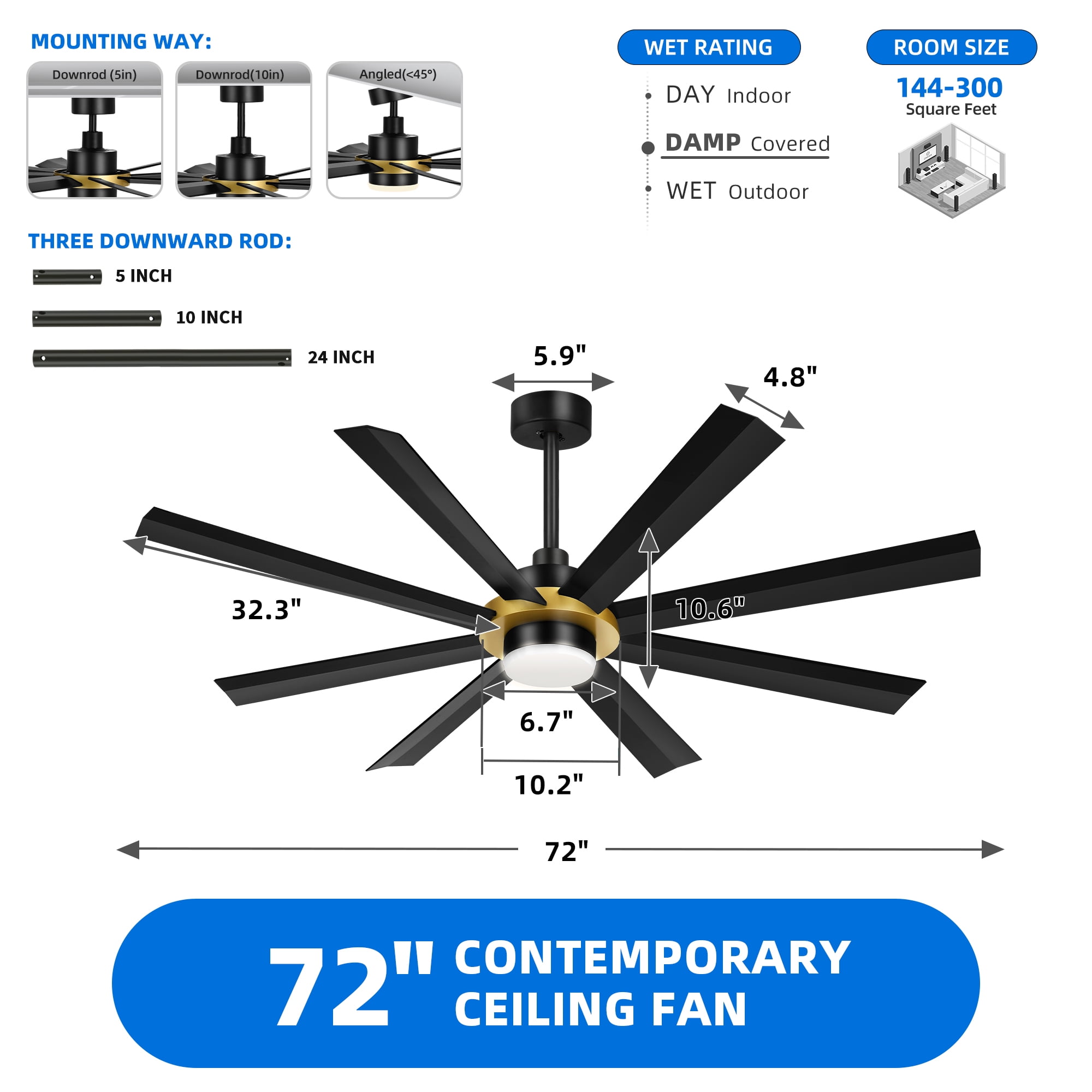 Trendy 72-inch Ceiling Fan: Revamp your space with this chic 72-inch ceiling fan. Featuring 8 sleek black blades and a stylish gold accent, it blends modern and elegance vibes well. Ideal for living rooms, garages, barns, and patios. Vibrant 3-Color Lighting: This fan’s integrated LED light lets you pick from warm 3000K, natural 4500K, or cool 6000K white. Adjust the brightness from 0% to 100%, and it even remembers your last setting for a personalized touch every time. Quiet 6-Speed Motor: Relax in peace with our whisper-quiet DC motor, boasting 6 speeds to suit your mood. Clocking in at low dB, it creates a zen atmosphere for reading, working, or just kicking back. Season-Ready with Remote: Switch from cool summer breezes to cozy winter warmth with a button press. The remote controls fan speed, light temperature, and has timers (1/4/8 hours). Enjoy year-round comfort effortlessly! Quick and Easy Installation: Install with ease using the included 5-inch, 10-inch, and 24-inch down rods, adaptable for ceilings 12 to 32 inches high. All necessary mounting accessories and detailed instructions are included for an effortless setup.