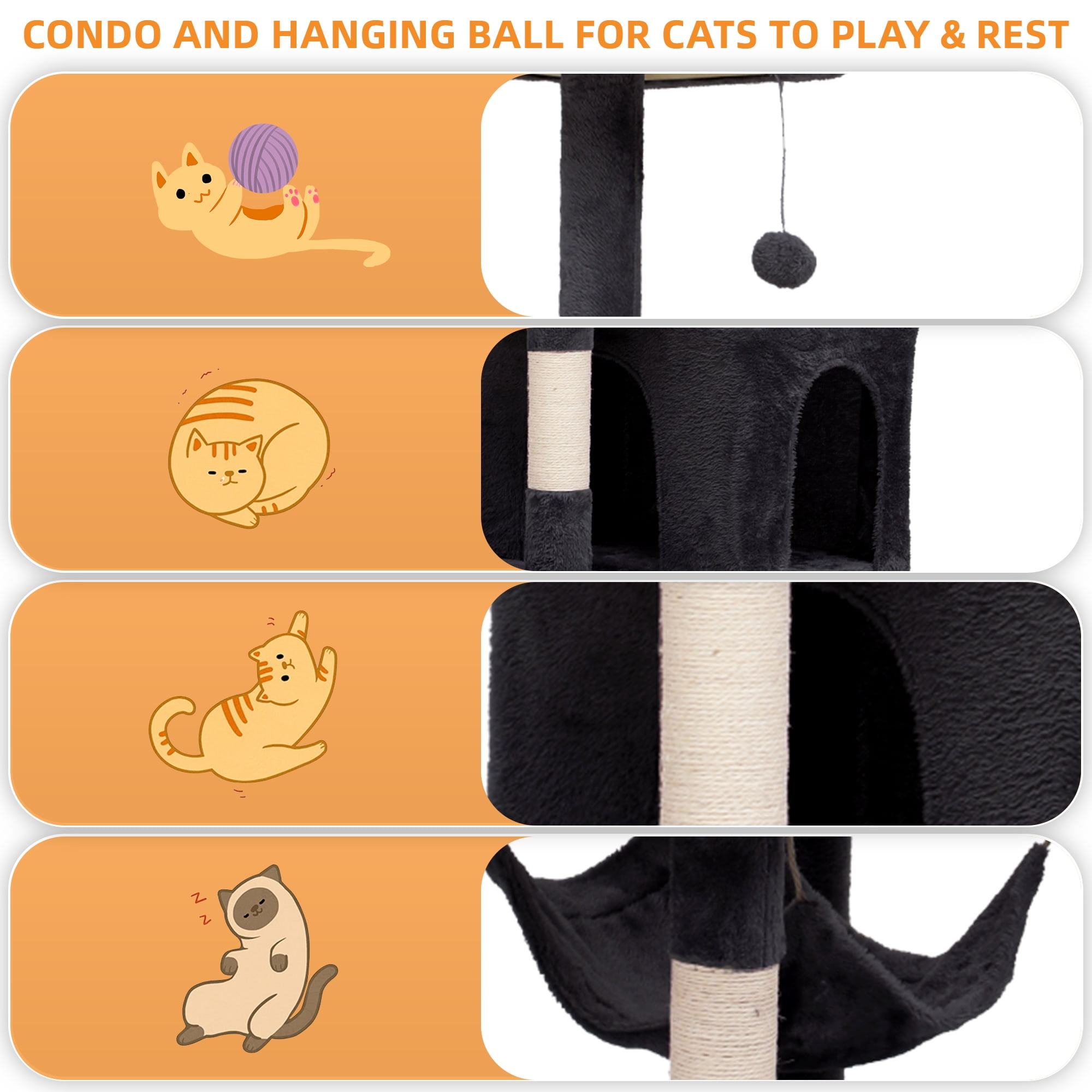Comfortable Hammock Retreat: The Uforic Cat Tree provides a plush hammock where your beloved felines can relax, enveloping them in warmth and comfort for a cherished retreat. Versatile Pet Hub: This cat tree from Uforic is designed to accommodate multiple cats with ample space. It includes a raised perch and cozy hideaway, offering each cat their own peaceful spot to rest. Sturdy Construction & Opulent Comfort: Made from premium engineered wood, this Uforic cat activity center ensures exceptional stability. The velvety plush fabric provides a soft and comfortable surface that your cats will love. Effortless Assembly: With a simple and easy-to-follow design, this Uforic indoor cat activity center can be quickly assembled by one person. Entertaining Pastime: Equipped with two swinging pompoms with jingling bells, this Uforic cat tree provides endless amusement and encourages your cats to express their natural instincts in a safe and engaging manner.