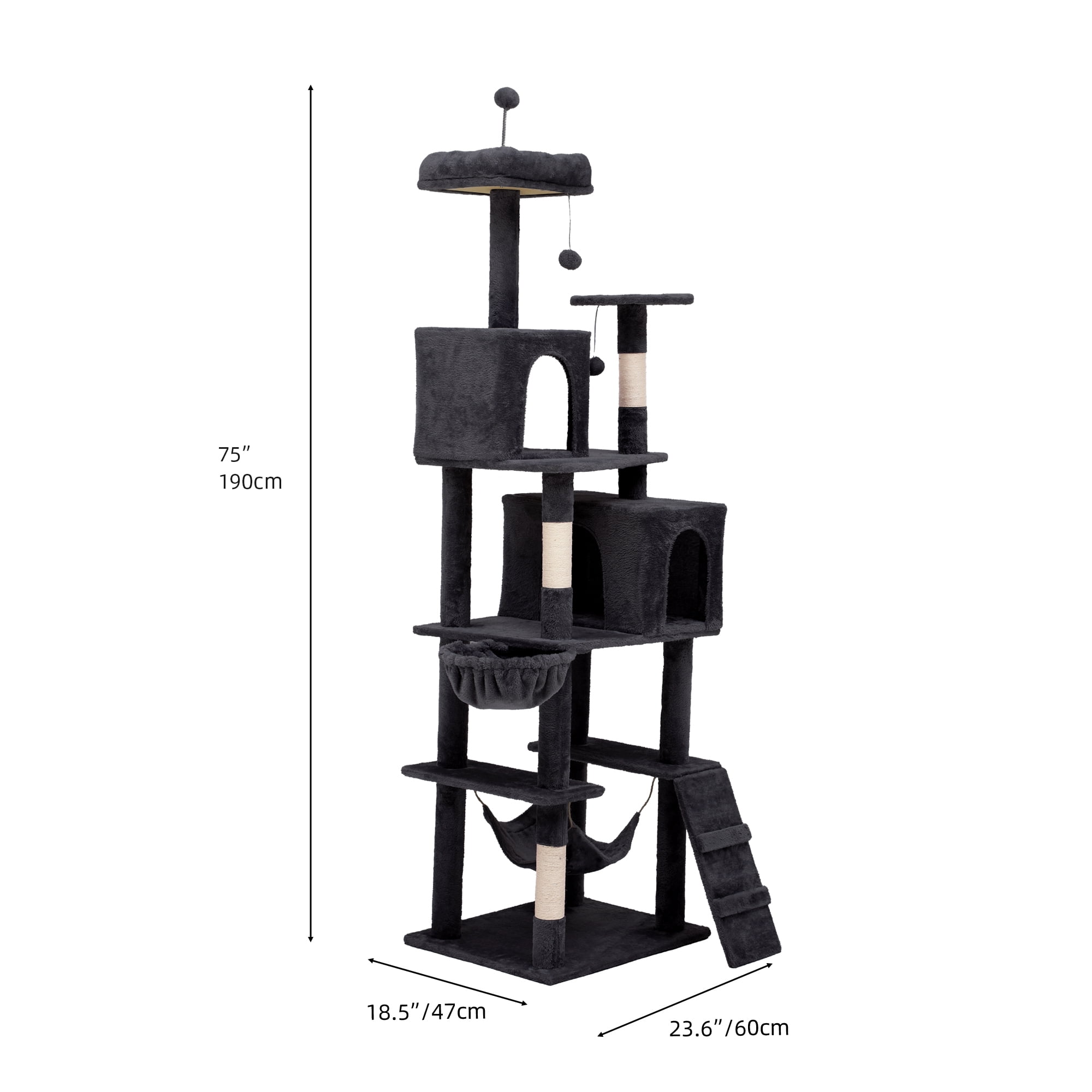 Uforic 75″ Multi-Level Cat Tree with Scratching Posts, Caves & Hammock, Dark Gray