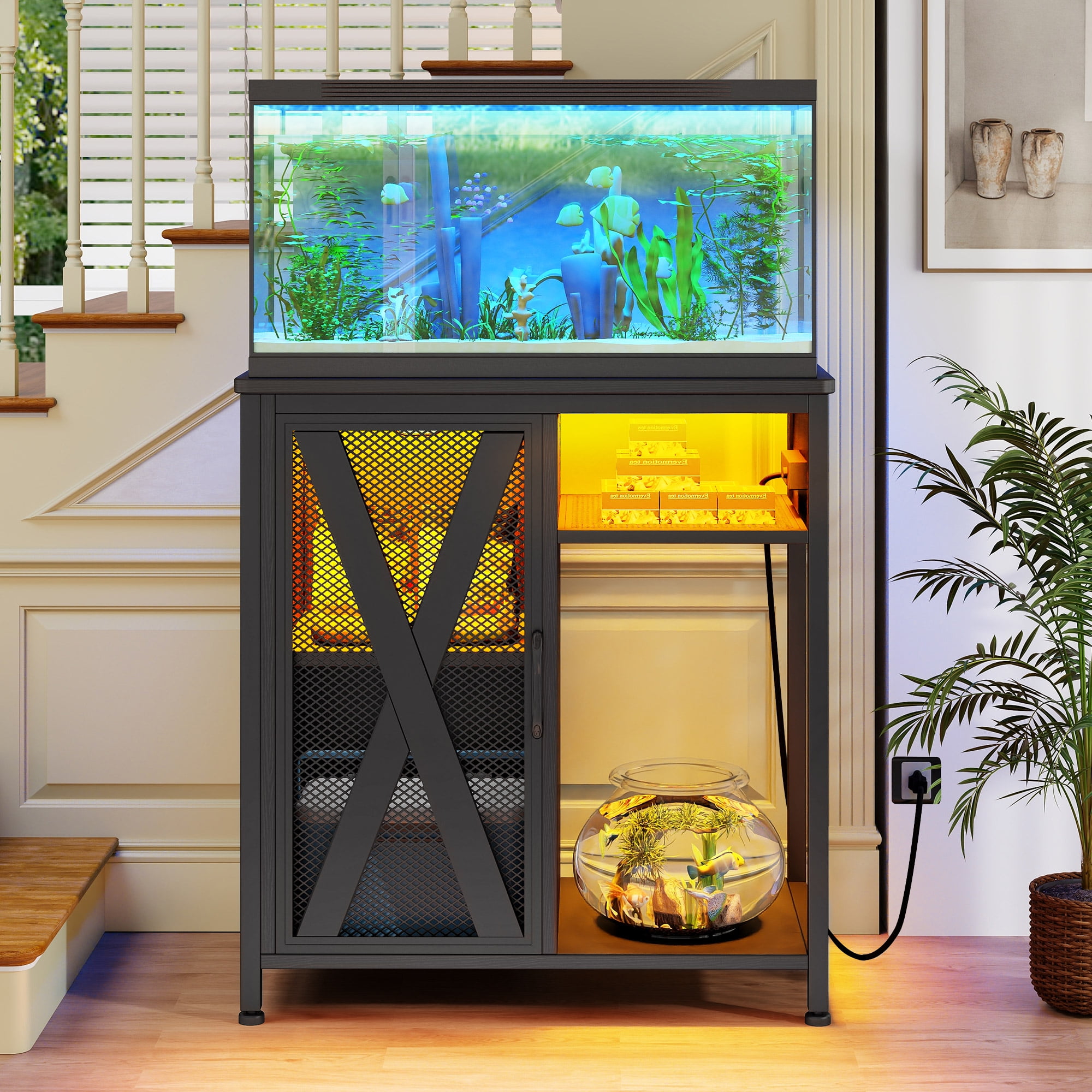 Uforic Aquarium Stand with Power Outlets & LED Light and Cabinet for 20-30 Gallon Fish Tank Stand, Turtle Tank, Reptile Terrarium – Black
