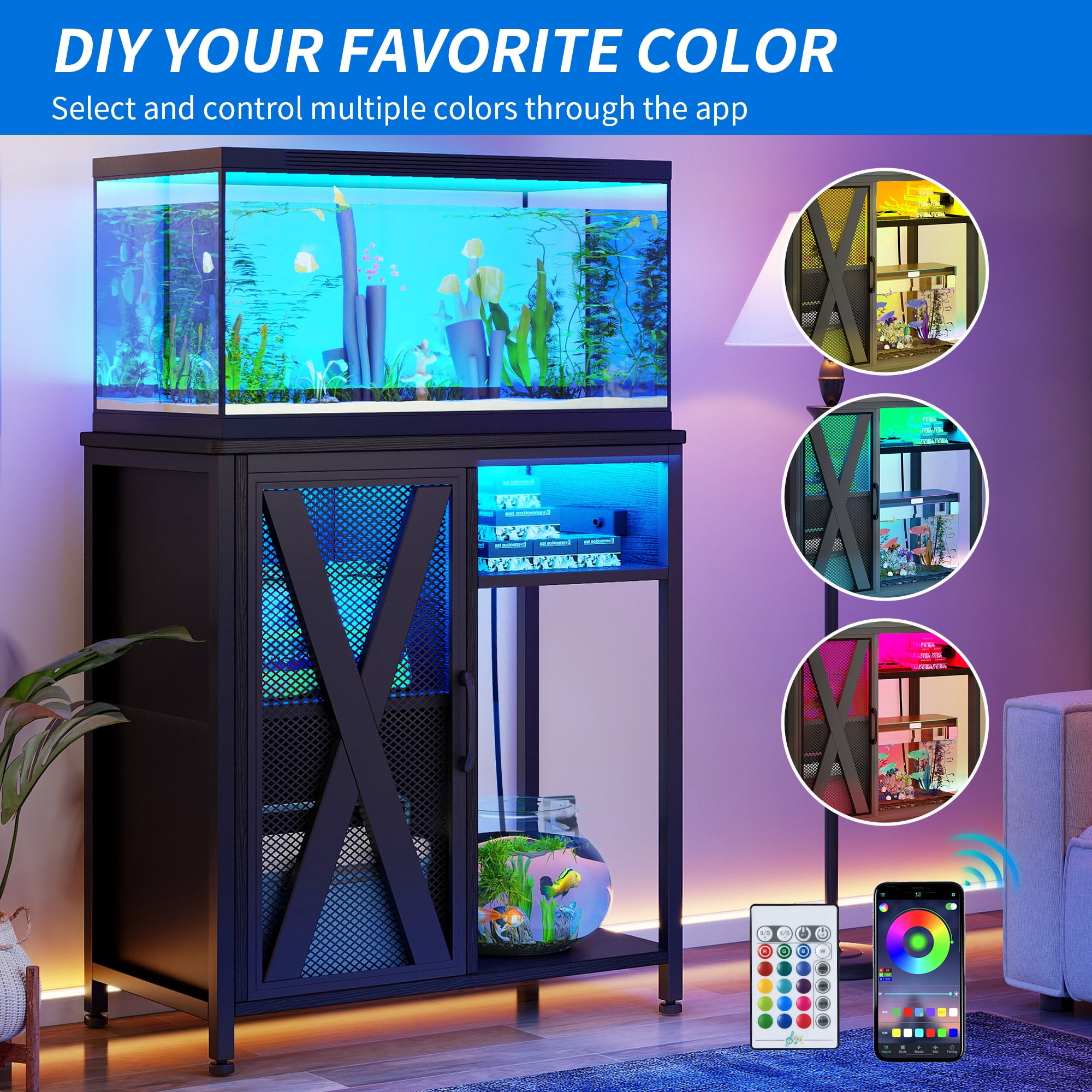 Stunning RGB LED Lights: Elevate your aquarium display with our stand featuring RGB LED lights, offering customizable illumination options both within the cabinet and above the smaller fish tank stand. Adjust the lighting to suit your mood and create a captivating ambiance for your aquatic environment. Space-Saving 2-in-1 Design: Optimize your space with our versatile stand that accommodates a 20-30 gallon fish tank on the top platform and fish tank kits on the bottom shelf. Designed to fit most standard aquariums, this stand provides a convenient and compact solution for housing your aquatic setups. (Note: Tanks not included) Organized Storage Solution: Keep your aquarium essentials neatly arranged with the built-in cabinet, perfect for storing fish food, cleaning tools, and accessories. Adjustable shelves offer flexibility to accommodate items of various sizes, ensuring a tidy and clutter-free environment for your aquatic hobby. Convenient Functionality: Simplify your fish tank management with integrated power outlets that can be easily installed without additional tools. Connect electronic devices such as lights, heaters, and oxygen pumps effortlessly, enhancing the functionality and convenience of your aquarium setup. Robust and Secure Construction: Constructed with thickened table legs, our fish tank stand provides sturdy support for aquariums weighing up to 350 lbs. Anti-tip devices are included to prevent accidents, ensuring stability and safety. The moisture-resistant material enhances durability, guaranteeing long-lasting performance for your aquatic display. Experience the perfect blend of style, practicality, and reliability with our LED-lit aquarium stand.