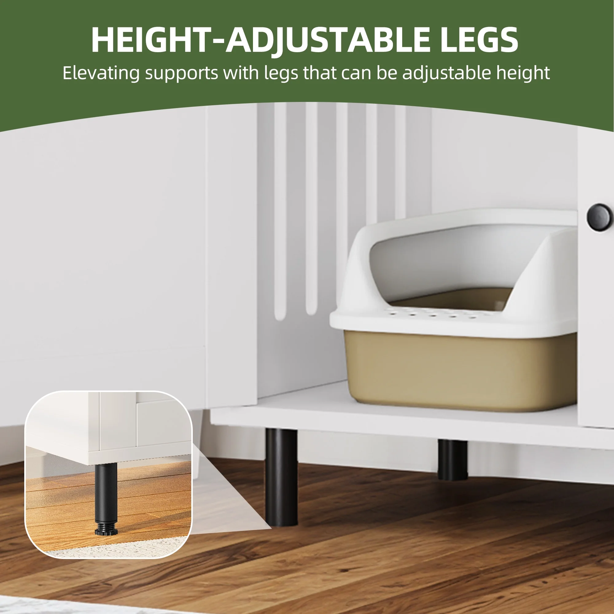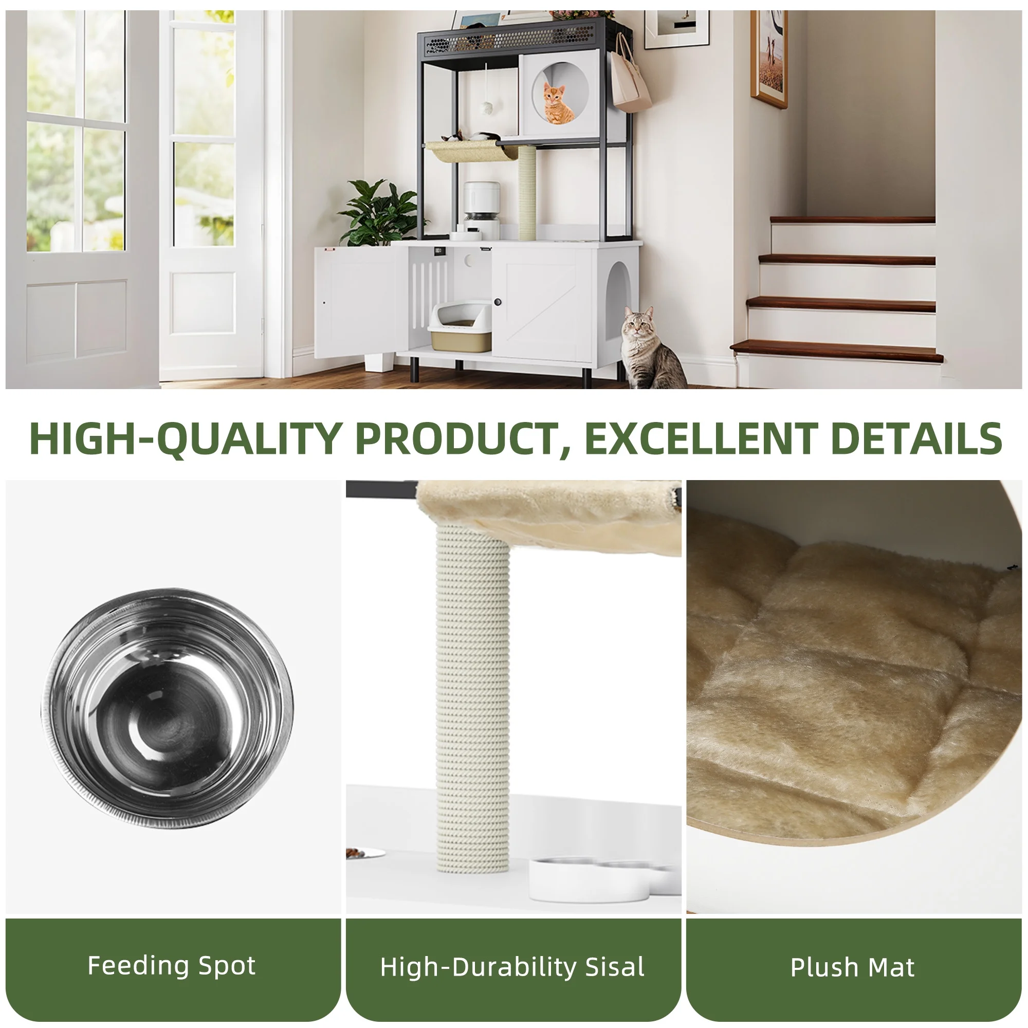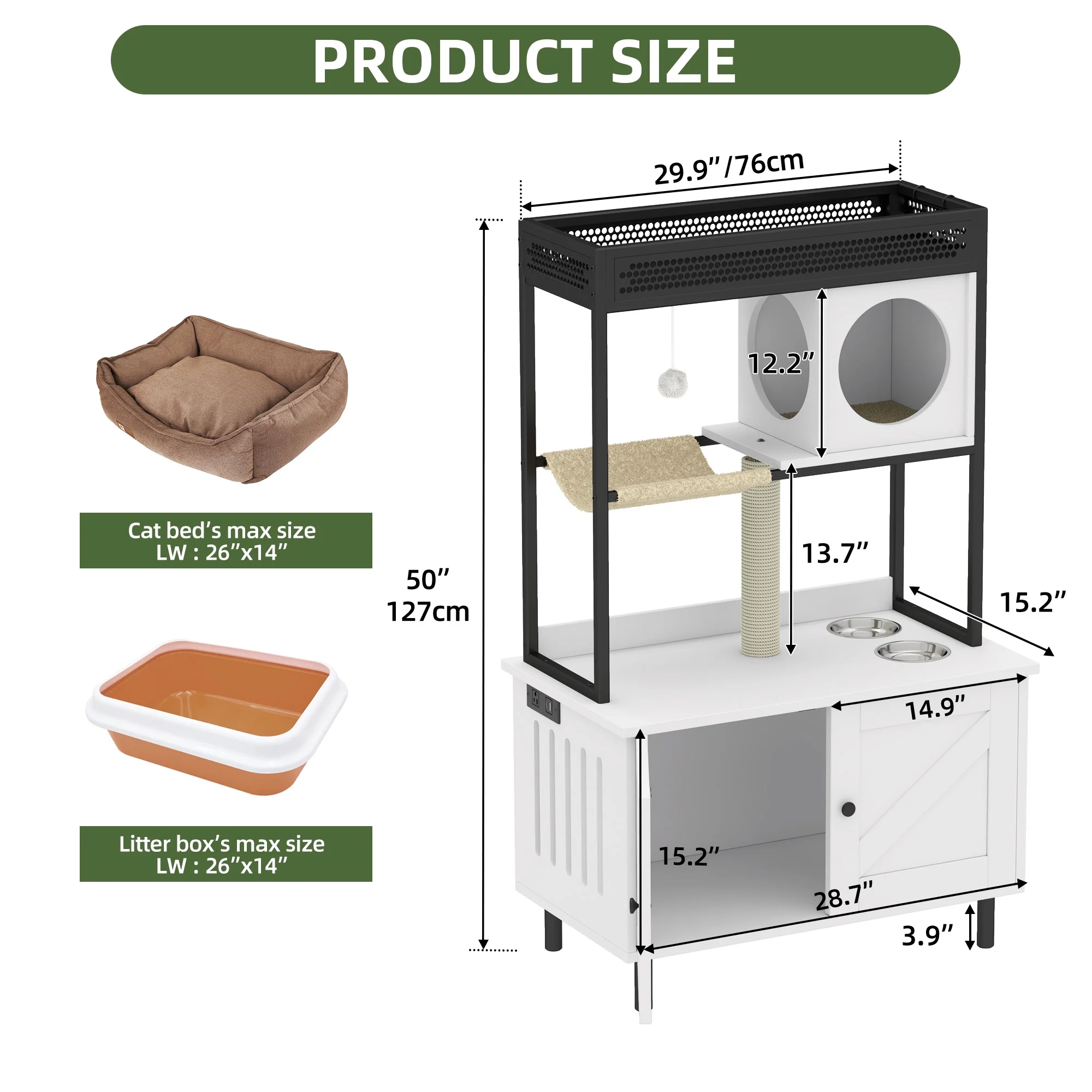 Easy Maintenance & Ventilation: The off-ground design makes cleaning underneath a breeze, while cutouts on the sides enhance ventilation, keeping the space fresh. Clear, labeled parts and accessories make assembly quick. Sturdy & Durable Construction: Crafted from engineered wood and steel, this litter cabinet is designed for strength and durability. The adjustable feet ensure stability on any surface, making it a reliable piece for your home. Multi-Functional Cat Litter Box Enclosure: This cat litter cabinet features a cozy condo, hammock, sisal scratching post, and a comfortable cat mat bed. Ideal for litter boxes up to 26″L x 14″W, it offers a nice hideaway for your feline friend. Versatile Storage Space: With a spacious top shelf, two side hooks, and a large tabletop, this cabinet provides ample storage for pet supplies. Simply place items into the two bowls, and you’re all set-conveniently organized in one place. Convenient Power Options: Equipped with 1 USB port, 1 Type-C, and 1 AC outlet on the left side, this cabinet offers easy charging options for pet gadgets or accessories, keeping everything powered up and organized.