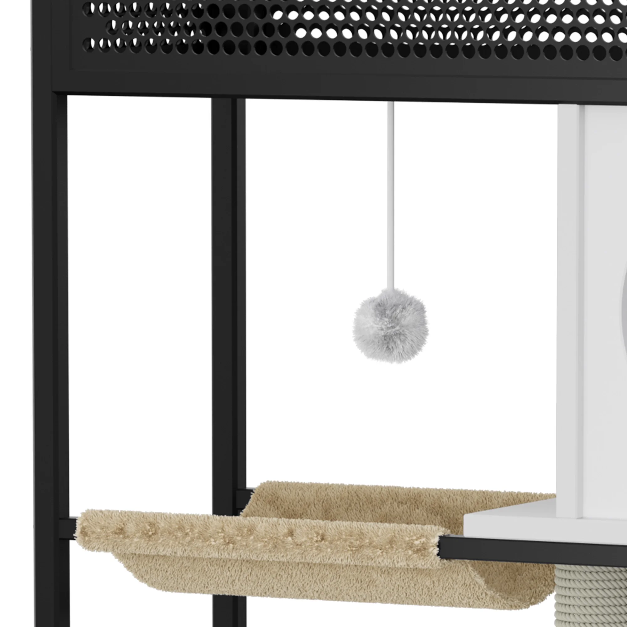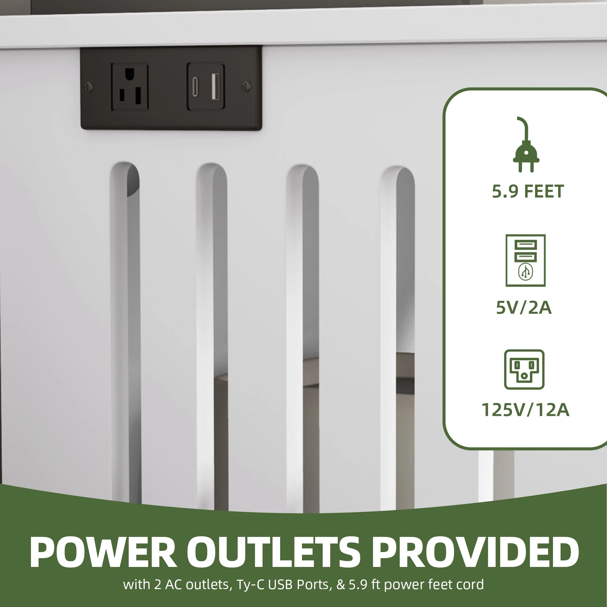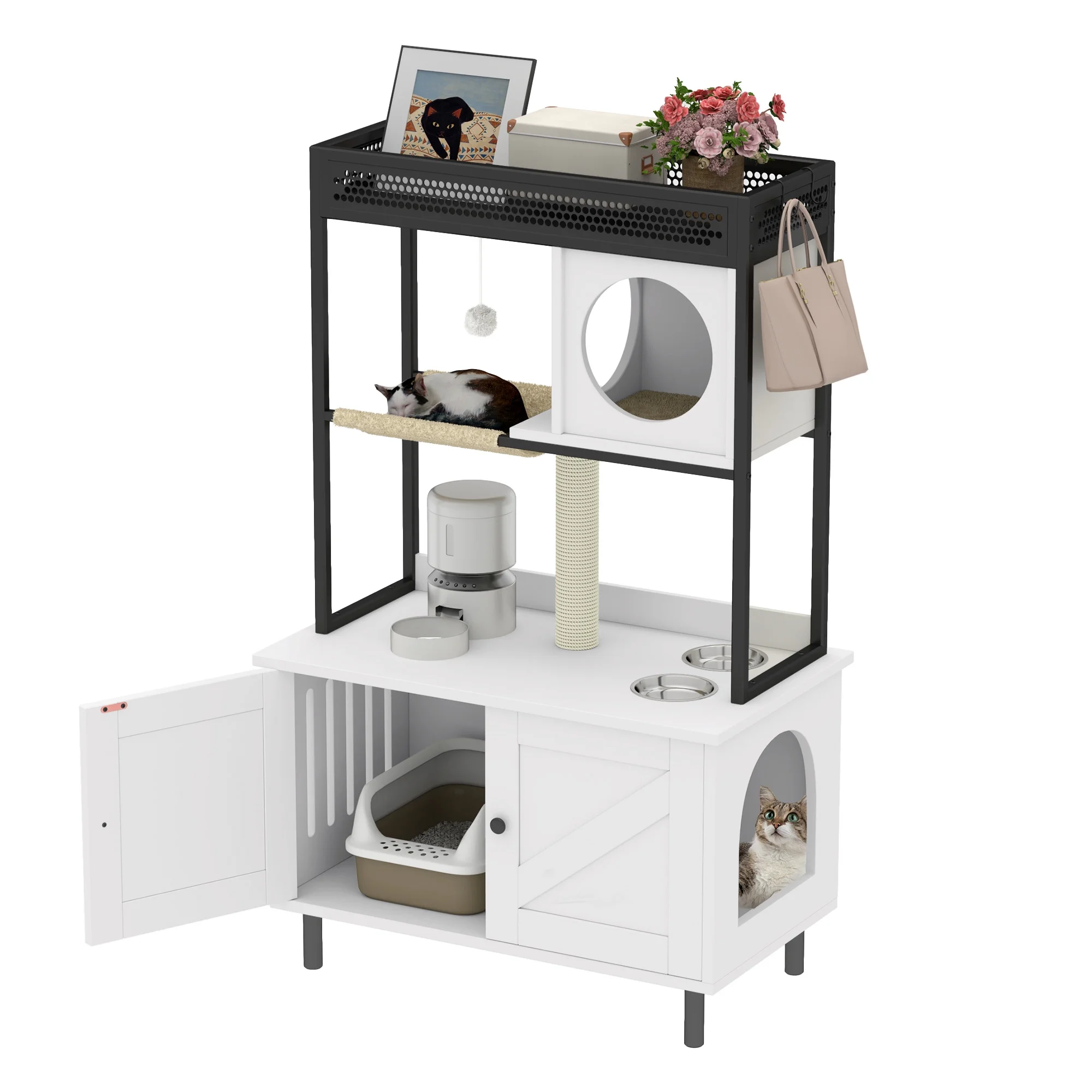 Easy Maintenance & Ventilation: The off-ground design makes cleaning underneath a breeze, while cutouts on the sides enhance ventilation, keeping the space fresh. Clear, labeled parts and accessories make assembly quick. Sturdy & Durable Construction: Crafted from engineered wood and steel, this litter cabinet is designed for strength and durability. The adjustable feet ensure stability on any surface, making it a reliable piece for your home. Multi-Functional Cat Litter Box Enclosure: This cat litter cabinet features a cozy condo, hammock, sisal scratching post, and a comfortable cat mat bed. Ideal for litter boxes up to 26″L x 14″W, it offers a nice hideaway for your feline friend. Versatile Storage Space: With a spacious top shelf, two side hooks, and a large tabletop, this cabinet provides ample storage for pet supplies. Simply place items into the two bowls, and you’re all set-conveniently organized in one place. Convenient Power Options: Equipped with 1 USB port, 1 Type-C, and 1 AC outlet on the left side, this cabinet offers easy charging options for pet gadgets or accessories, keeping everything powered up and organized.