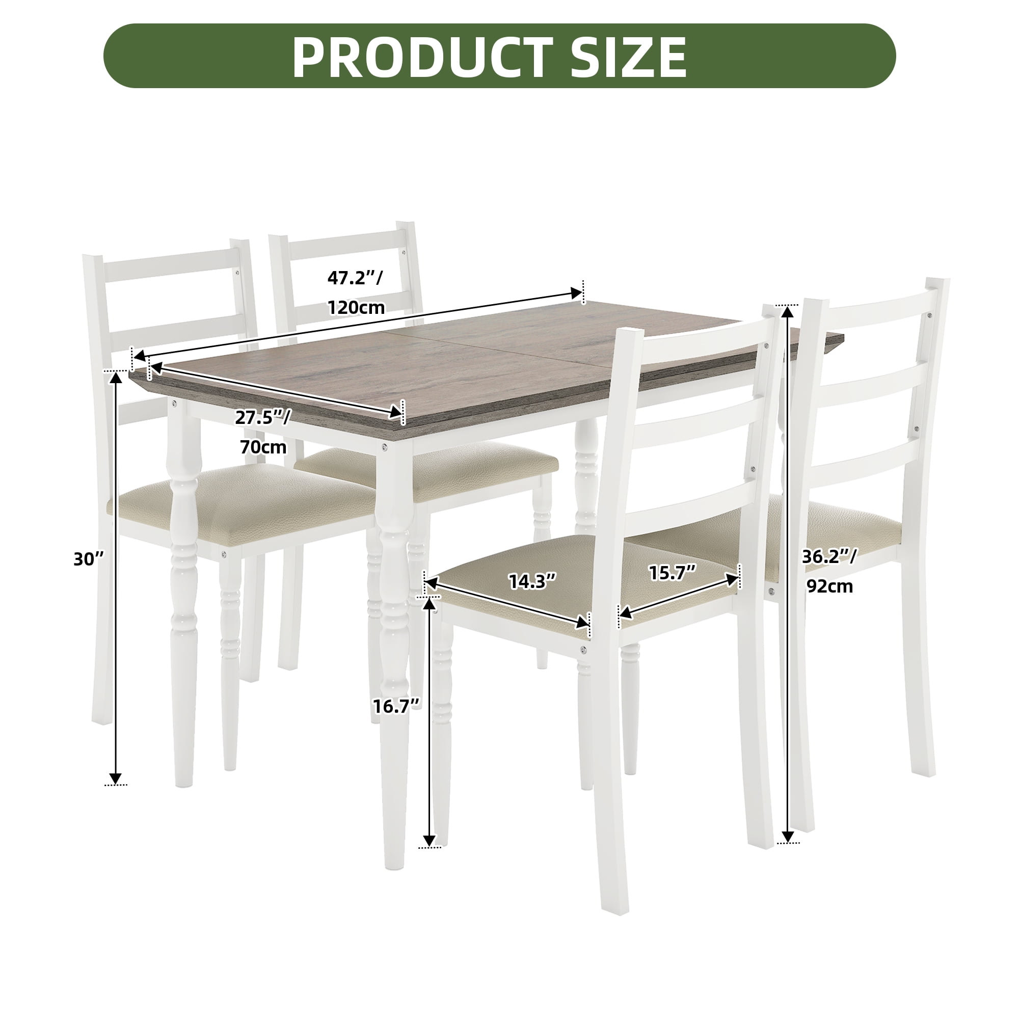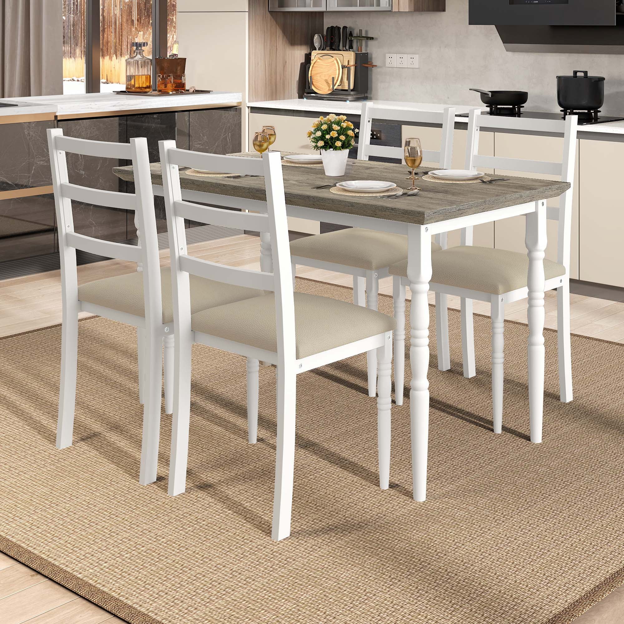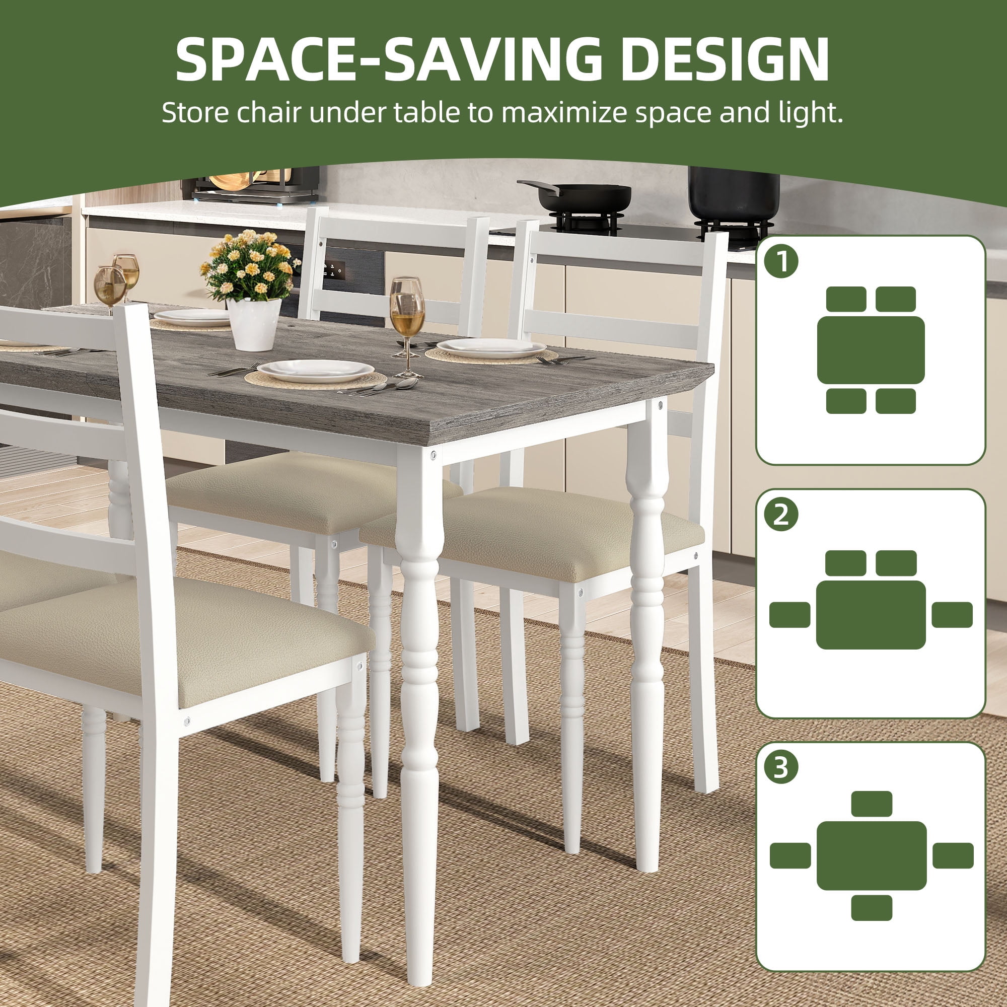 Nobility Style Charm: The Roman-column-inspired legs aren’t just for looks, they add a touch of elegance and nobility style to your dining area. No matter your vibe, this set brings a classy, polished look that makes every meal feel like a special occasion. Sit in Comfort: Say goodbye to uncomfortable meals. With cushioned, wide seats and a high backrest that cradles your back, you’ll find yourself enjoying those long dinners and endless chats without shifting around for comfort. Dining has never felt this good. Quick Setup: You’ll have this dining table and chairs set up and ready for dinner before your takeout arrives. Easy instructions, no tools drama, and everything fits just right so you can get straight to the fun part. Built to Last: You’ll love how sturdy this set feels. The strong metal frame and moisture-proof wood top are made for real life, easy to wipe down after spills, with chairs that feel solid and comfy every time you sit down. This set’s got staying power. Space-saving Dining Table Set: This 5-piece dining set is a game-changer for your space. When you’re not using it, the chairs slide right under the table, giving you extra room to stretch out. Great for creating a comfy, organized dining nook in any cozy corner. Recommended_location: Dining Room