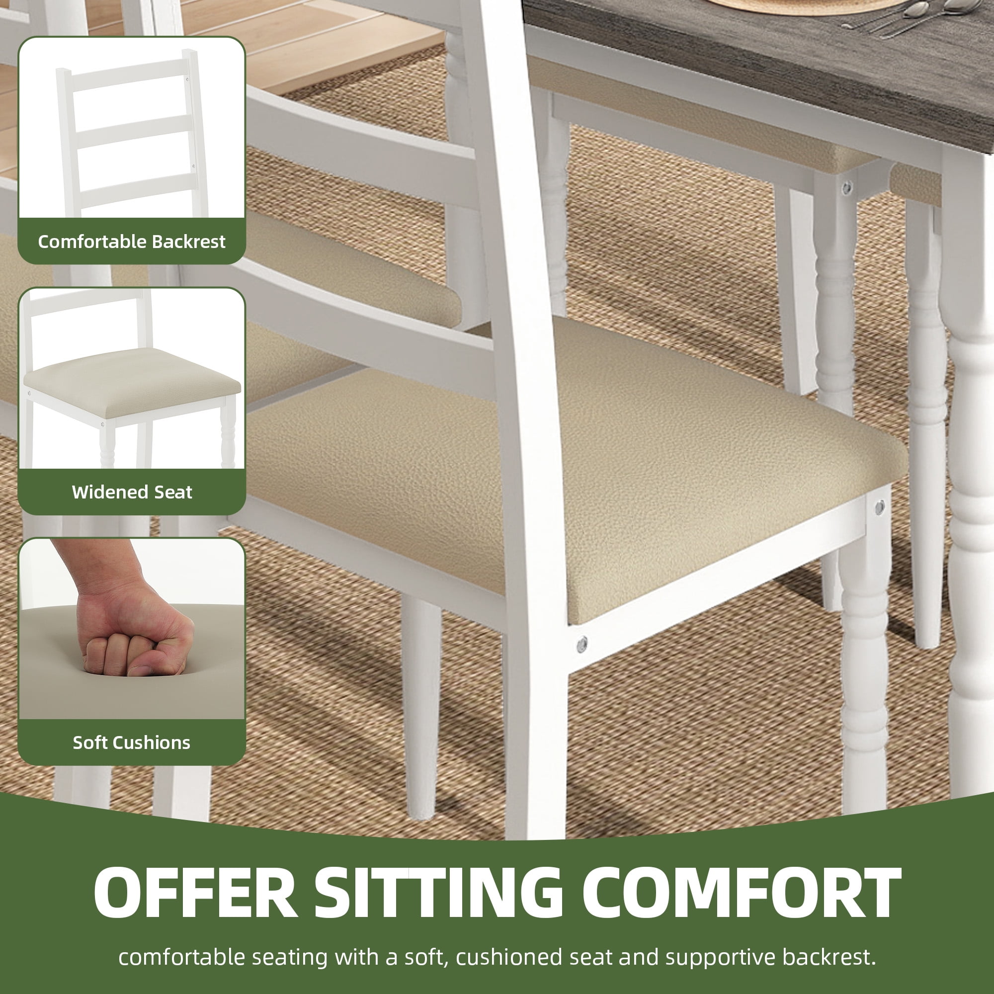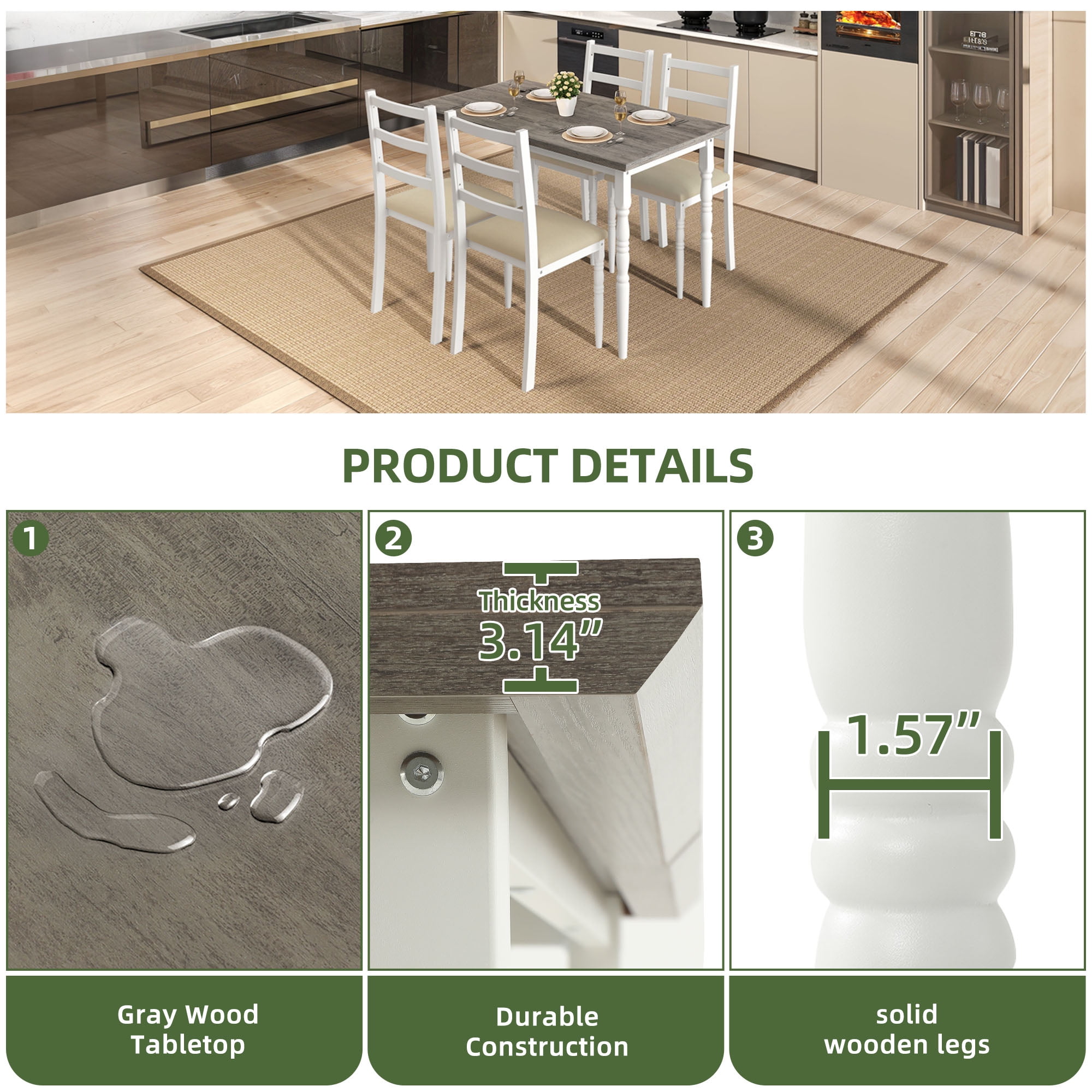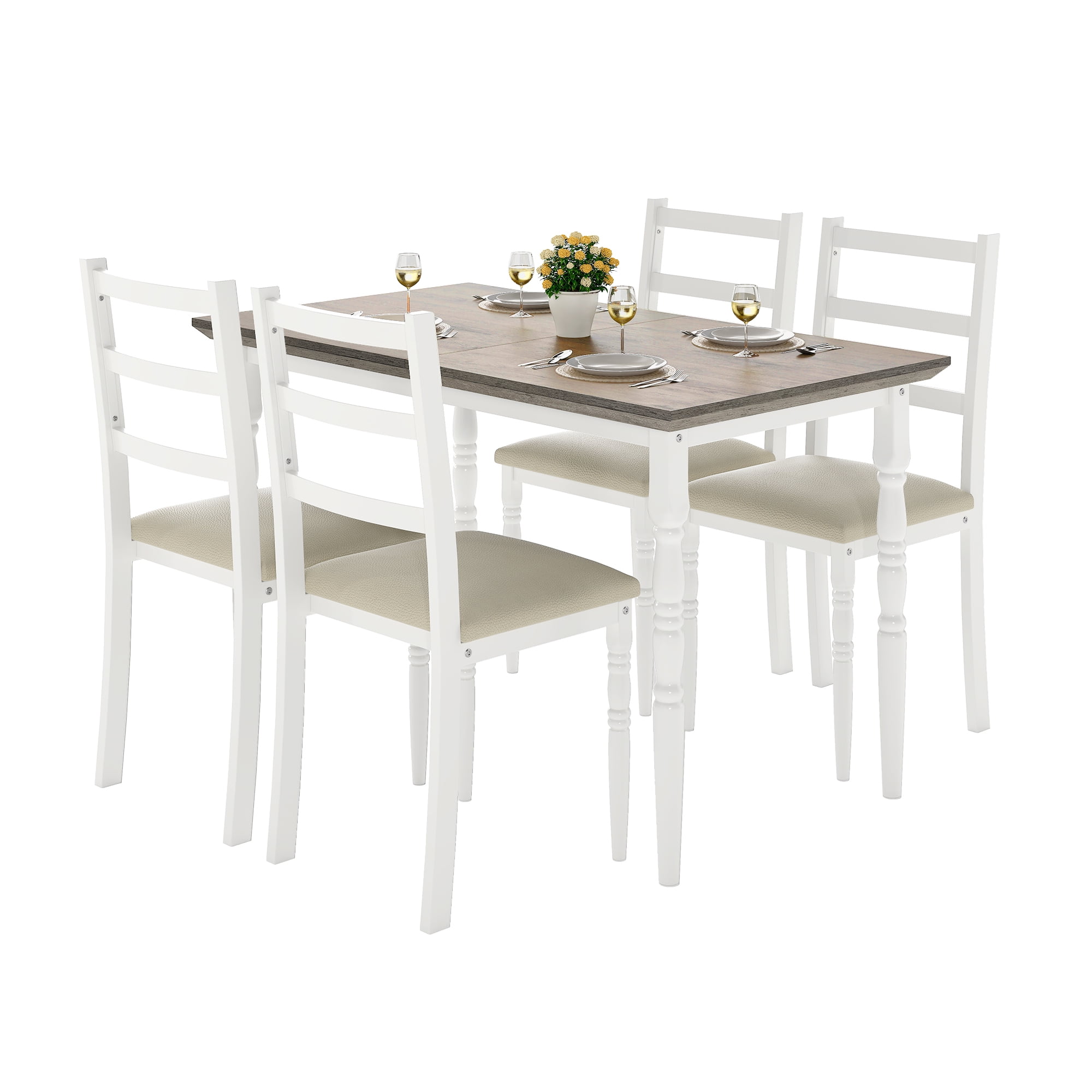 Nobility Style Charm: The Roman-column-inspired legs aren’t just for looks, they add a touch of elegance and nobility style to your dining area. No matter your vibe, this set brings a classy, polished look that makes every meal feel like a special occasion. Sit in Comfort: Say goodbye to uncomfortable meals. With cushioned, wide seats and a high backrest that cradles your back, you’ll find yourself enjoying those long dinners and endless chats without shifting around for comfort. Dining has never felt this good. Quick Setup: You’ll have this dining table and chairs set up and ready for dinner before your takeout arrives. Easy instructions, no tools drama, and everything fits just right so you can get straight to the fun part. Built to Last: You’ll love how sturdy this set feels. The strong metal frame and moisture-proof wood top are made for real life, easy to wipe down after spills, with chairs that feel solid and comfy every time you sit down. This set’s got staying power. Space-saving Dining Table Set: This 5-piece dining set is a game-changer for your space. When you’re not using it, the chairs slide right under the table, giving you extra room to stretch out. Great for creating a comfy, organized dining nook in any cozy corner. Recommended_location: Dining Room