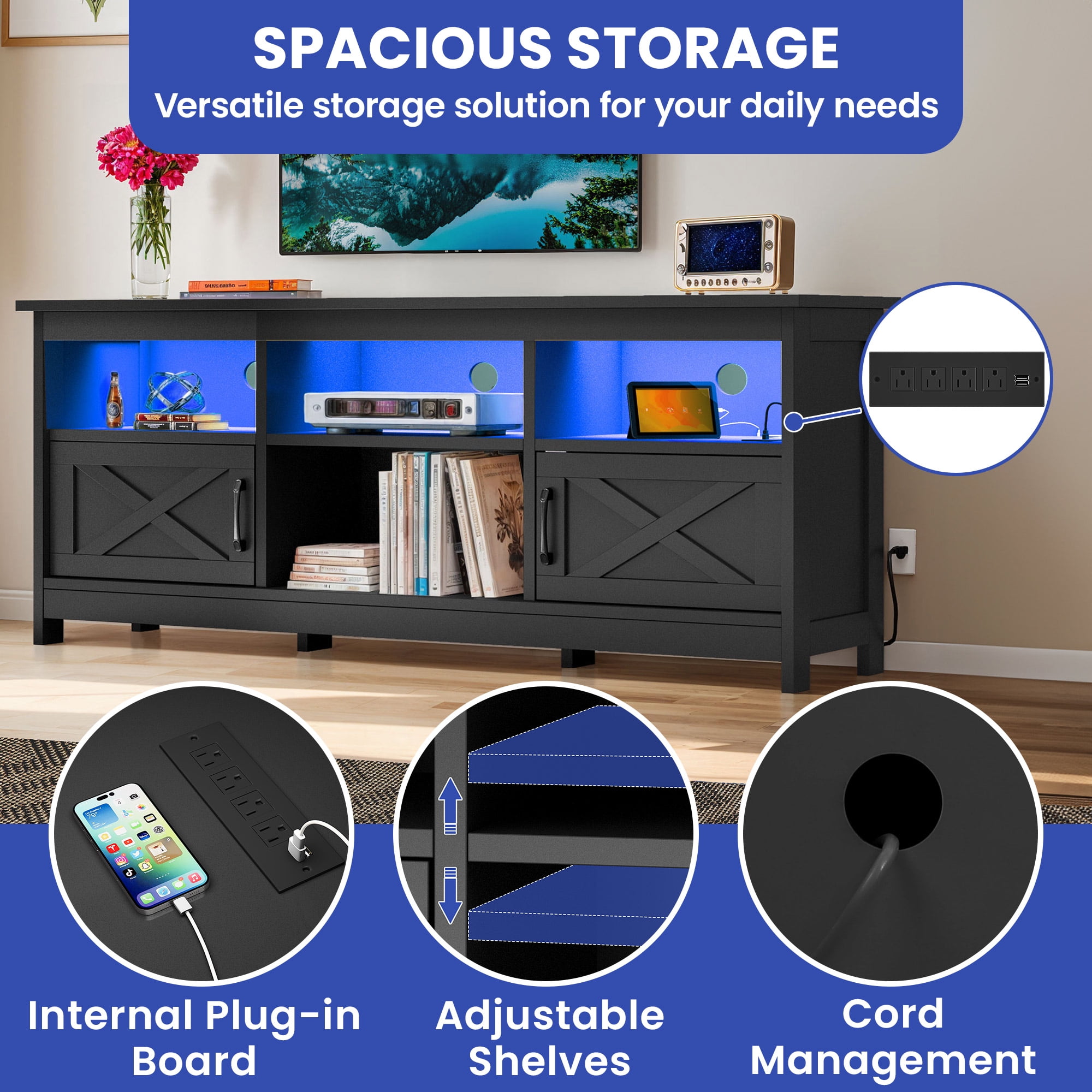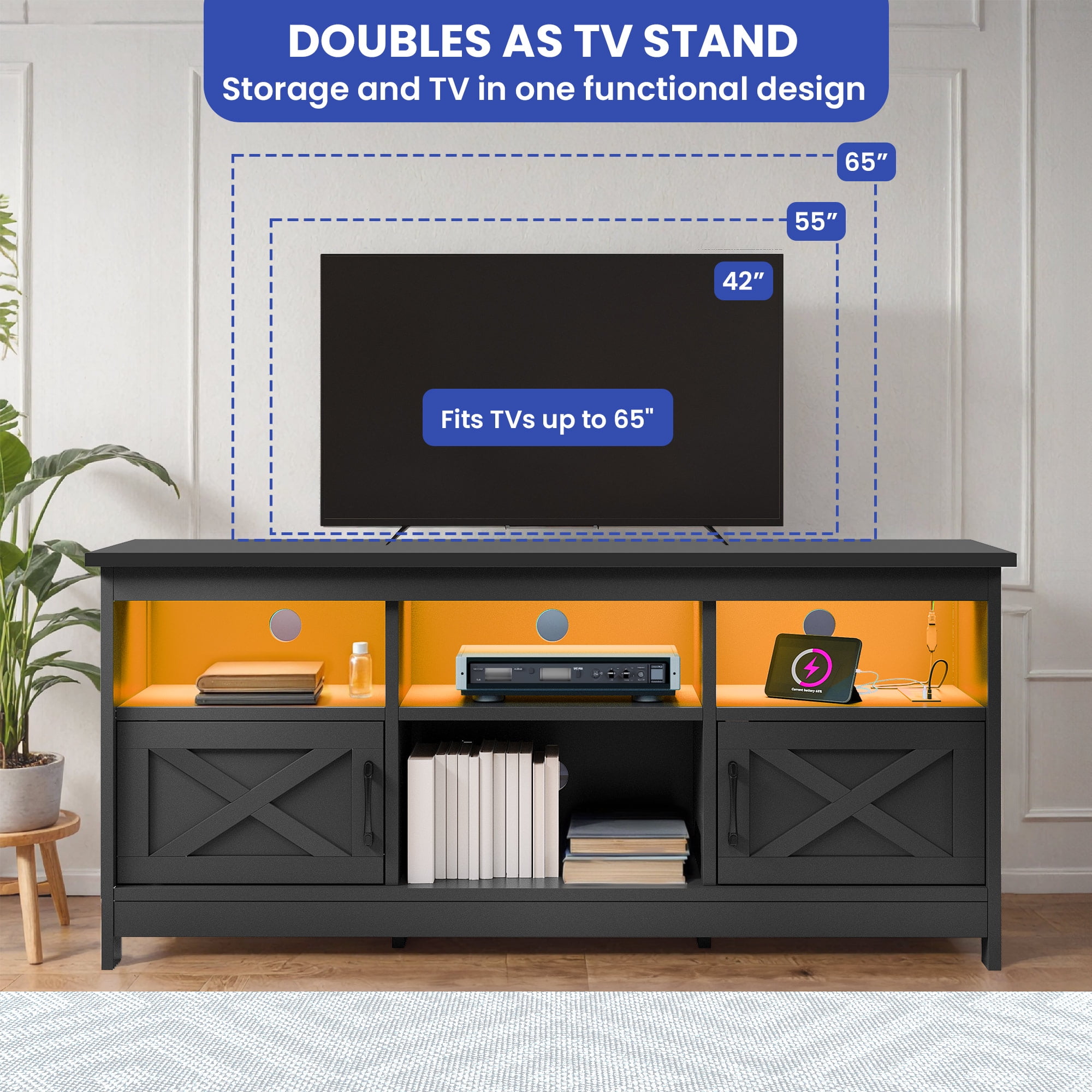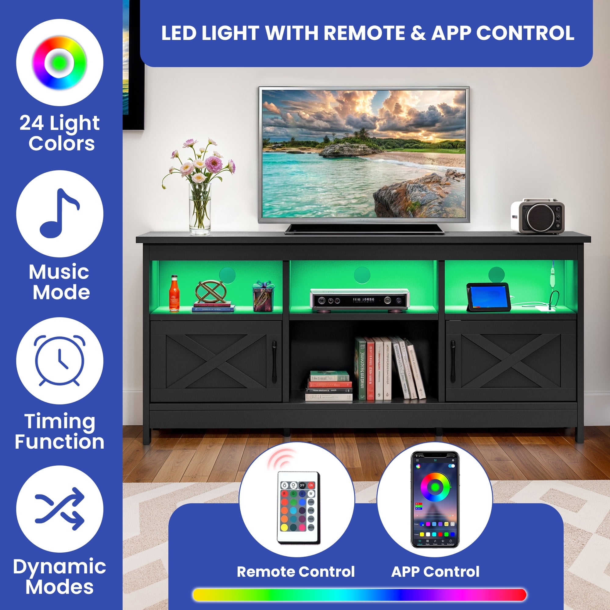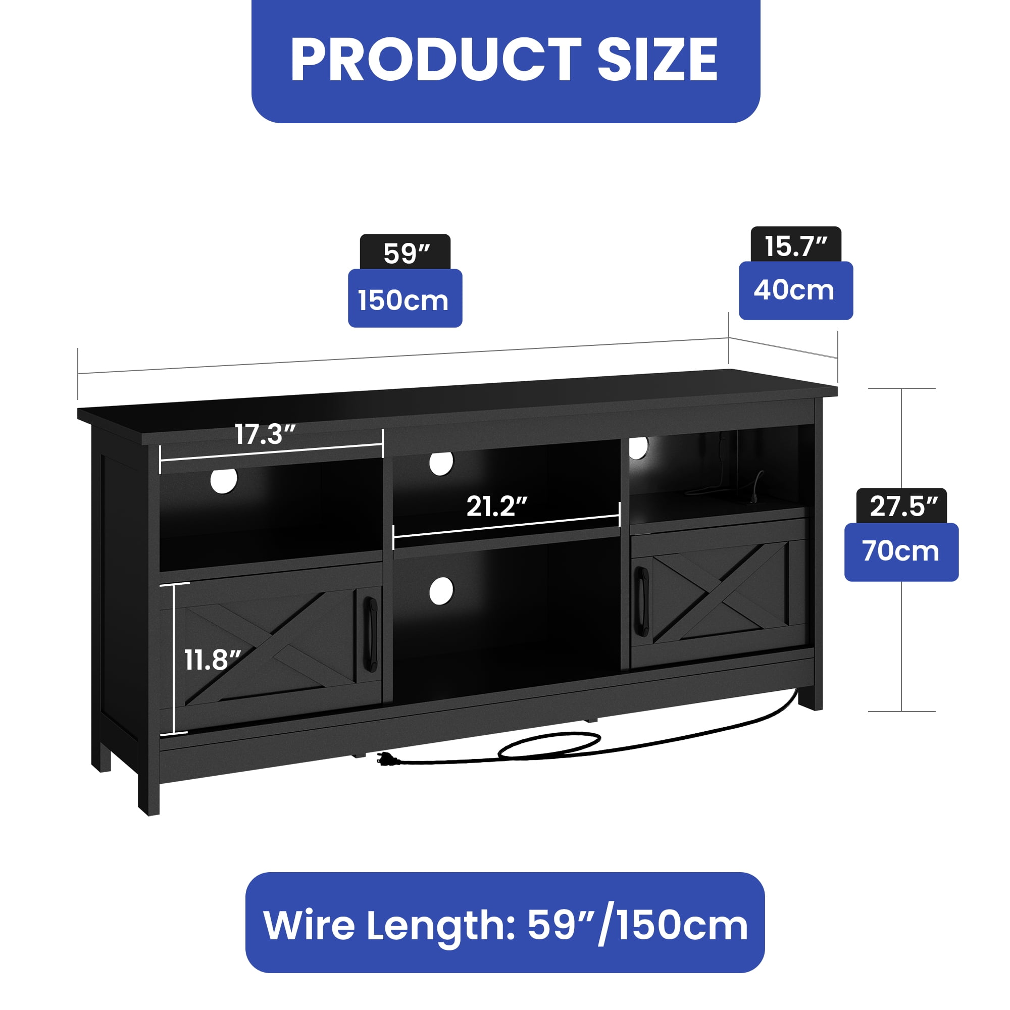 Product details Elevate your living room with this Farmhouse style TV stand, designed to accommodate TVs up to 65 inches. It features a 24-color LED light strip to bring a touch of modern elegance to your home. With spacious storage cabinets and open shelves, this stand is perfect for storing all your entertainment essentials. The easy installation of the door panels with magnetic closure ensures quiet operation. Enjoy the convenience of a built-in power strip and customizable storage options in a stylish and functional design. Specifications Color: Black Product Dimensions: 15.7″D x 59″W x 25.5″H Item Weight: 58 pounds Assembly Required: Yes