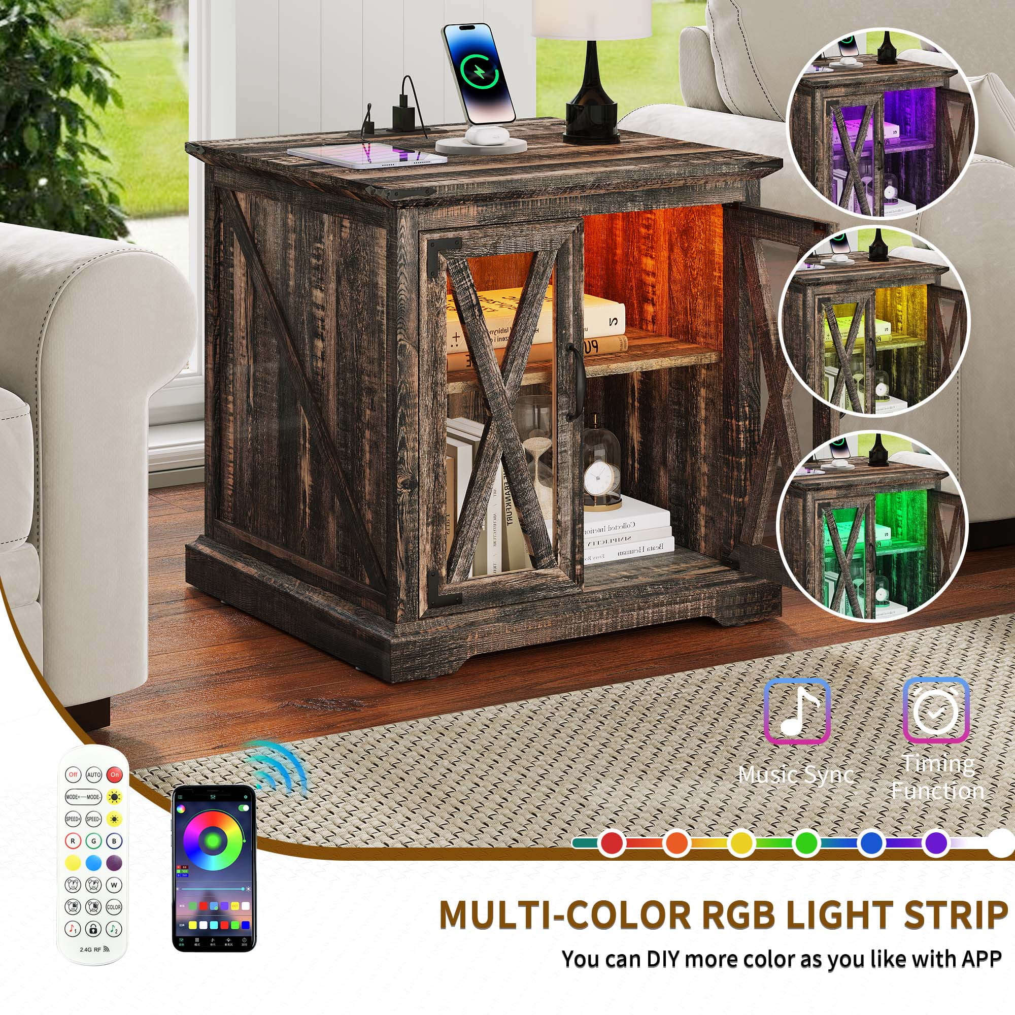 Uforic Farmhouse End Table with Power Outlets, Side Table Nightstand with LED Lights & Doors, Oak