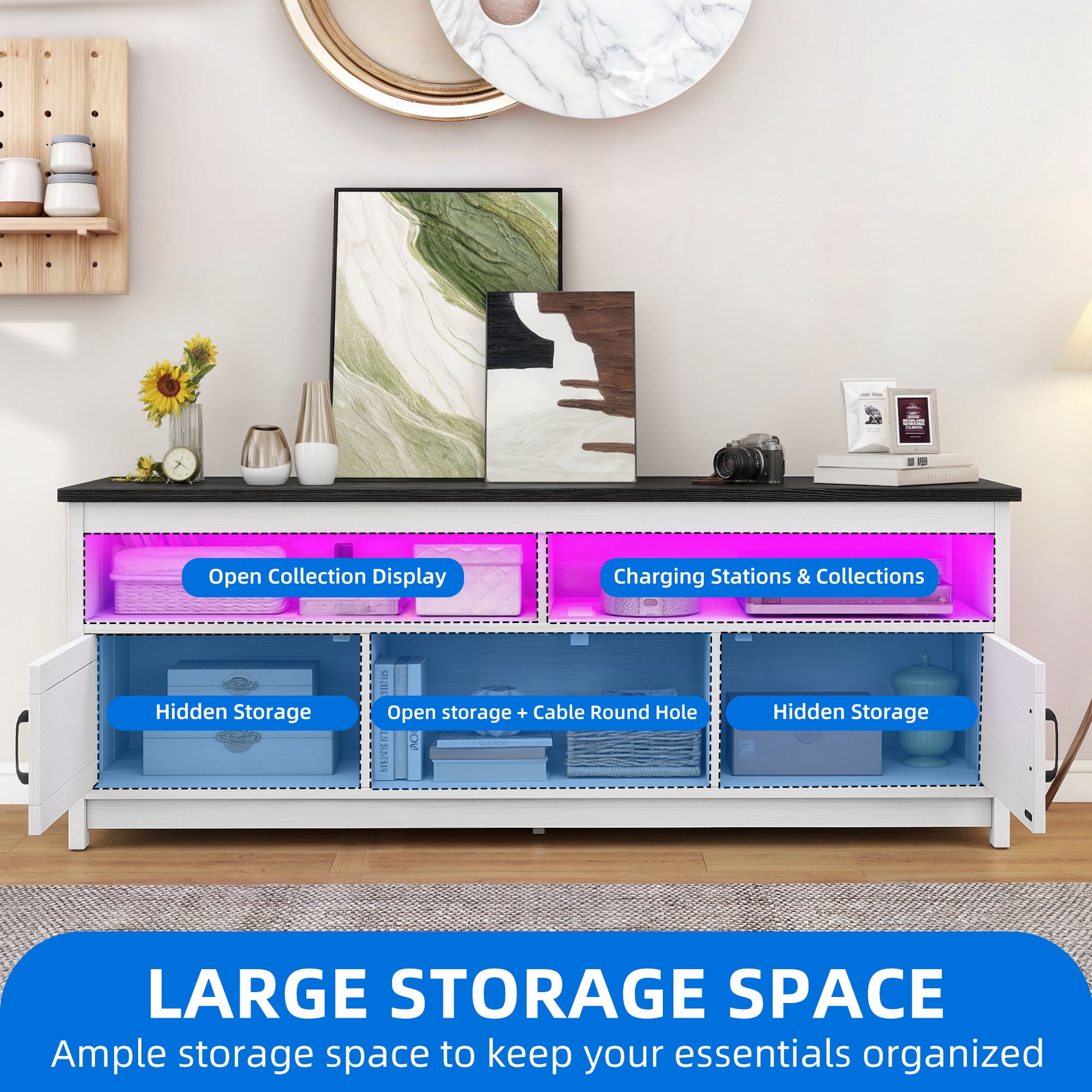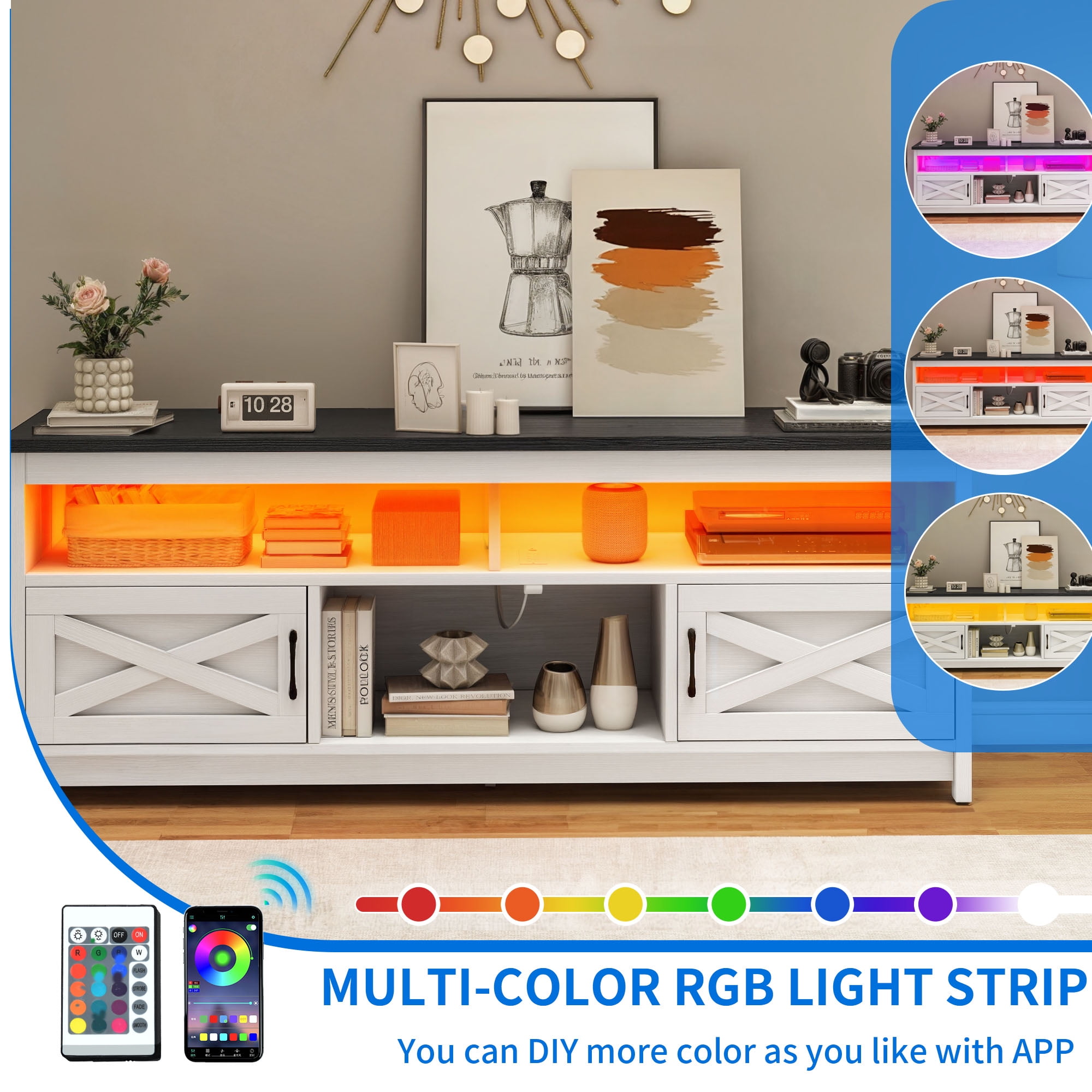 Uforic Farmhouse LED TV Stand with Power Outlet, Media Entertainment Center Console for 75 Inch TV, Black and White