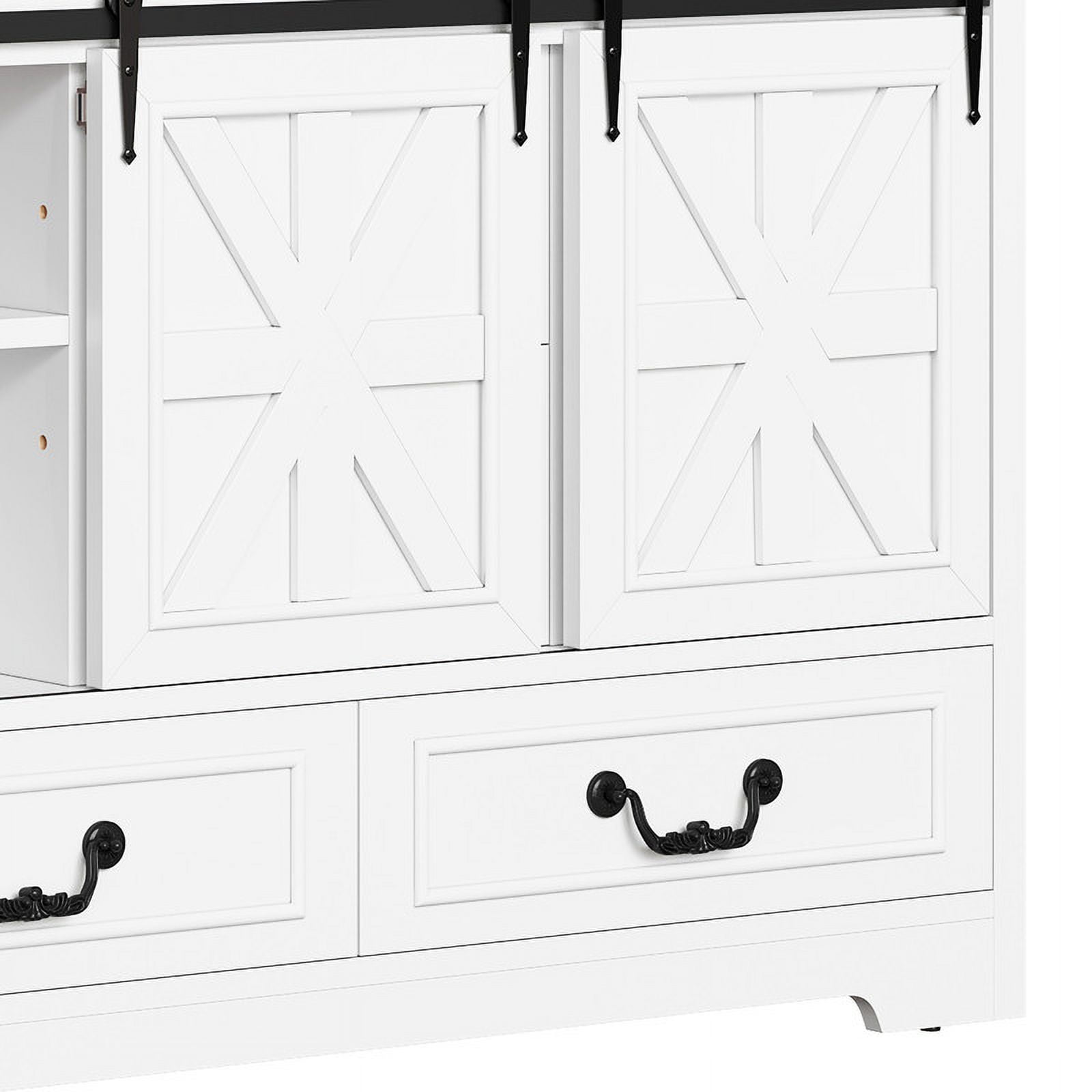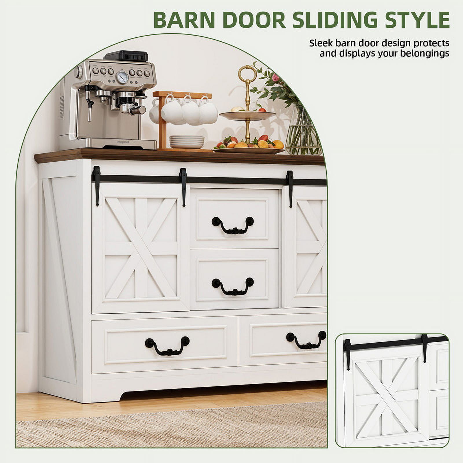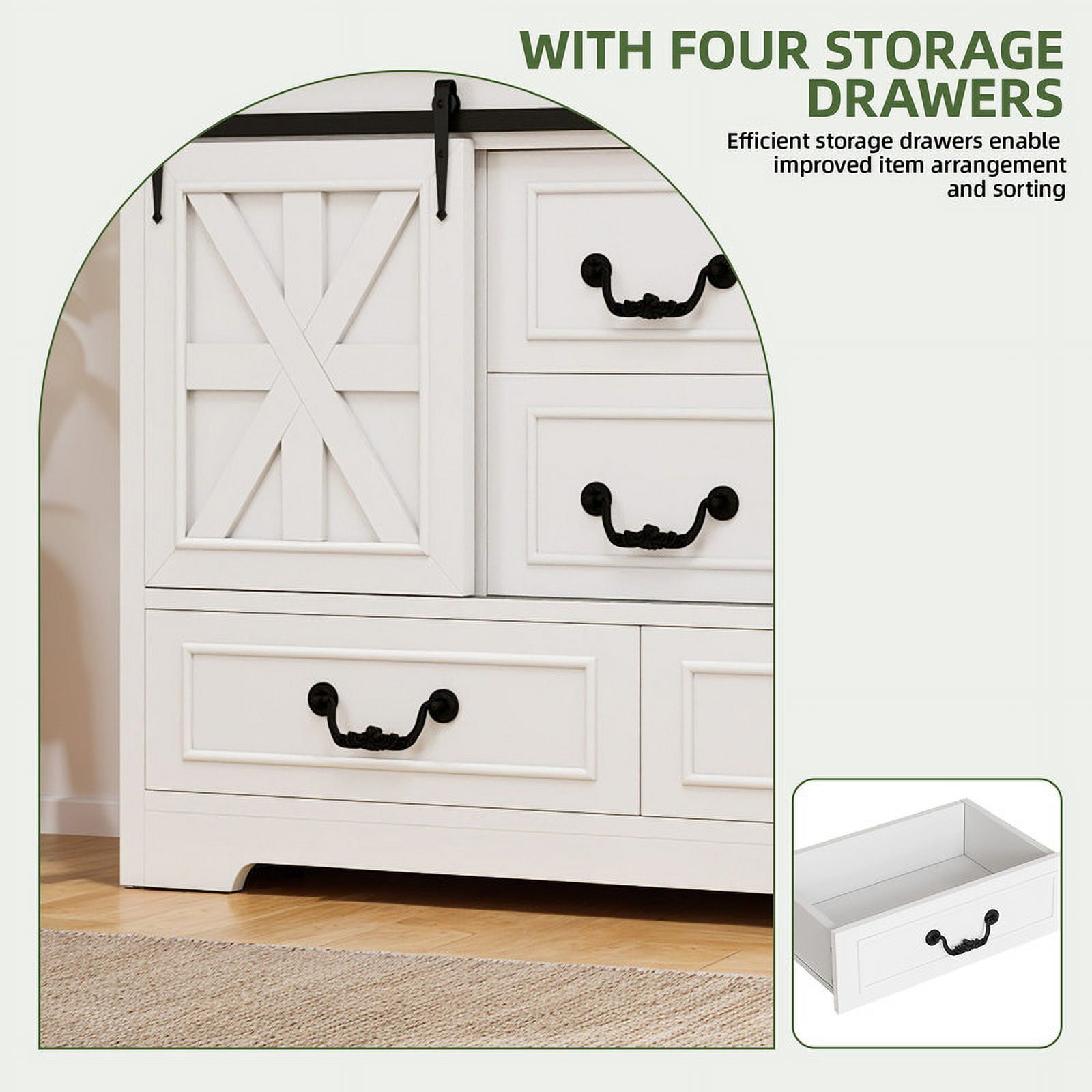 Storage Solutions Galore: This versatile cabinet boasts two sliding barn doors revealing adjustable shelves, plus four spacious drawers – great for tucking away clutter and placing this unit anywhere for maximum functionality. Versatile Charm for Any Room: Transform this cabinet into a chic coffee bar, a stylish TV stand, or elegant hallway storage. Its versatile design helps create a cozy, organized space where everything you need is within easy reach. Rustic Farmhouse Elegance: With its antique oak finish, charming X-bar accents, and vintage handles, this cabinet exudes a warm farmhouse vibe. It’s the right piece to add rustic charm and timeless elegance to any room in your home. Built to Stand Regular Use: Crafted from sturdy engineered wood, it is built to last. Adjustable feet and an non-tipping kit provide added stability and peace of mind, even for the busiest households. Effortless Assembly, Instant Style: Say goodbye to complicated instructions! This sideboard cabinet is a breeze to assemble with clear directions and a complete accessory kit. You’ll be enjoying your new favorite piece in no time.