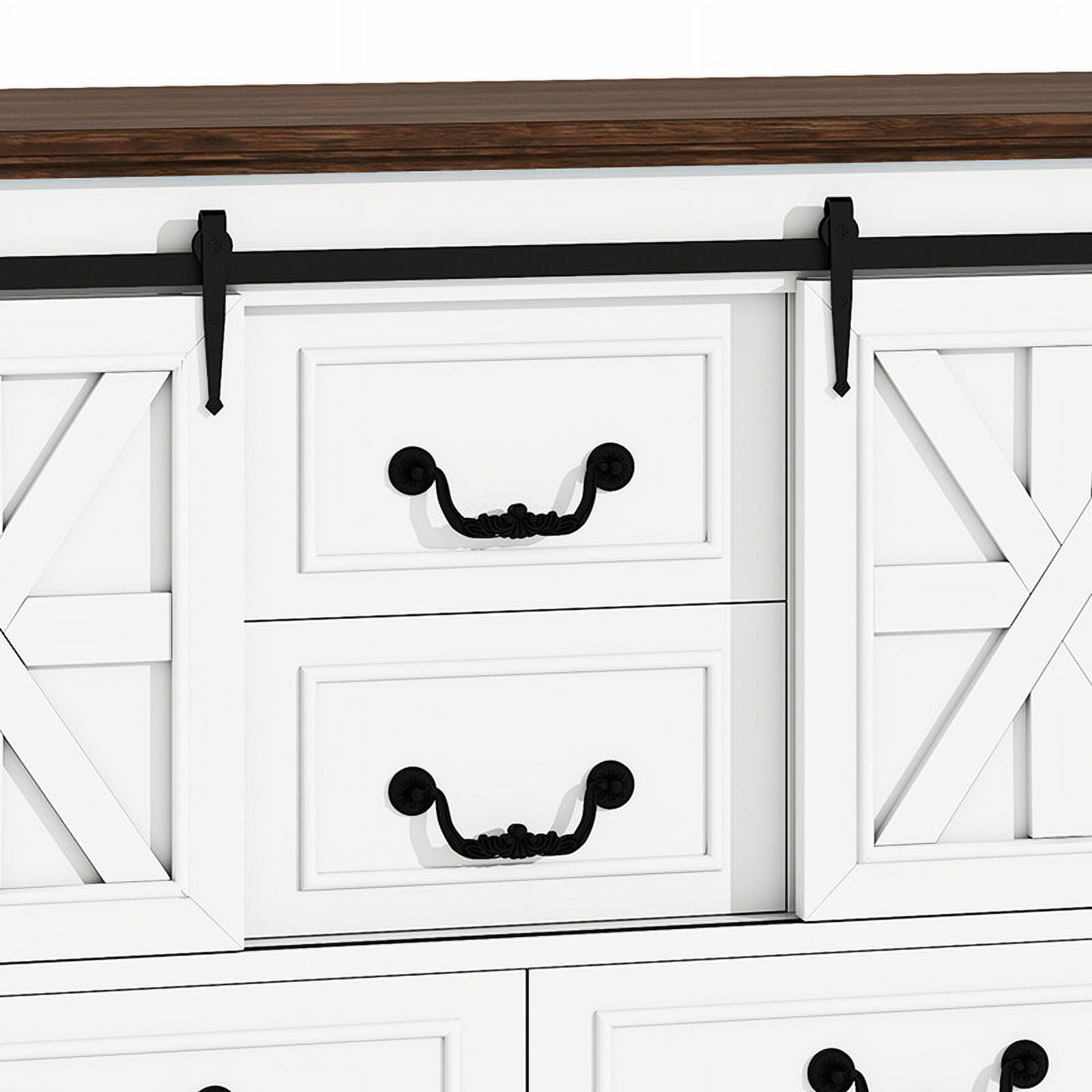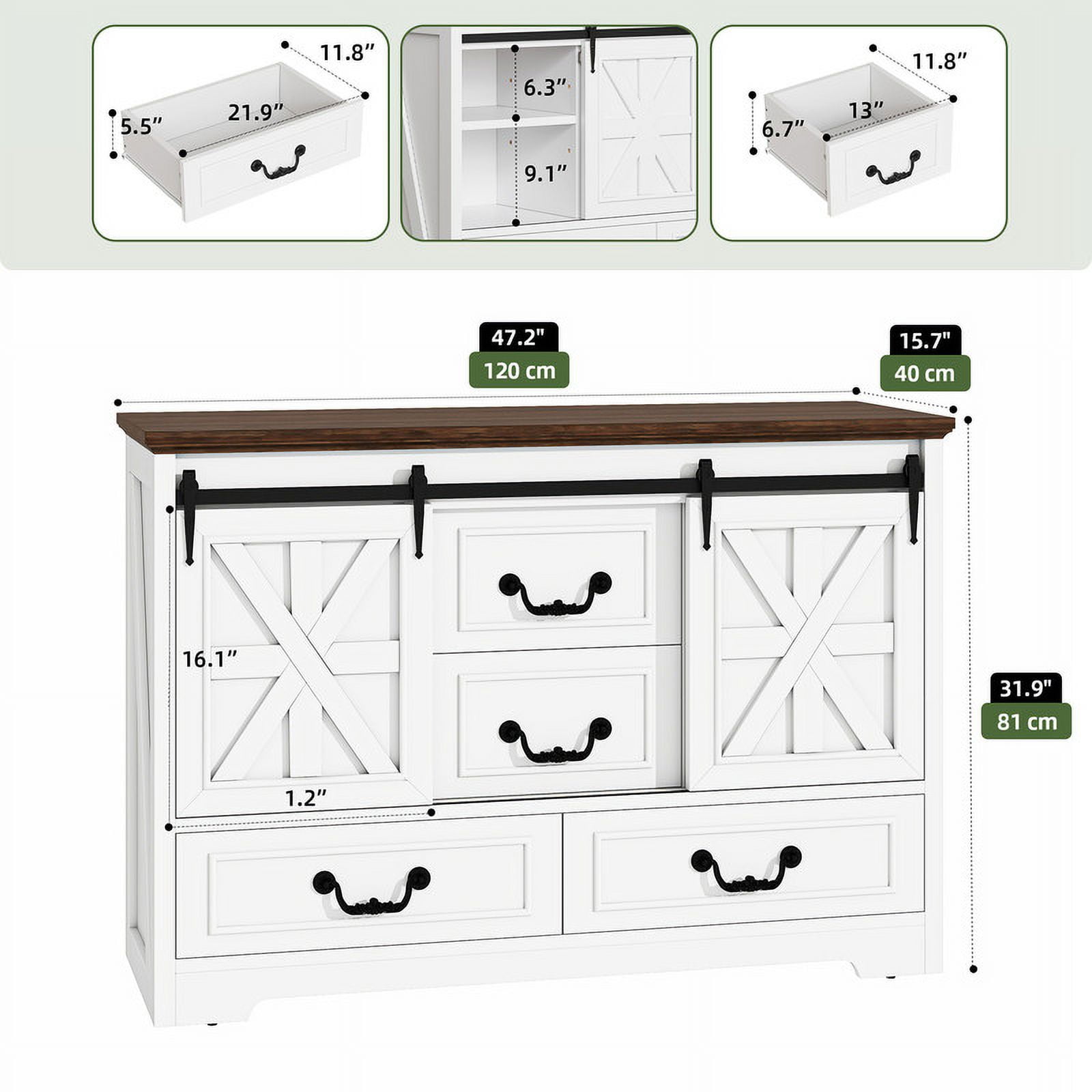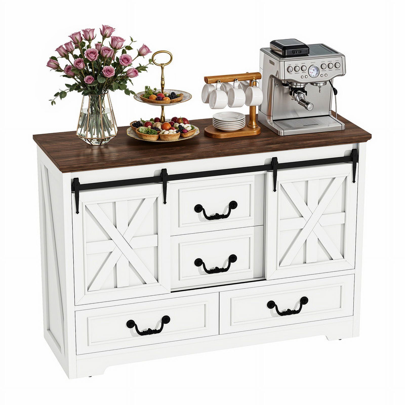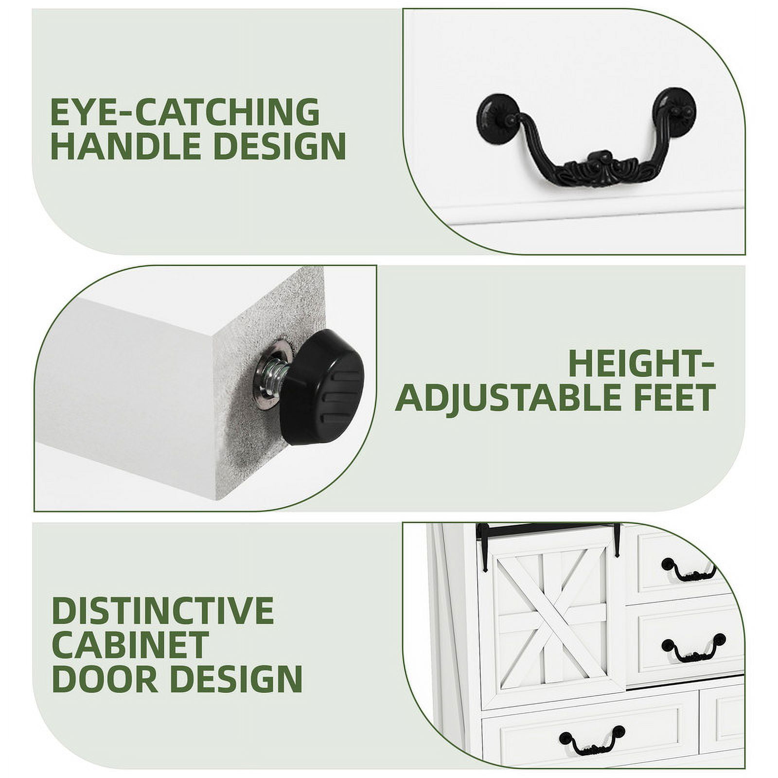 Storage Solutions Galore: This versatile cabinet boasts two sliding barn doors revealing adjustable shelves, plus four spacious drawers – great for tucking away clutter and placing this unit anywhere for maximum functionality. Versatile Charm for Any Room: Transform this cabinet into a chic coffee bar, a stylish TV stand, or elegant hallway storage. Its versatile design helps create a cozy, organized space where everything you need is within easy reach. Rustic Farmhouse Elegance: With its antique oak finish, charming X-bar accents, and vintage handles, this cabinet exudes a warm farmhouse vibe. It’s the right piece to add rustic charm and timeless elegance to any room in your home. Built to Stand Regular Use: Crafted from sturdy engineered wood, it is built to last. Adjustable feet and an non-tipping kit provide added stability and peace of mind, even for the busiest households. Effortless Assembly, Instant Style: Say goodbye to complicated instructions! This sideboard cabinet is a breeze to assemble with clear directions and a complete accessory kit. You’ll be enjoying your new favorite piece in no time.