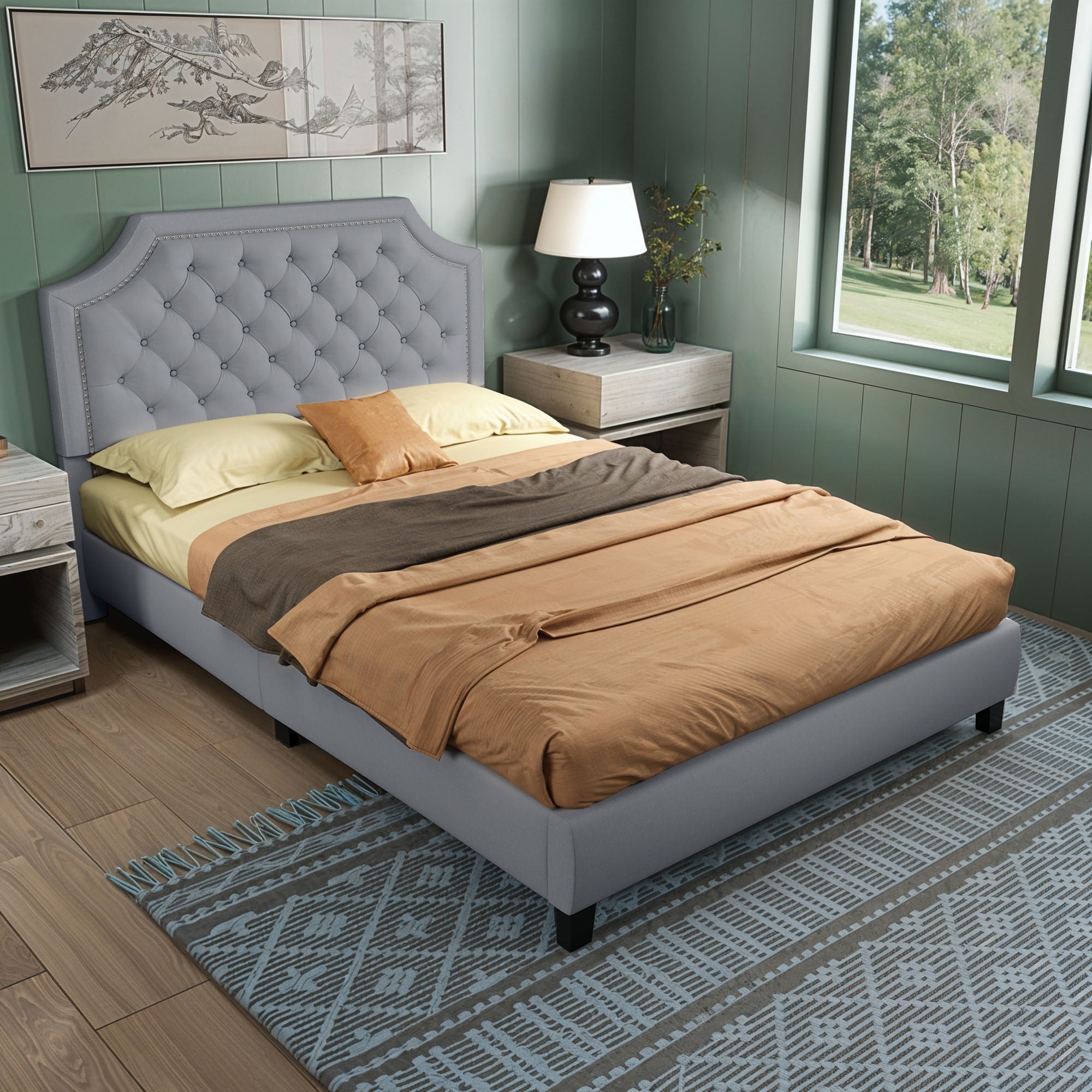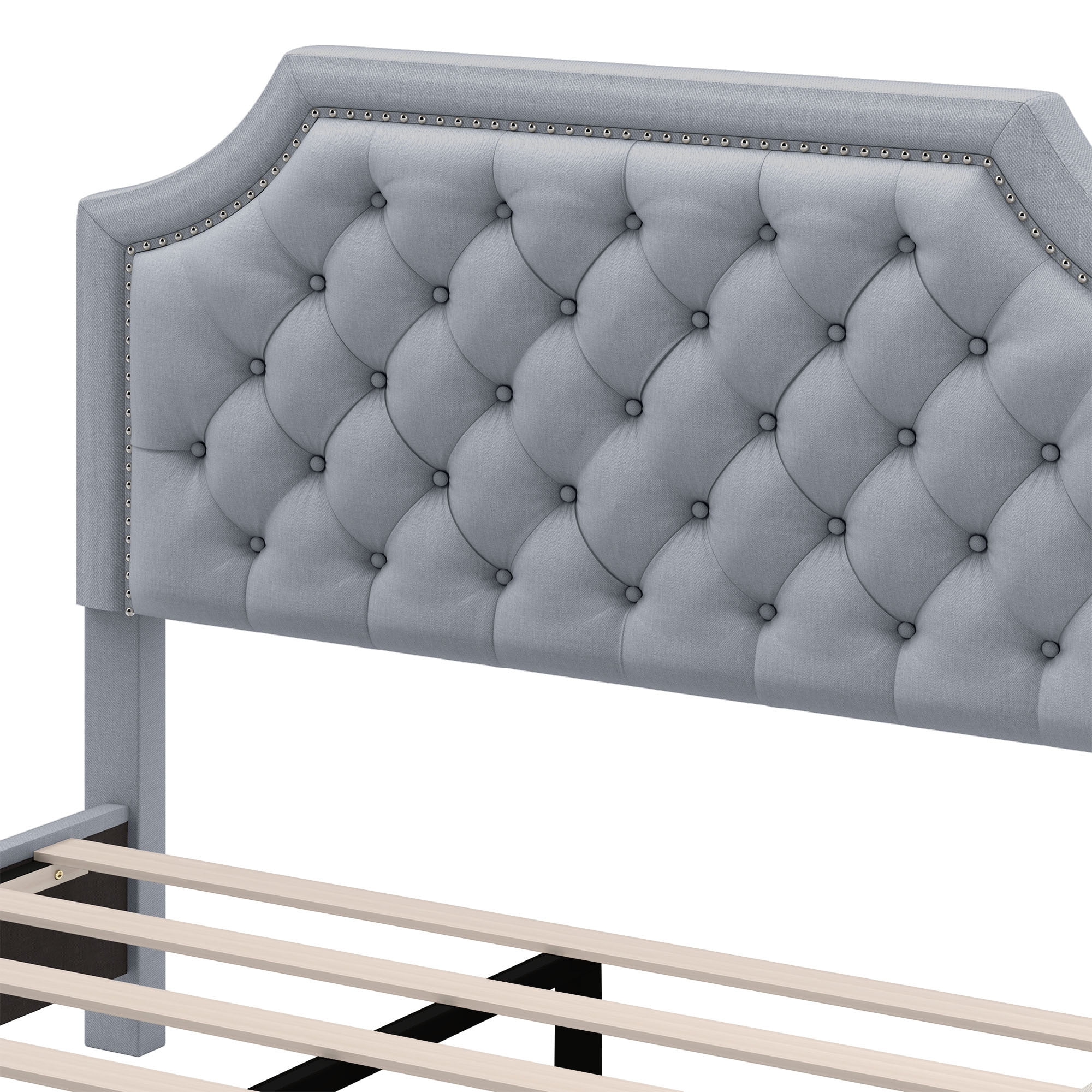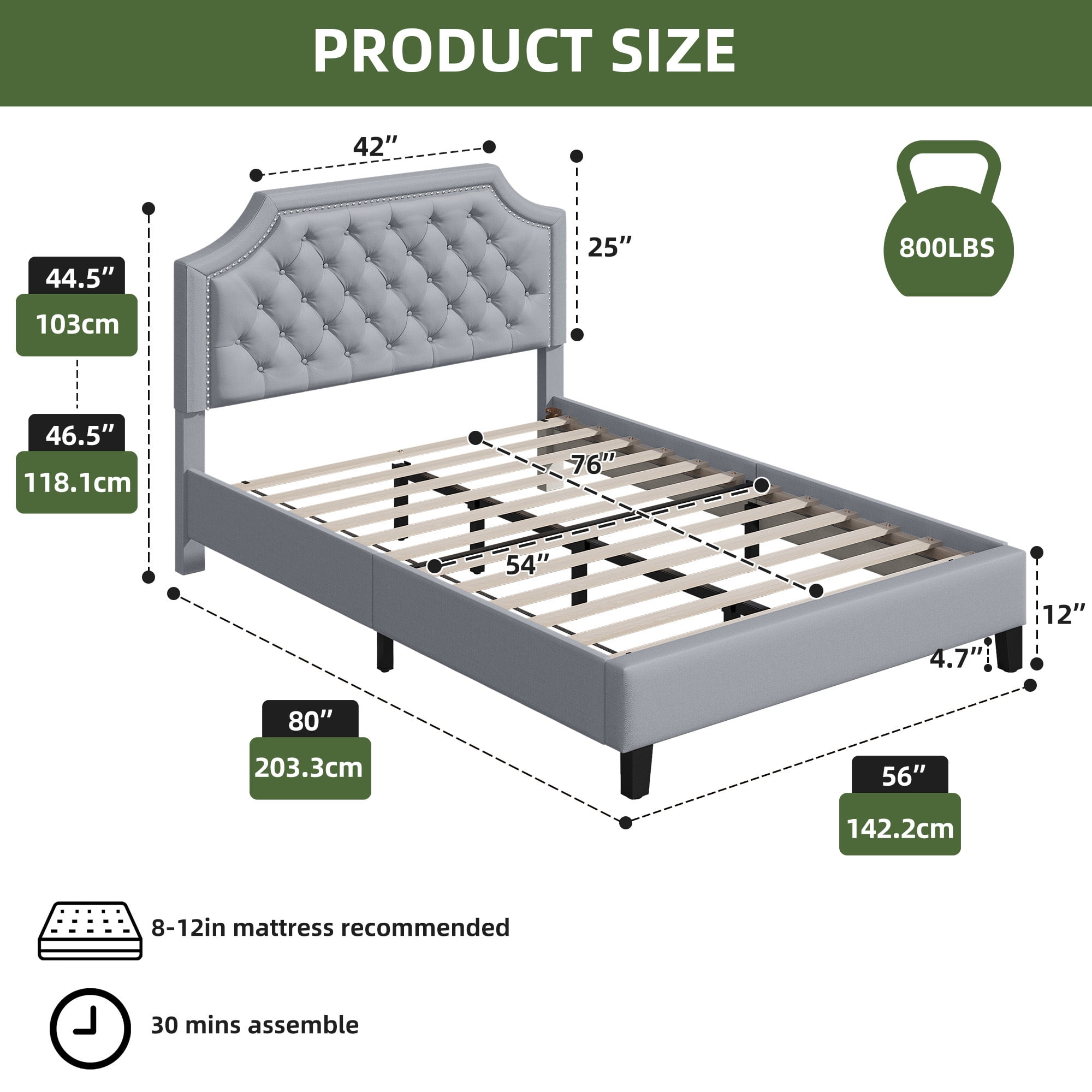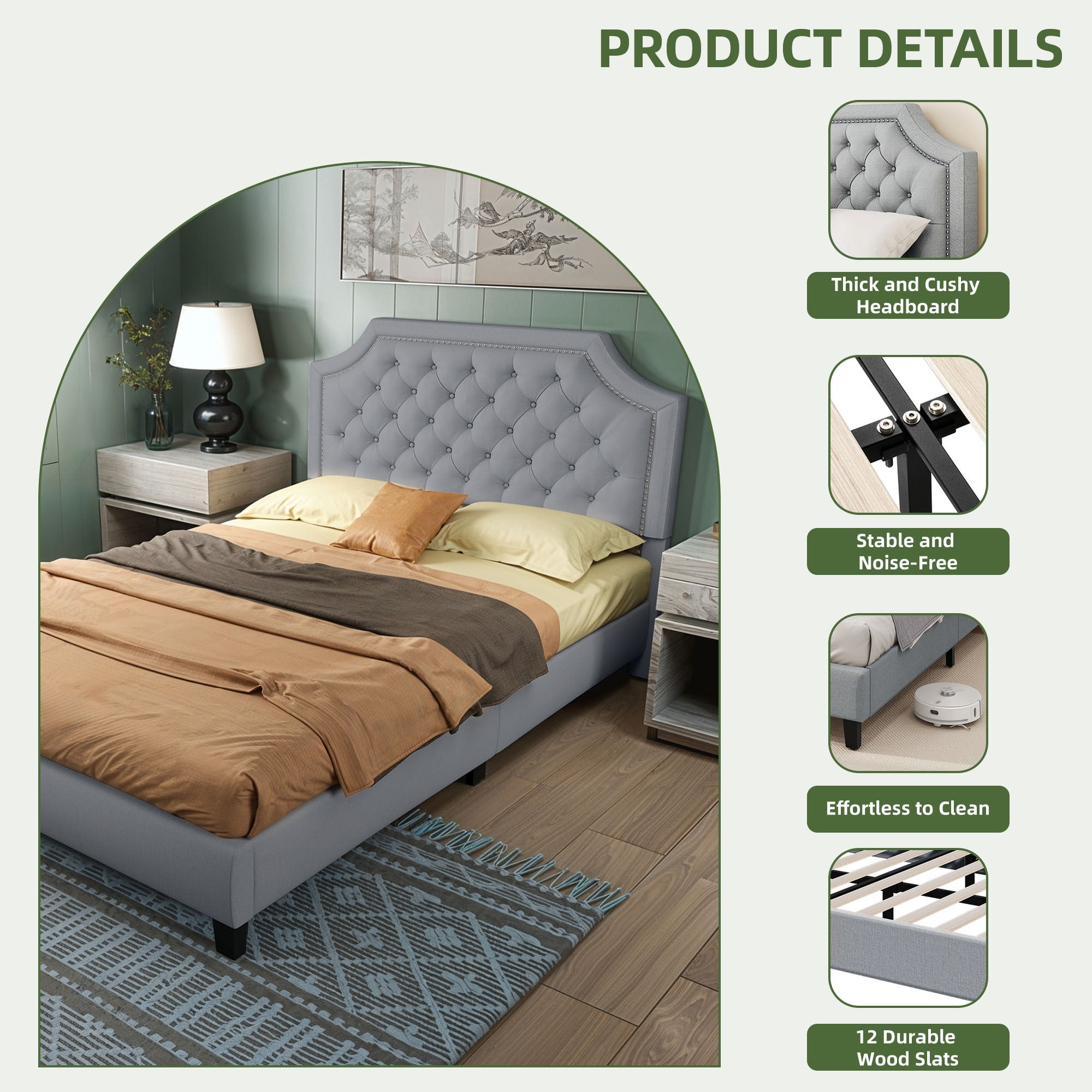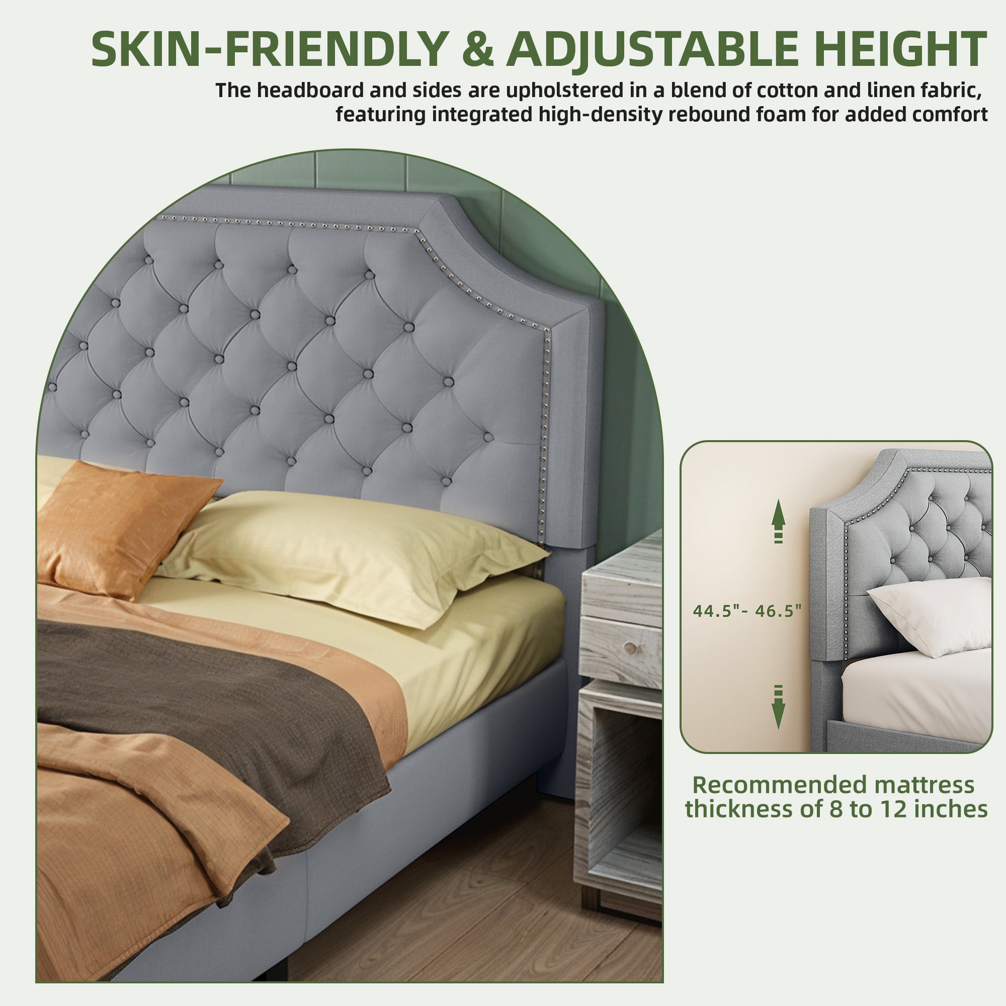 Versatile Height Adjustment: Our 2-Level Adjustable Headboard offers a customizable look with two height settings, ranging from 44.5 to 46.5 inches. This feature, along with its curved geometric design and tufted buttons, allows you to tailor the headboard to your aesthetic and comfort needs, with a recommended mattress height of 8-12 inches. Mattress Foundation Design: Designed to prevent mattress movement, our King size platform bed frame features a raised base border that securely holds the mattress in place. This eliminates the need for a box spring and ensures a safer and more peaceful night’s sleep. Roomy Dimensions and Weight Capacity: With dimensions of 85″W x 62″D x 44.5-46.5″H, our upholstered bed frame is built to accommodate King size mattresses and supports a substantial weight capacity of up to 1200 lbs, making it both spacious and durable. Sturdy and Silent: Constructed with a combination of 2 wooden, 2 plastic, and 6 metal support legs, along with 12 solid wood slats that are securely screwed in place, our bed frame provides exceptional support and minimizes noise, ensuring a stable and quiet sleeping environment. Cotton and Linen Upholstery: The headboard and sides of the bed frame are elegantly wrapped in a blend of cotton and linen fabric, complemented by high-density rebound foam. This not only offers a comfortable and stylish appearance but also provides practical benefits such as resistance to friction, dirt, and reduced dust and hair absorption.