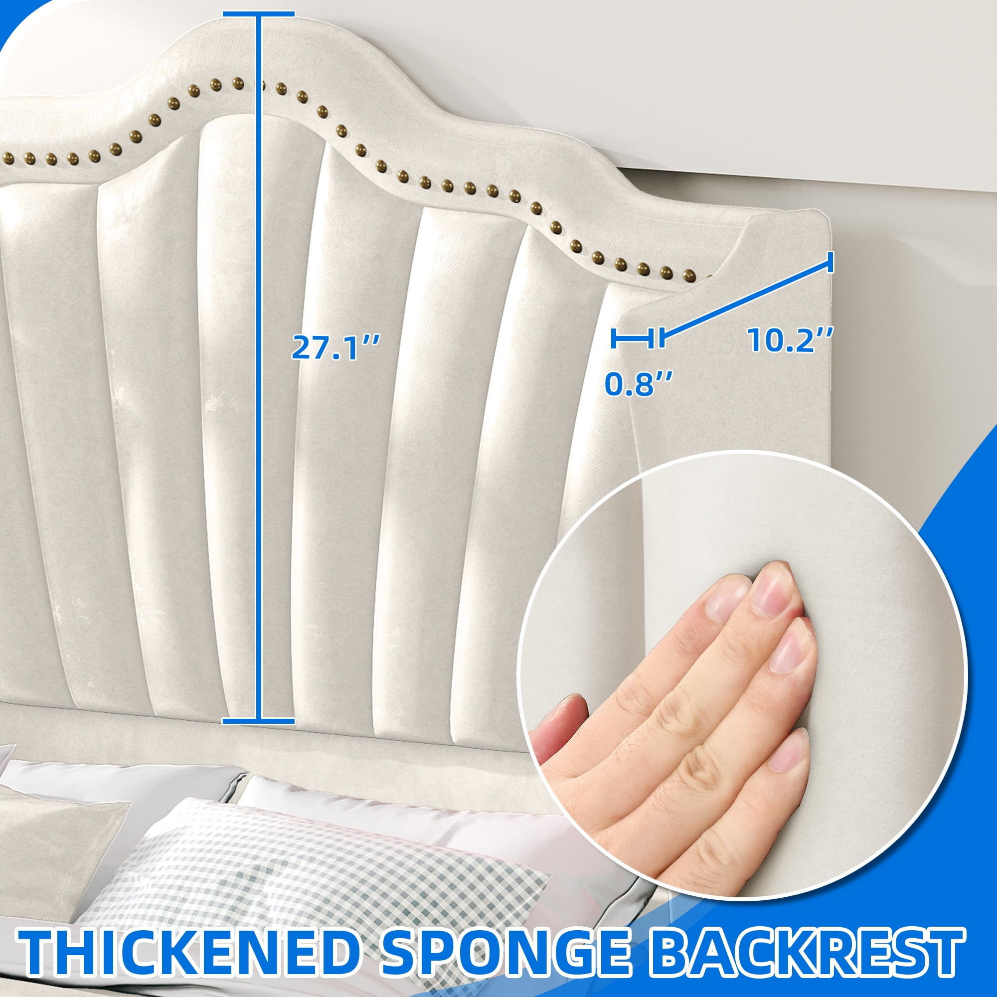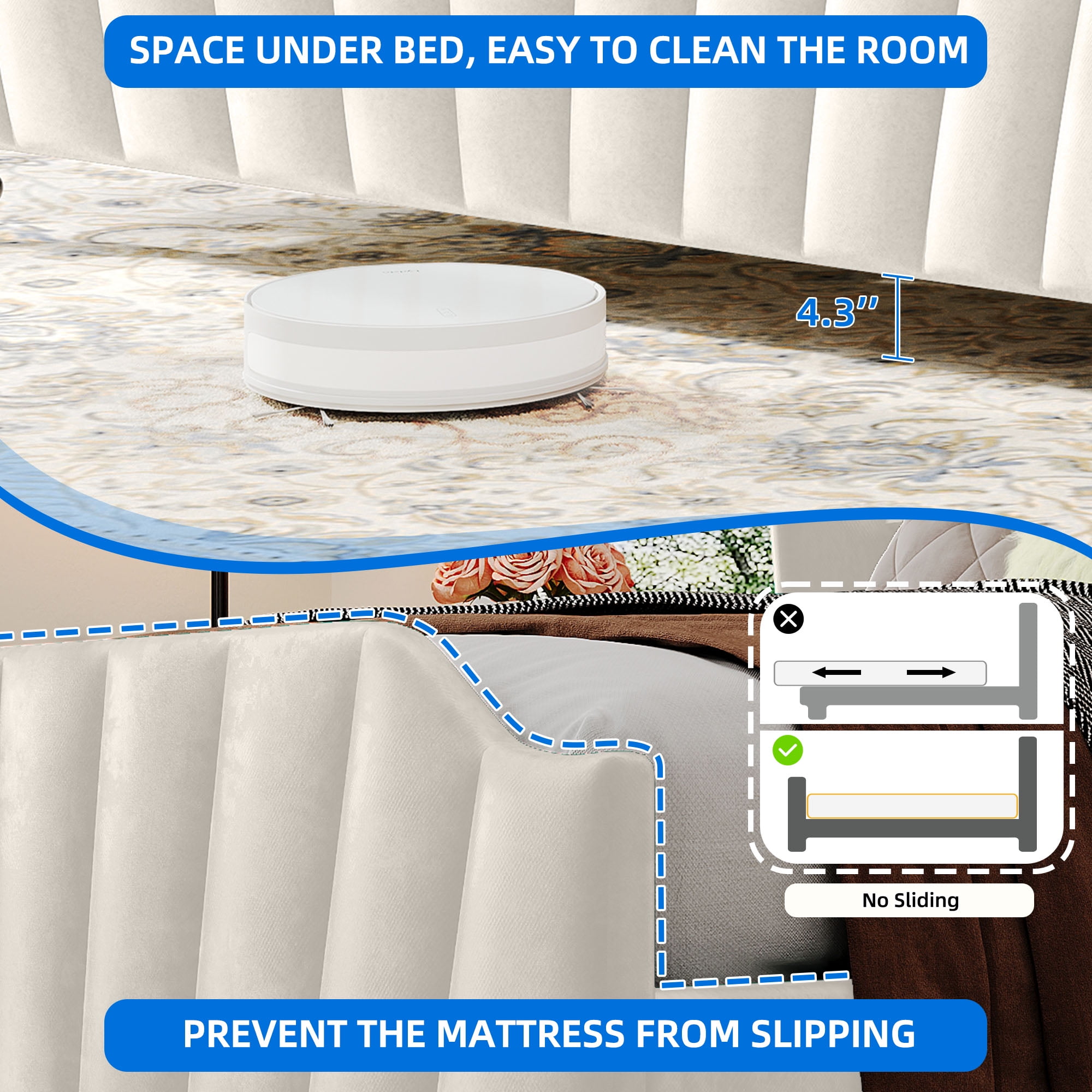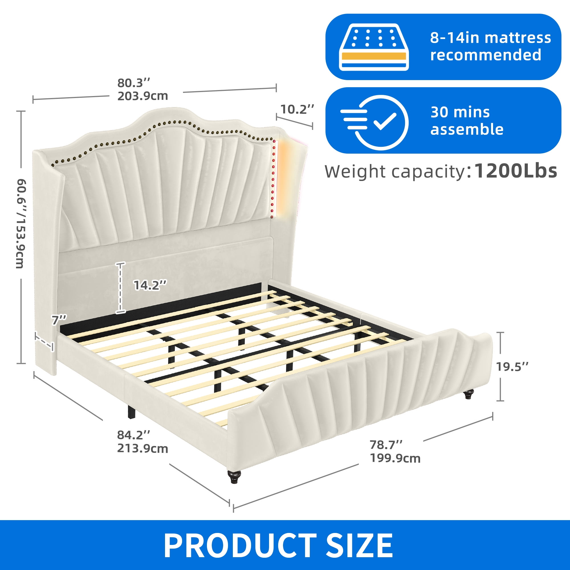 Uforic King Upholstered Platform Bed with Tall Wingback Headboard, Velvet Bed Frame with LED Light, Solid Wood Leg, Beige