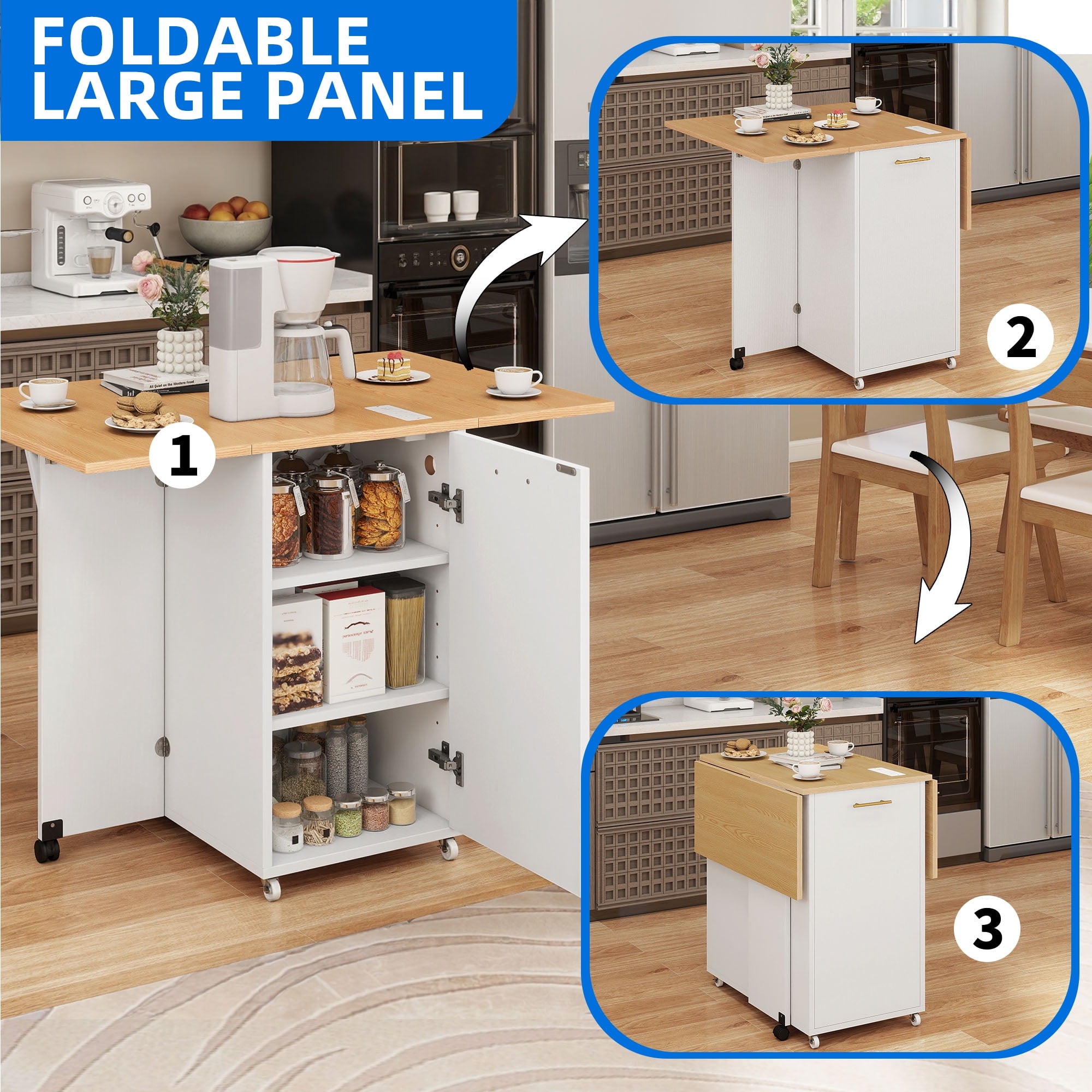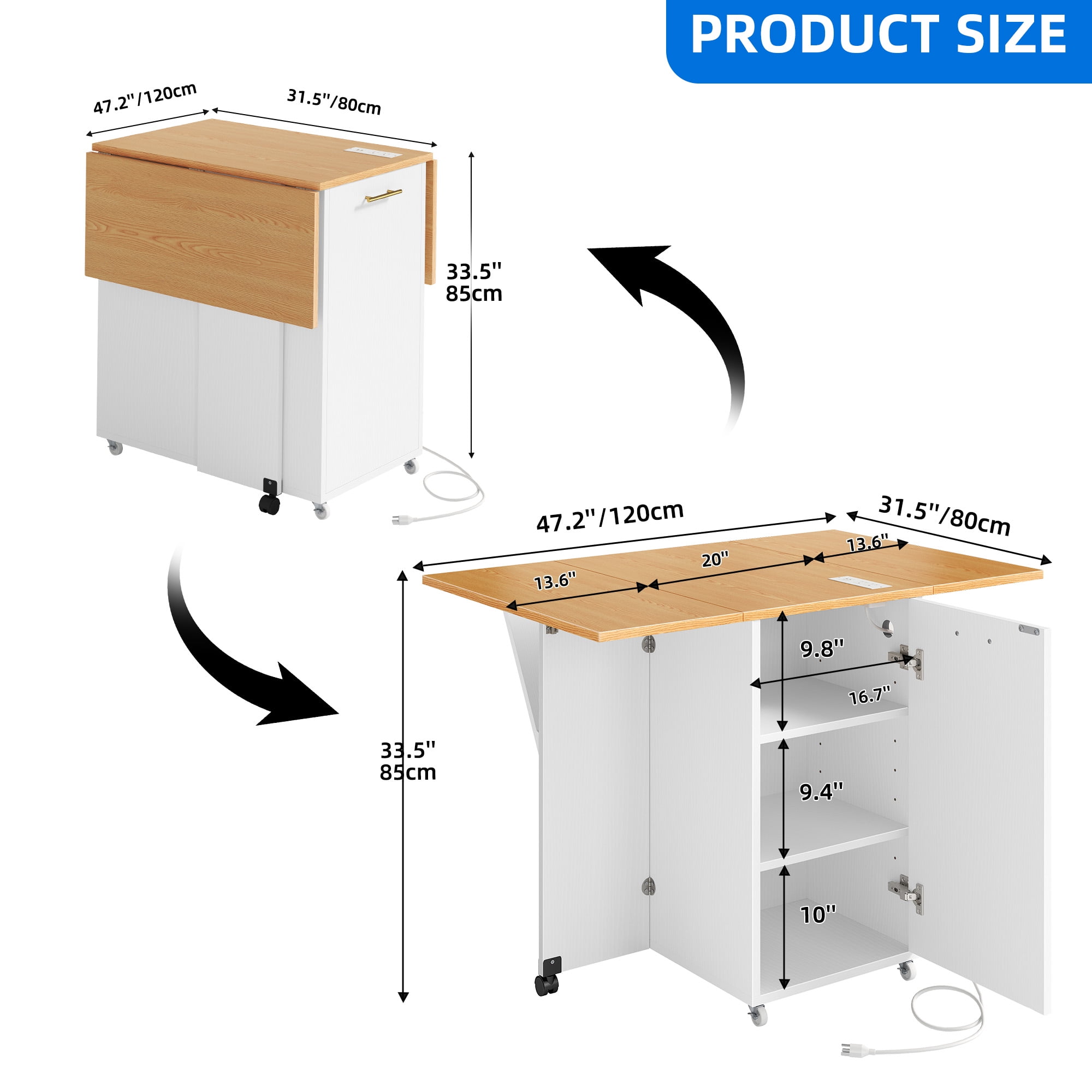 Drop Leaf Design: Uforic kitchen island features a versatile foldable tabletop that expands for extra space or folds up to save room, adapting to any kitchen layout effortlessly Charging Station: Stay connected with 2 AC and 2 USB ports integrated into the kitchen island, ensuring your devices are always charged and ready for use Trash Can Storage: Keep your kitchen clean and organized with a designated cabinet capable of holding a 10-gallon trash can (not included) Durable Construction: Crafted from sturdy materials, the kitchen island cart boasts a scratch-resistant, easy-to-clean wooden top that can support up to 300 lbs Easy Assembly: Set up your kitchen island hassle-free with clear instructions and numbered parts, making assembly a breeze for users of all skill levels