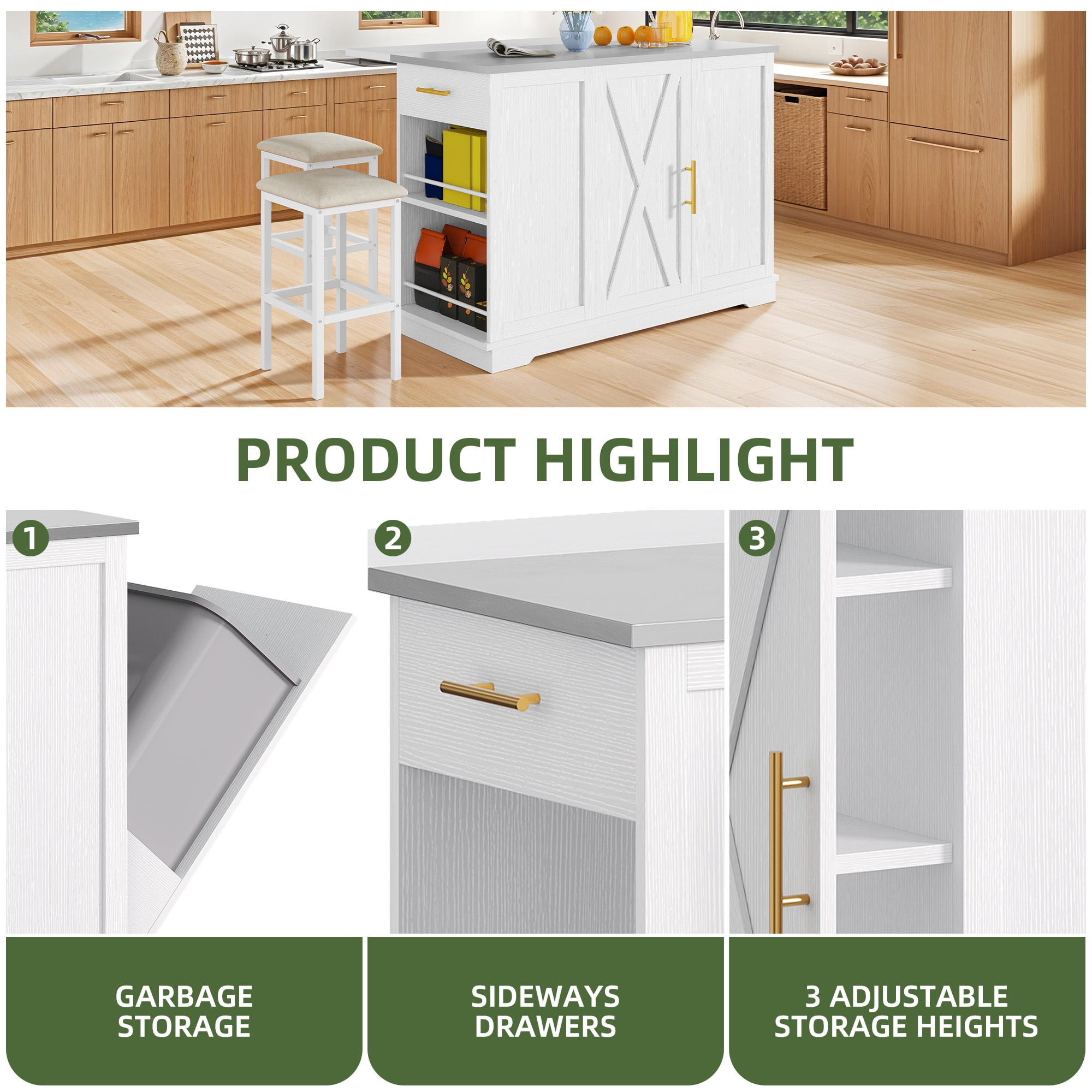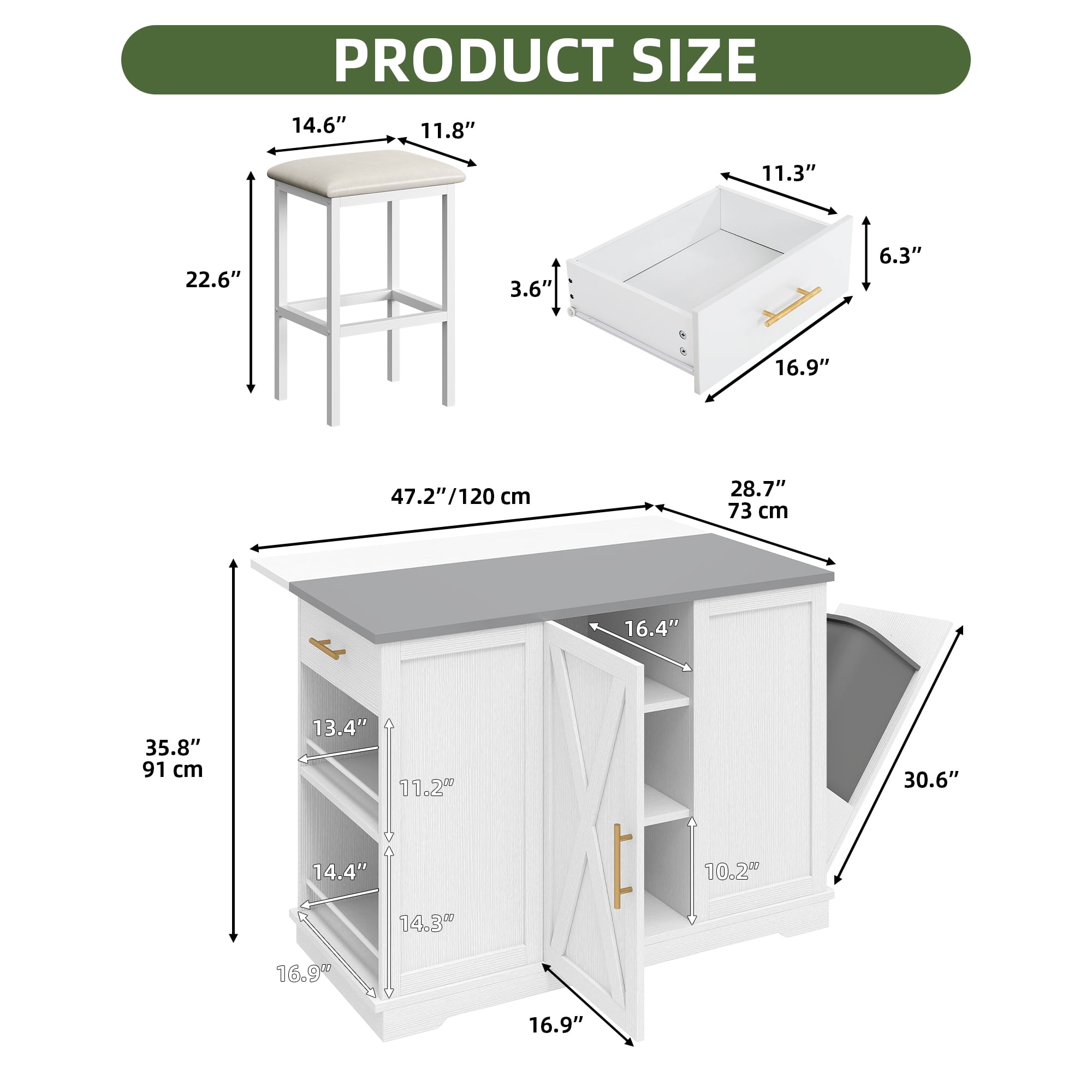 Convenient Charging Hub: With 2 USB ports and 2 three-pronged outlets, this kitchen island makes charging kitchen appliances and devices convenient Included Seating for Comfort: Two cushioned bar stools are included, providing a comfortable spot to sit while cooking or dining casually Durable Folding Countertop: The stainless steel tabletop folds out to offer ample prep space and folds back to save room, supporting up to 300 pounds and resisting stains for easy cleaning Spacious Storage Solutions: This Uforic kitchen island provides a large cabinet, drawer, two-tier storage racks, and adjustable shelves for organizing tableware, kitchen tools, spices, towels, and appliances Odor-Resistant Trash Storage: A tilt-out trash bin cabinet is designed to hold a 13-gallon trash bin (not included), helping to prevent odors and maintain cleanliness