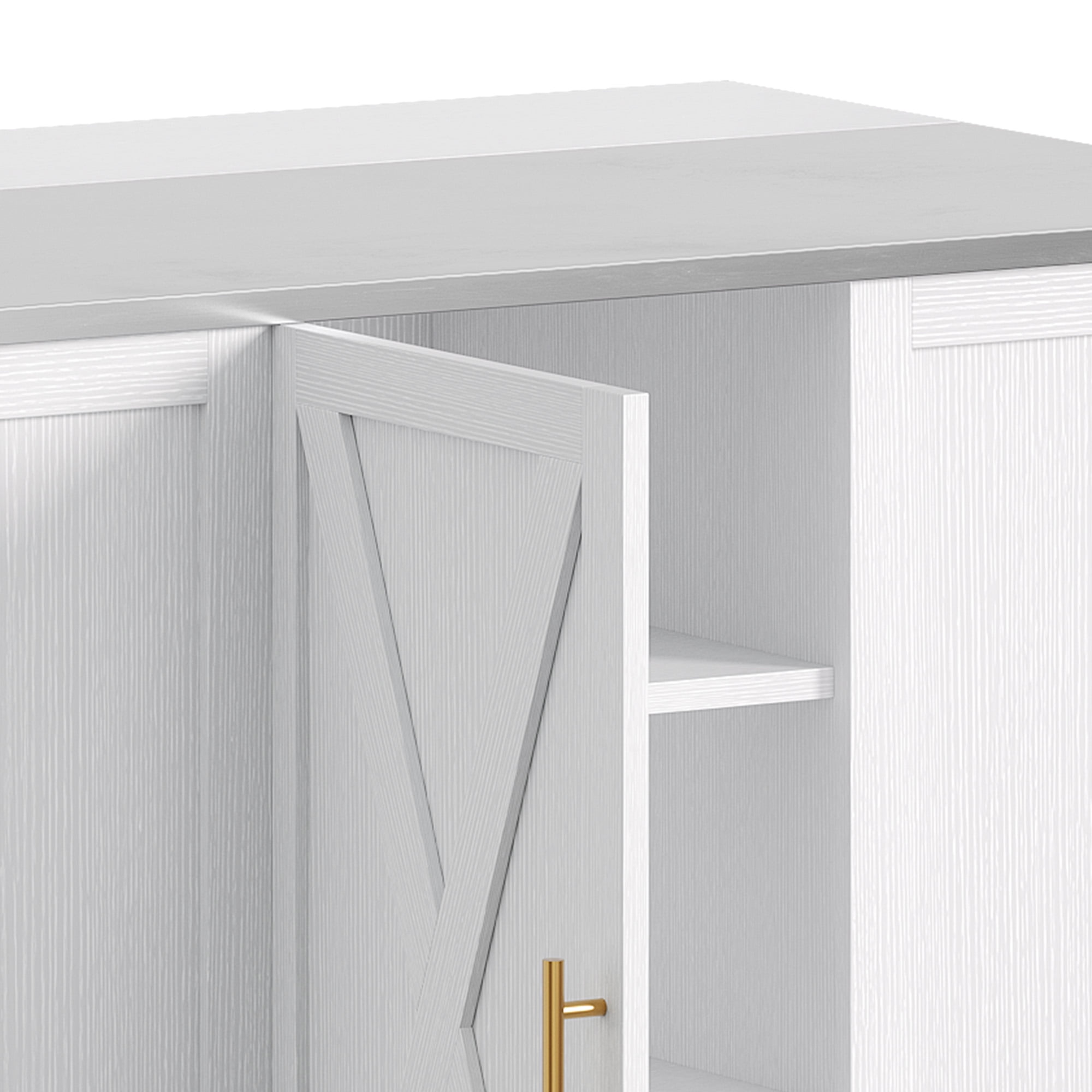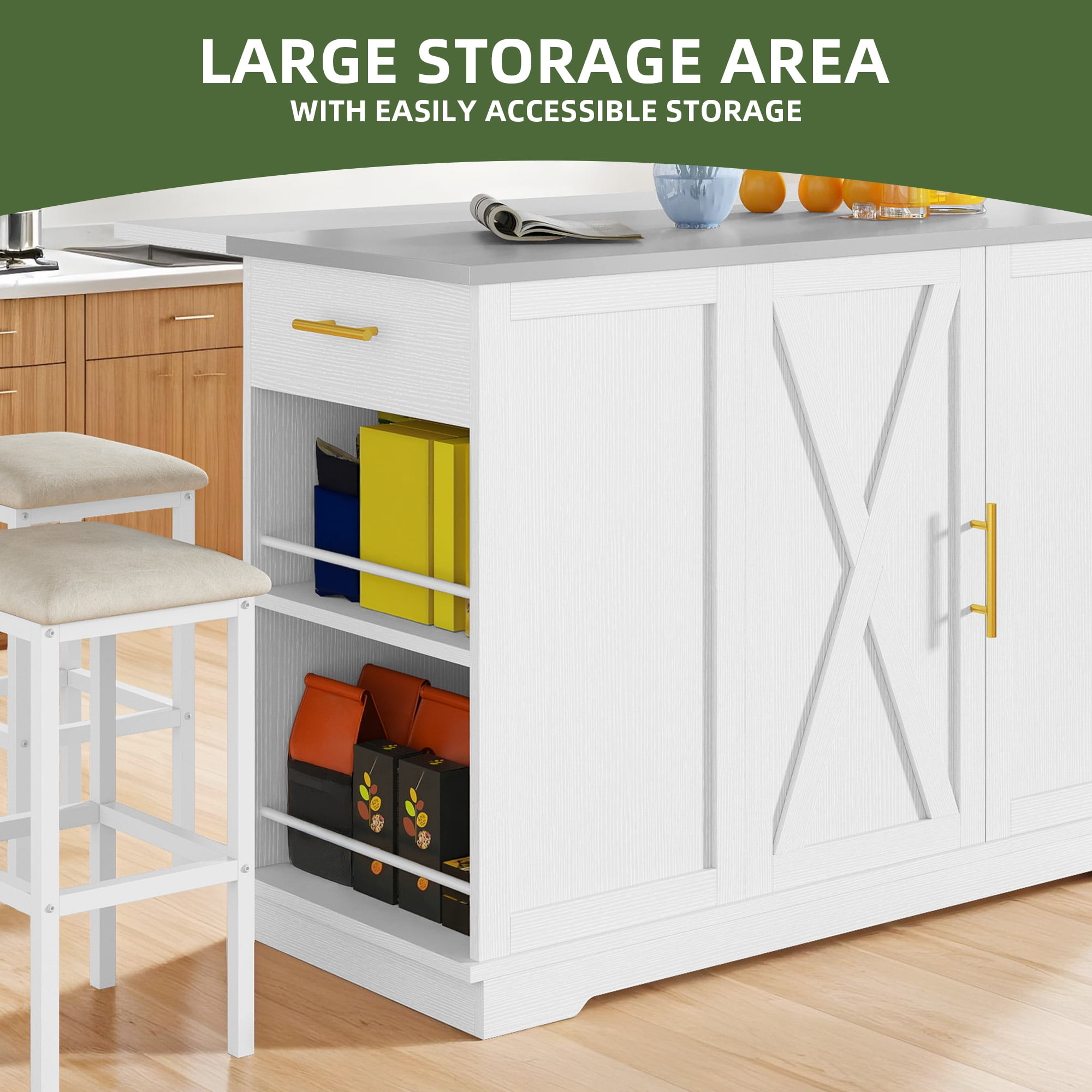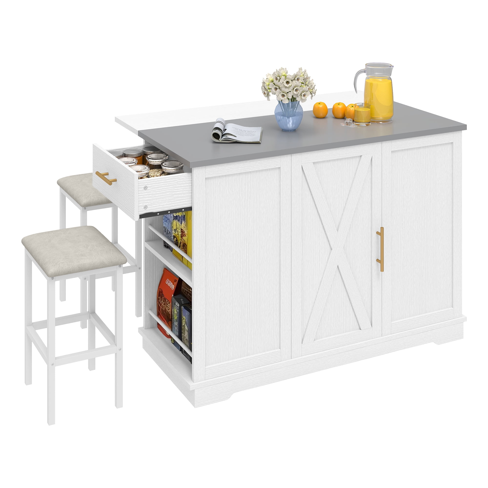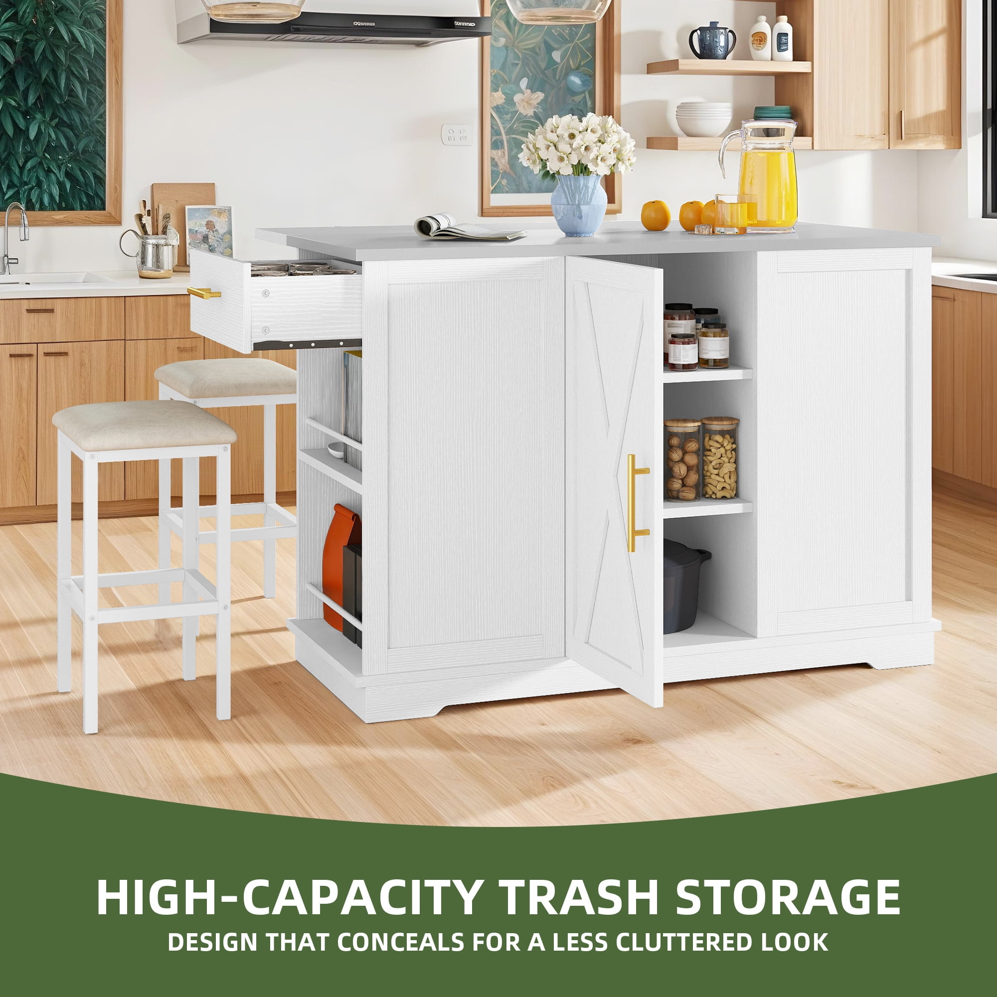 Uforic Kitchen Island with Drop Leaf & Seatings, Island with Power Outlets & Trash Storage, White