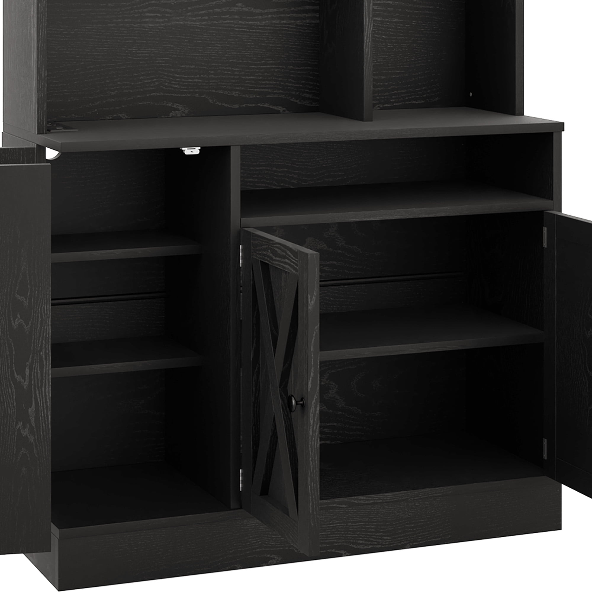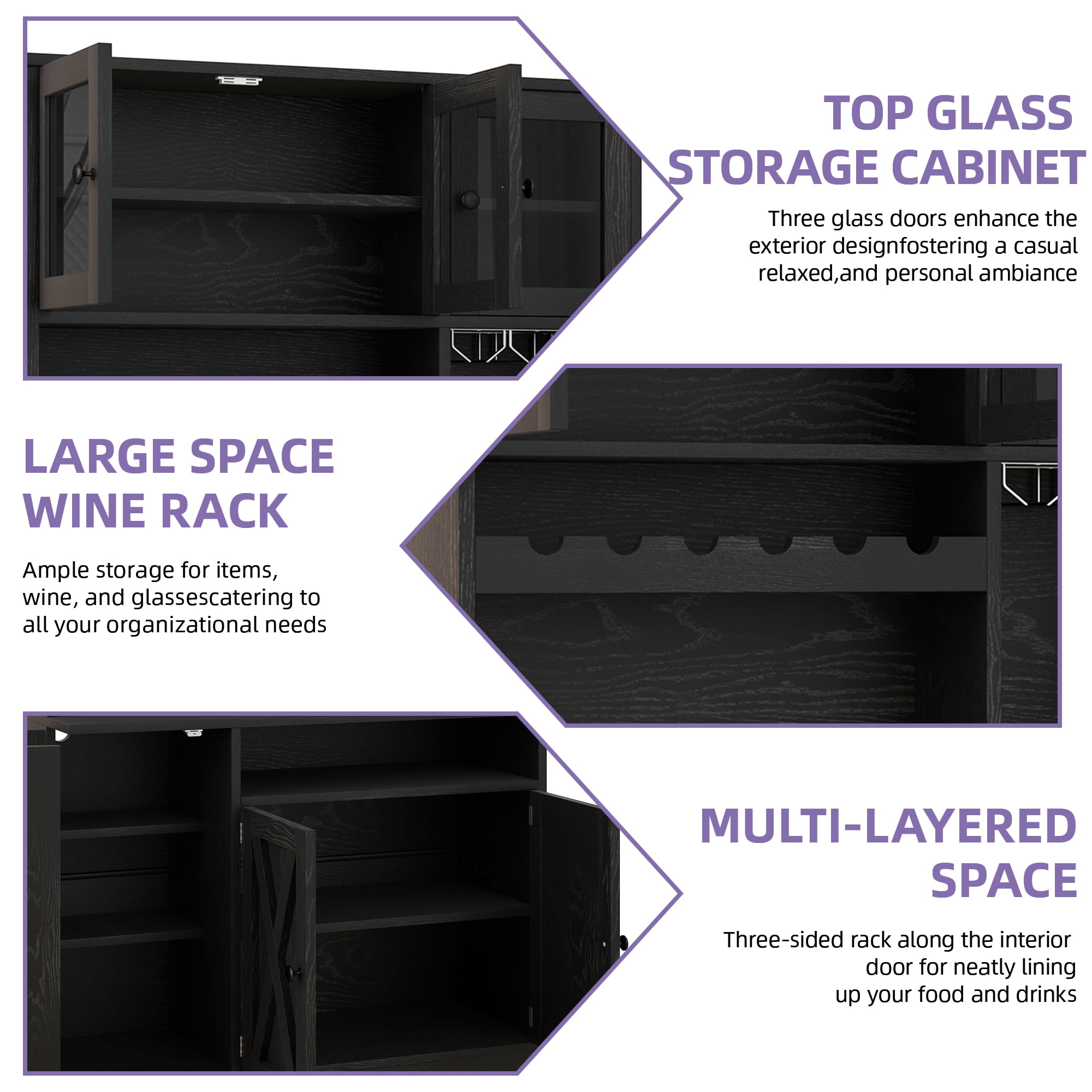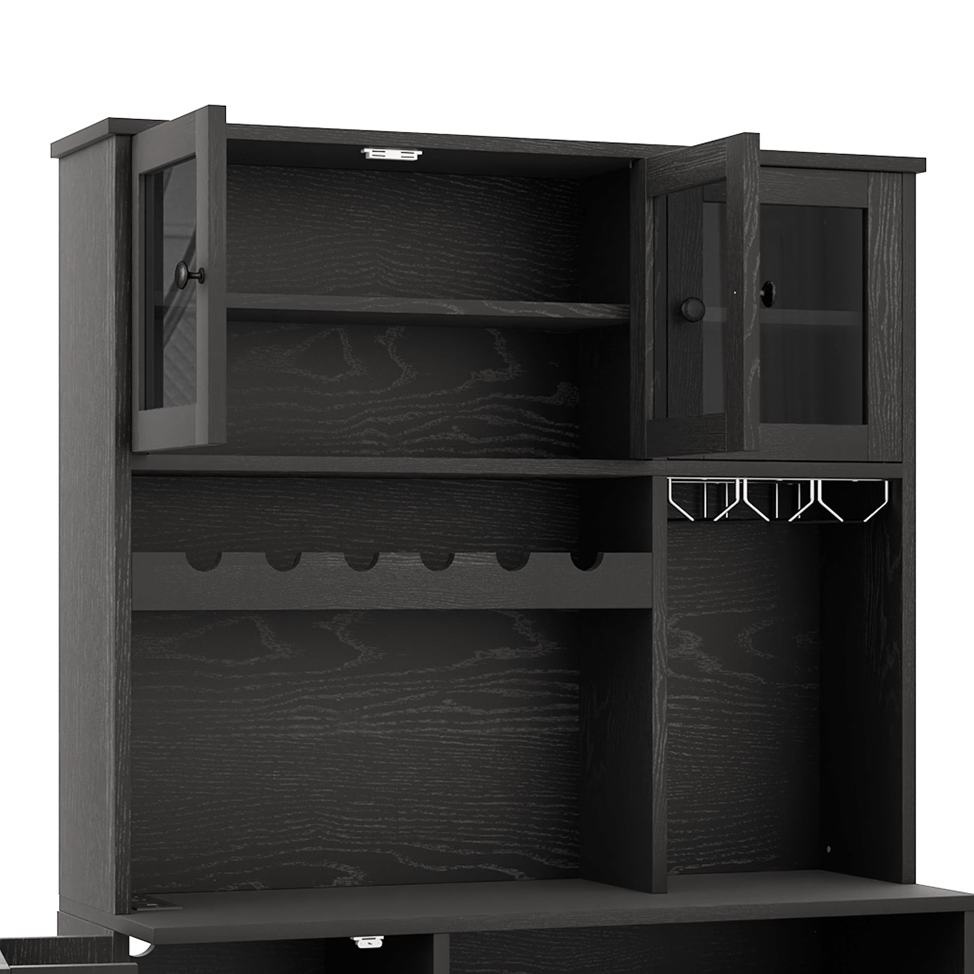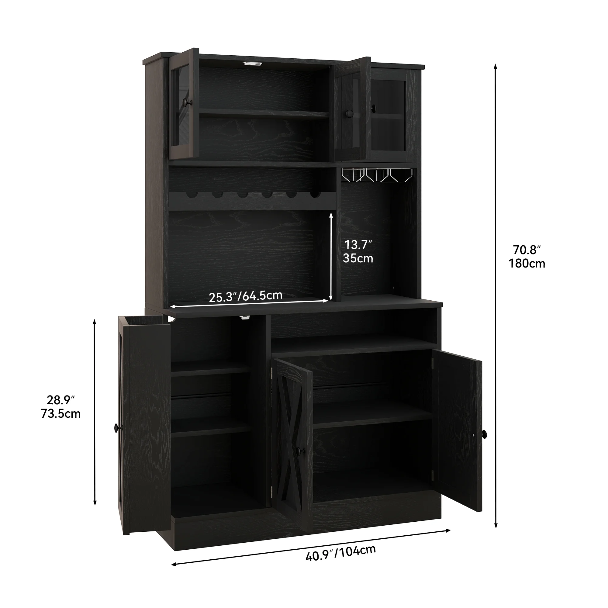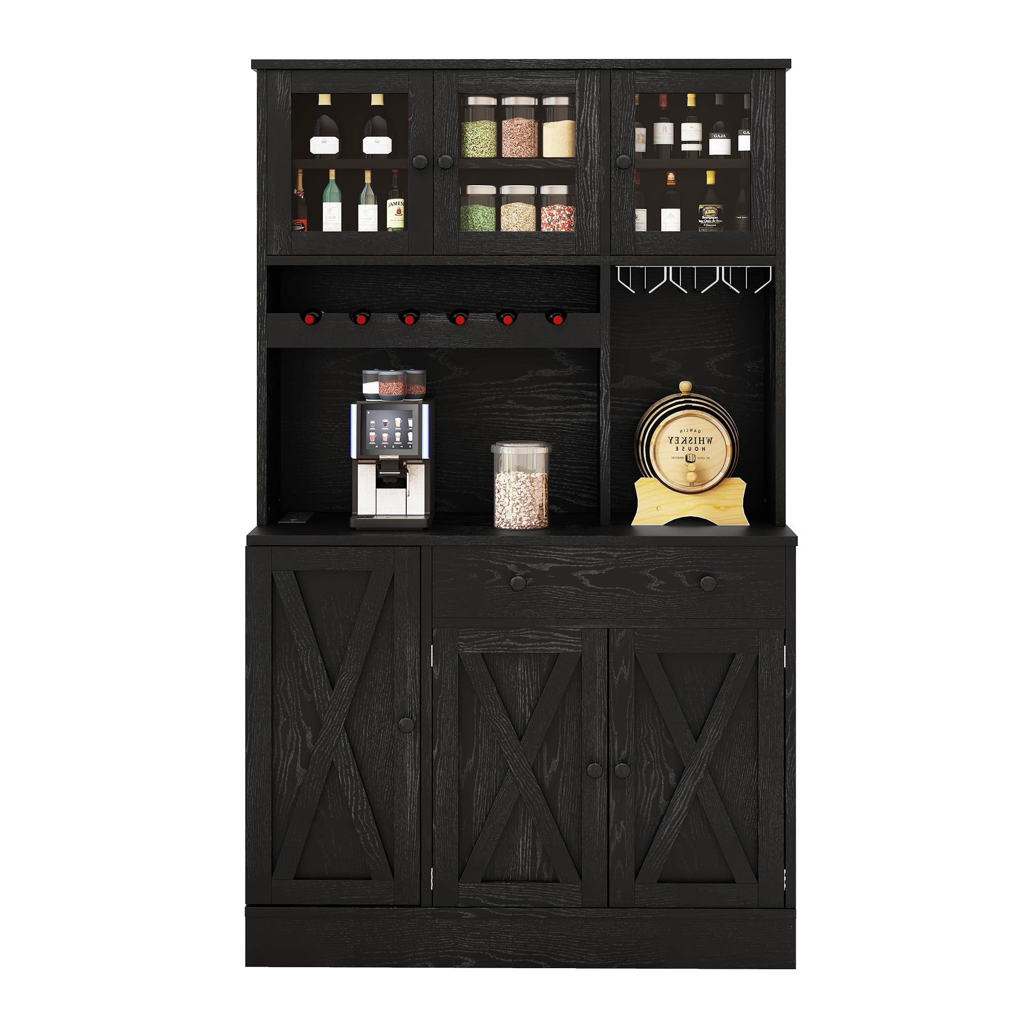 Integrated Power Outlet: The buffet cabinet elevates your kitchen’s functionality with a built-in power outlet, ideal for powering small appliances like coffee makers and microwaves. Convenient Door-Side Rack: This kitchen pantry cabinet features a 3-layer door-side rack to access your essentials easily, suitable for storing spices and small items within reach. Versatile Kitchen Storage: Our multifunctional pantry cabinet effectivel expands your kitchen space. It combines a glass-view top, goblet holder, wine rack, and adjustable shelves to keep everything from dishes to spices organized. Rustic Farmhouse Charm: Add rustic elegance to any room with our farmhouse style buffet cabinet. Its timeless design fits seamlessly into kitchens, dining rooms, living areas, or other spaces. Stong & Safe Build: Constructed for stability, this tall kitchen cabinet with doors and shelves comes with an anti-tip device, ensuring it is both a stylish and reliable storage solution.
