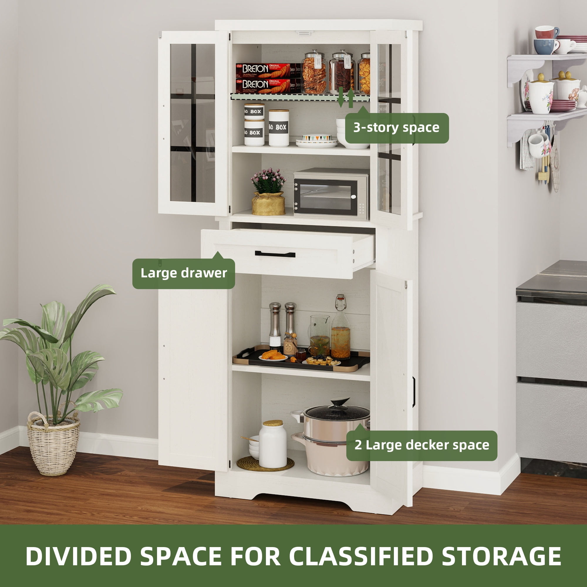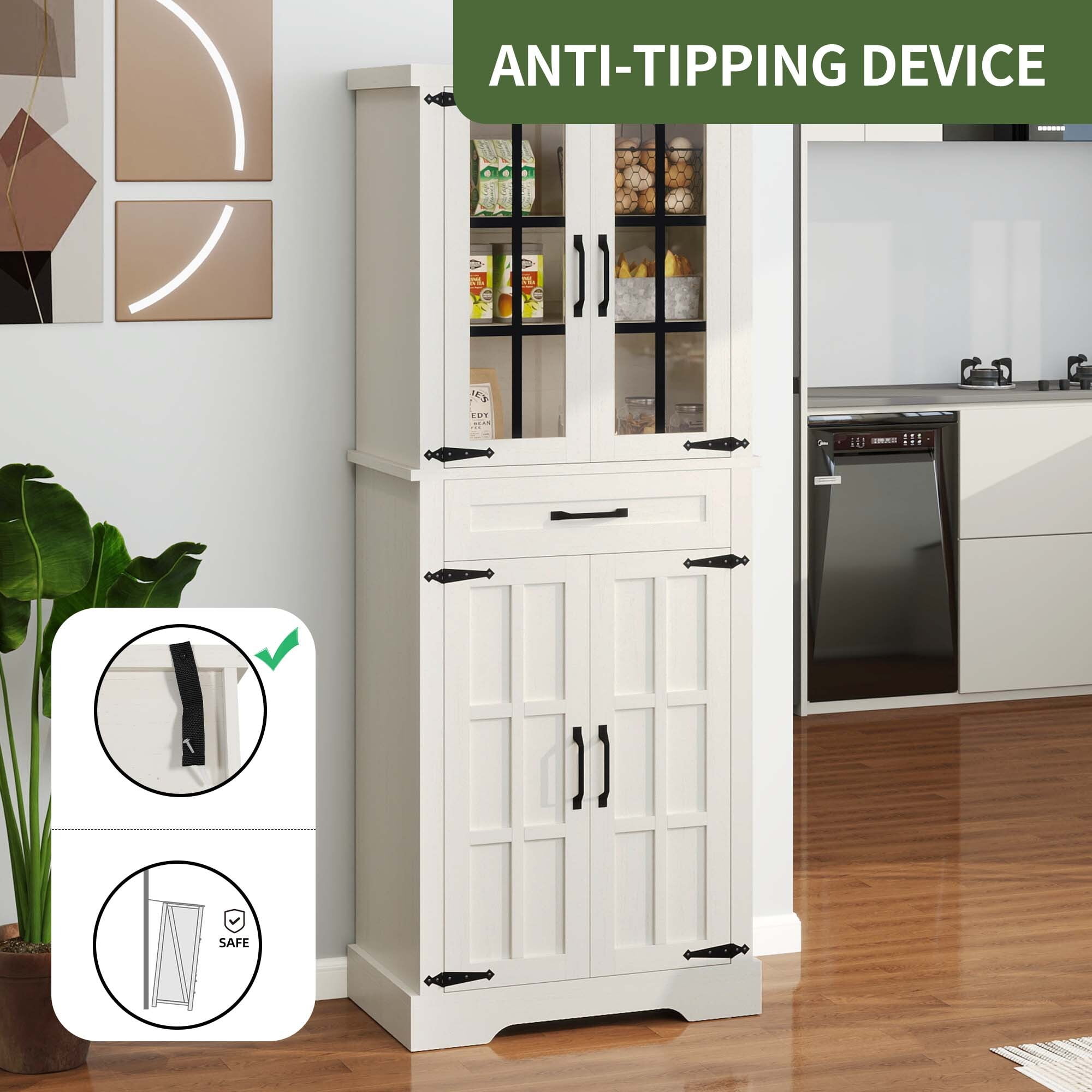 Versatile Storage Solutions: The Uforic kitchen pantry cabinet offers a generous storage space with a drawer and five shelves, one of which is adjustable, catering to a diverse range of storage needs Door Design: This pantry cabinet is distinguished by its four-door design, shielding the contents from dust and accidental spills, while promoting a neat and organized storage environment Sturdy and Long-lasting: Built from premium MDF material, the storage cabinet is designed for durability, ensuring it will serve you reliably over time Safety-Enhanced Features: Equipped with anti-tipping mechanisms, this kitchen cabinet provides added stability, making it a safe choice for any home setting Flexible Functionality: With its spacious and adaptable design, the storage cabinet is not confined to the kitchen; it’s equally at home in bedrooms, living rooms, and beyond, providing storage wherever it’s needed User-Friendly Assembly: The pantry cabinet comes with straightforward assembly instructions, ensuring a smooth and convenient setup process, so you can start utilizing your new storage space without delay