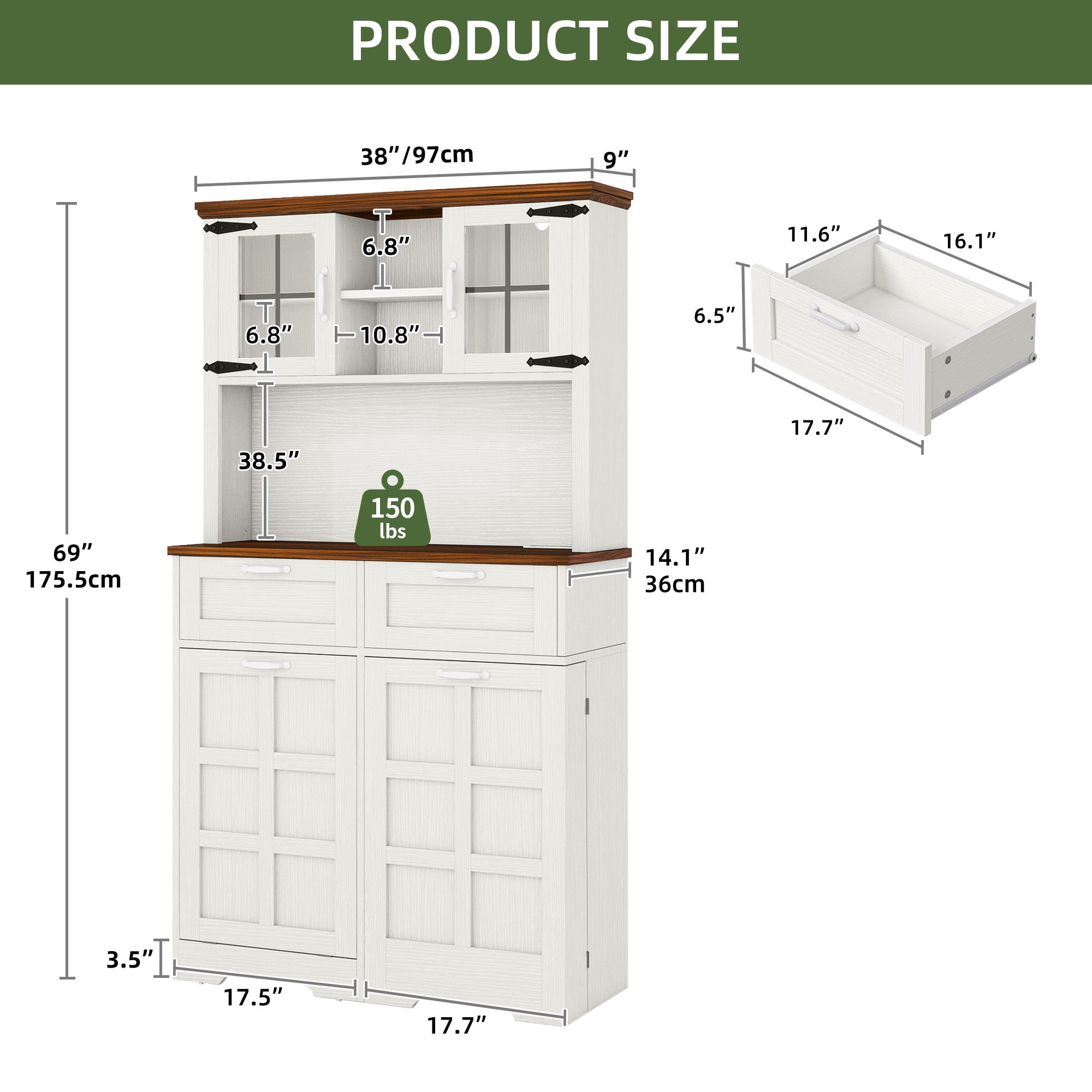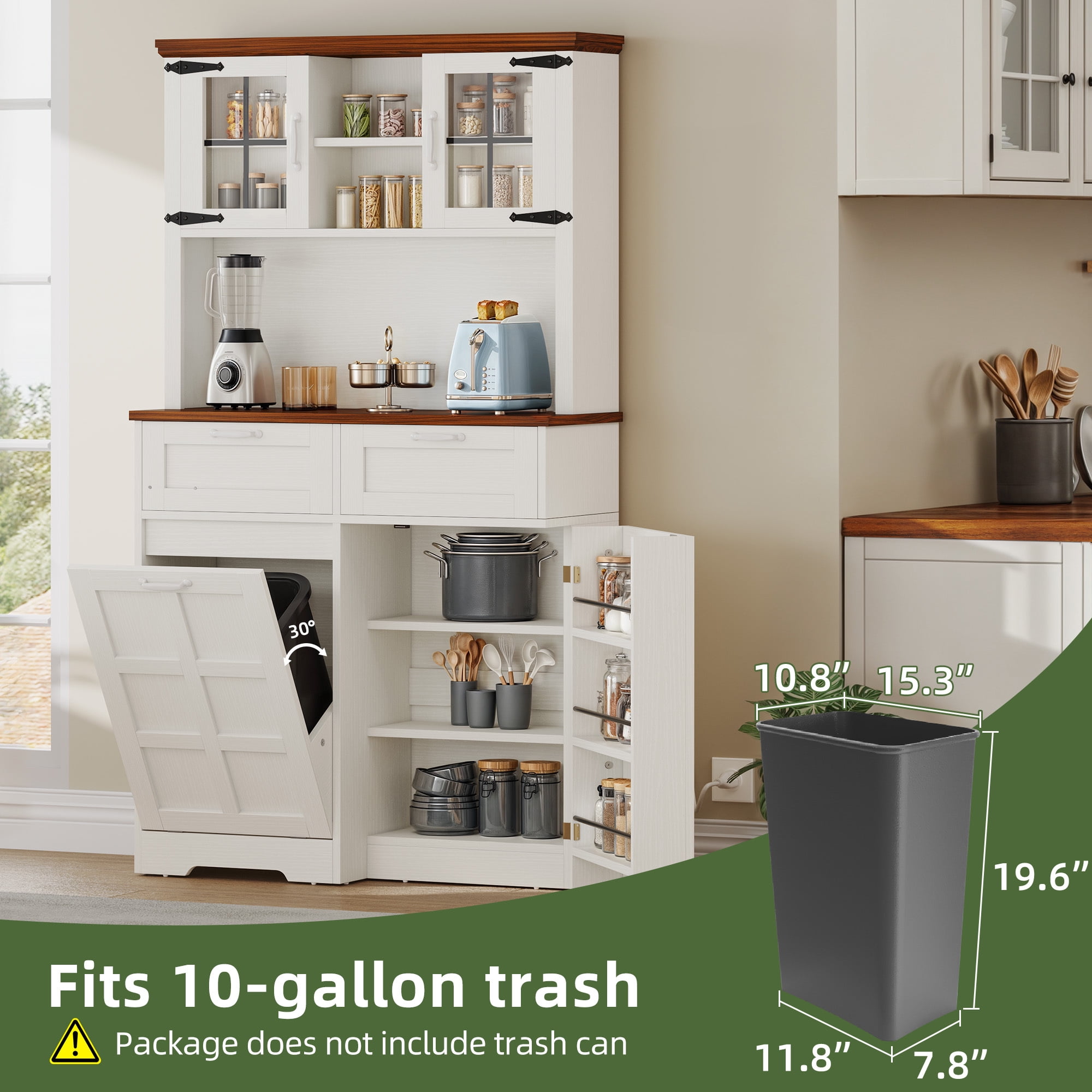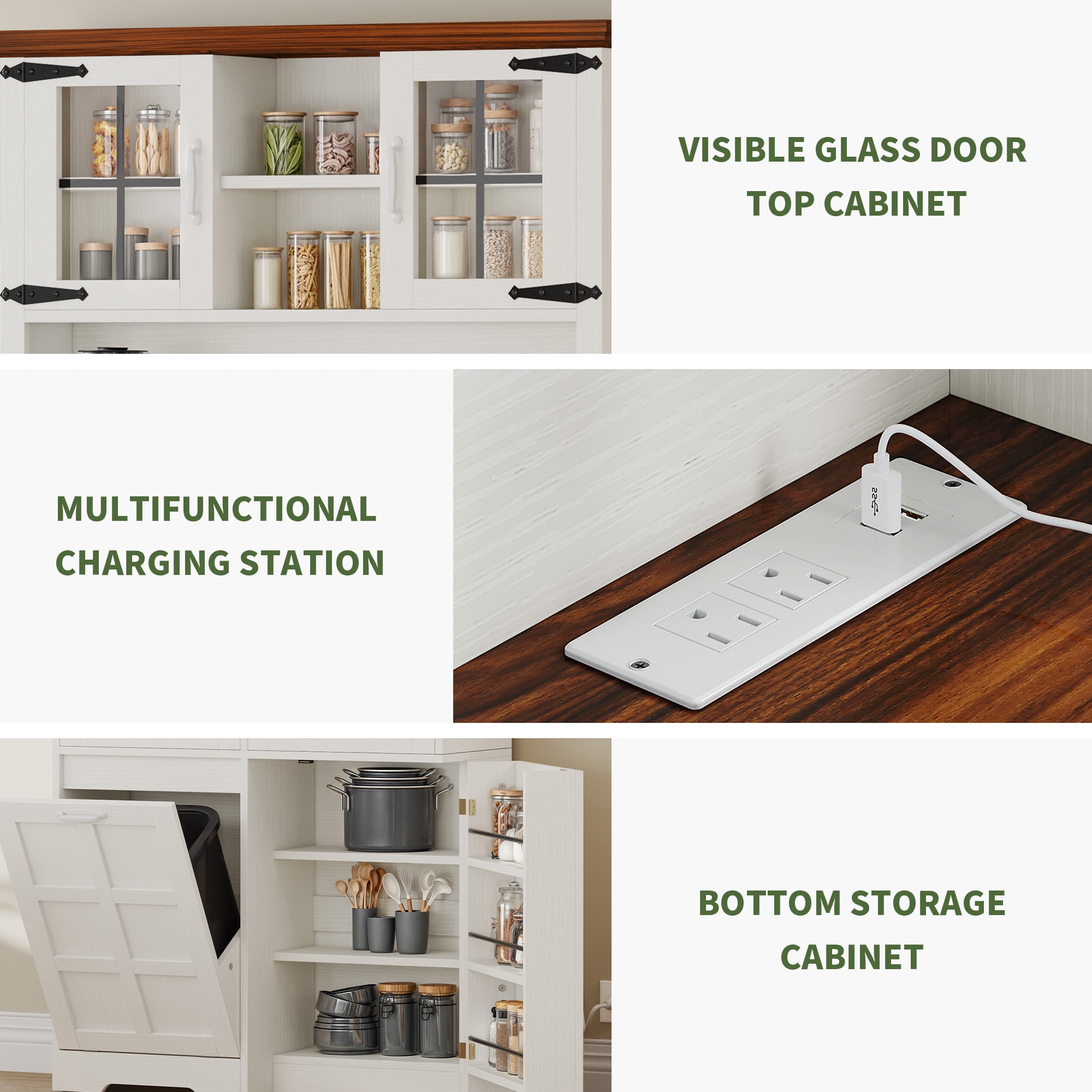 Ample Storage: Uforic pantry cabinet features two drawers, a spacious countertop, dual storage cabinets, and an adjustable shelf, providing efficient organization for your kitchen essentials Trash Bin Storage: Simplify waste disposal with the 10-gallon trash can (not included) compartment, ensuring easy cleanup and effective odor control within your kitchen space Convenient Charging: Stay connected effortlessly with the inclusion of 2 USB ports and 2 AC outlets, offering convenient charging options for your devices while you work in the kitchen Sturdy Materials: Built to endure daily use, our kitchen pantry cabinet is crafted from robust MDF material, ensuring durability and strength that can withstand the demands of a busy kitchen environment Easy Assembly: Enjoy a stress-free setup process with our detailed instructions and numbered accessories, making it quick and simple to assemble your new storage cabinet without any hassle