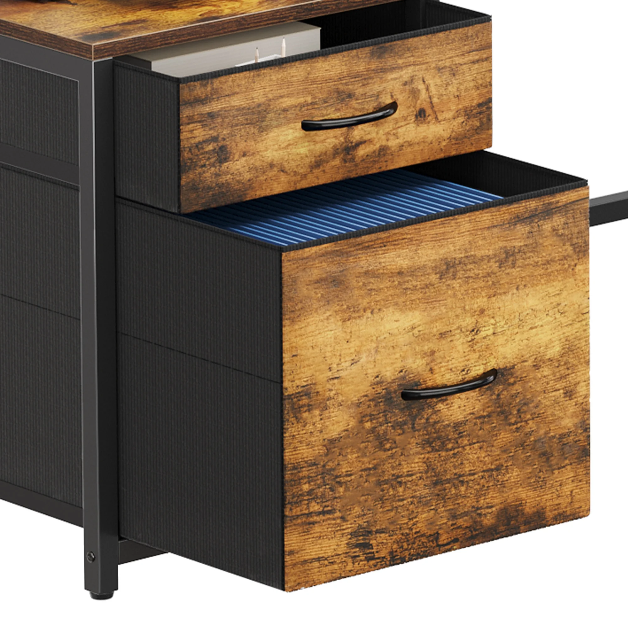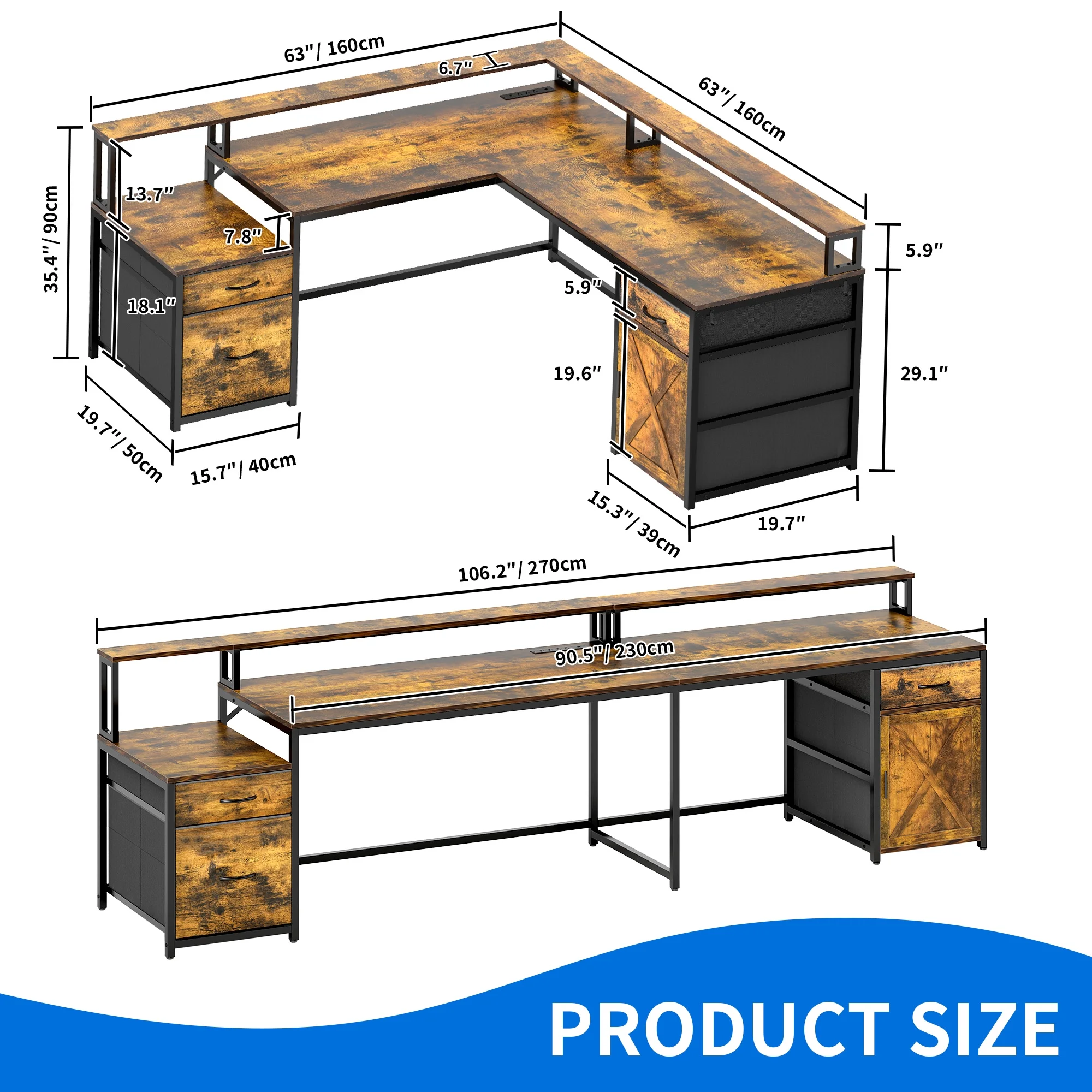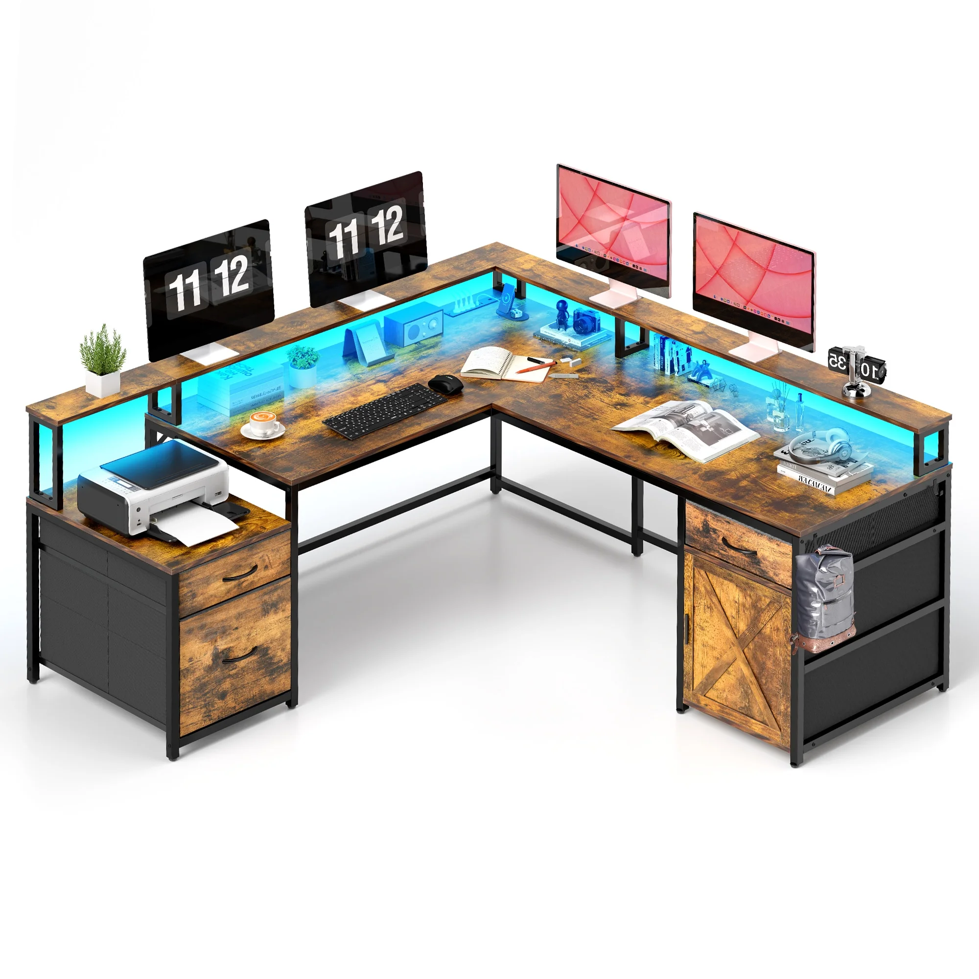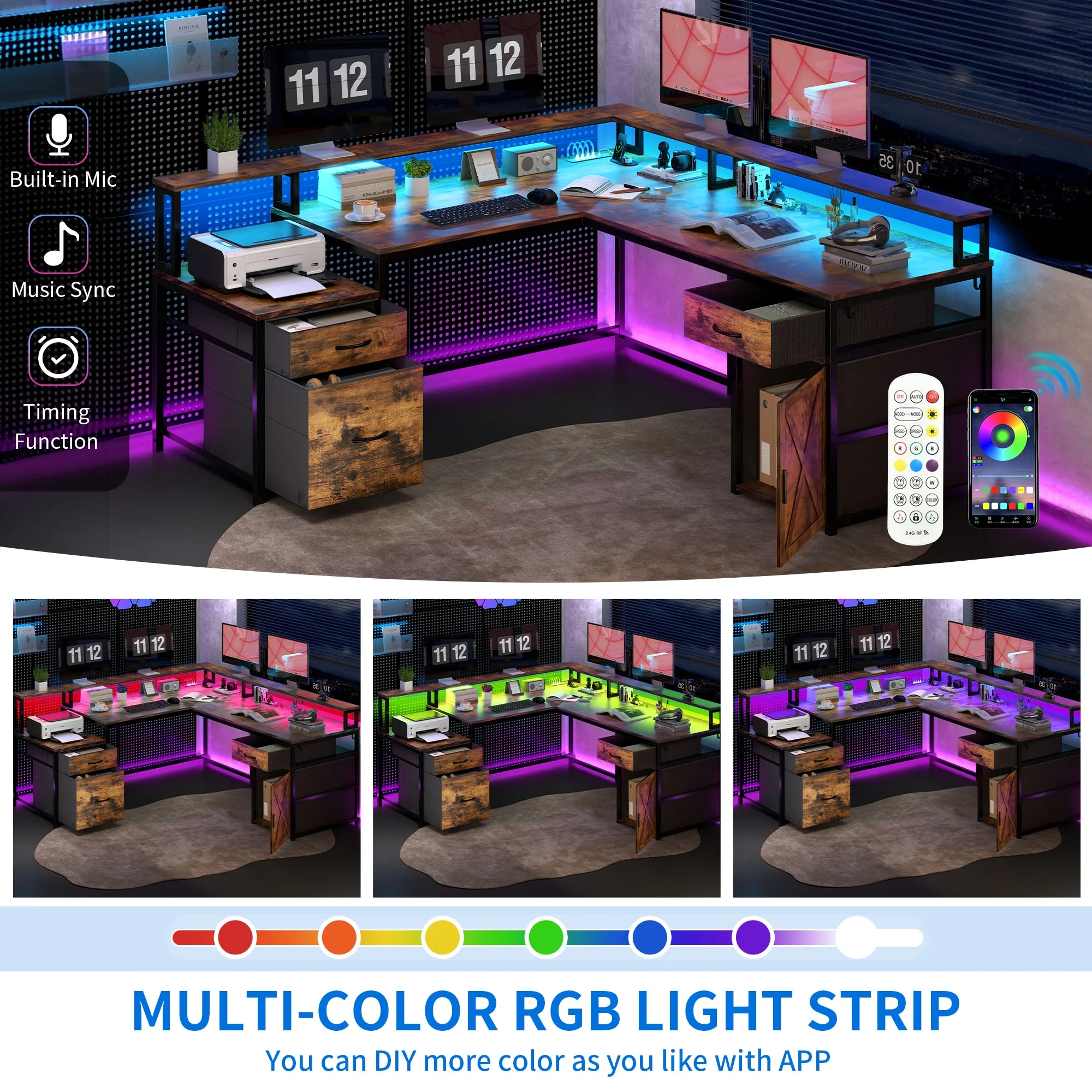 Power Up Your Productivity: Stay charged and connected with the built-in power station, featuring 4 AC outlets and 2 USB ports. No more hunting for outlets – focus on what matters most. Customizable LED Lighting: Set the right mood with vibrant LED lighting, controllable through a phone app or remote. Sync it to your music, set timers, or adjust brightness to match any occasion – transforming your workspace into a personalized ambiance. Spacious Storage: Maximize your space with a roomy desktop, shelving for up to 4 monitors, 3 fabric drawers, 1 of which is with adjustable hanging bars for letter/A4/legal size files. Besides, a storage cabinet and 2 hooks provide further convenience. Versatile Design for Any Setup: Switch effortlessly between an L-shaped desk to save space or a long desk for teamwork and collaboration. Whether it’s for gaming, studying, or office work, this desk adapts to your needs with ease and style. Easy Assembly: Thanks to clear instructions and numbered parts, assembling this desk is a breeze. Bring home a multifunctional piece that enhances your productivity, whether you’re immersed in a project or gearing up for an epic gaming session.