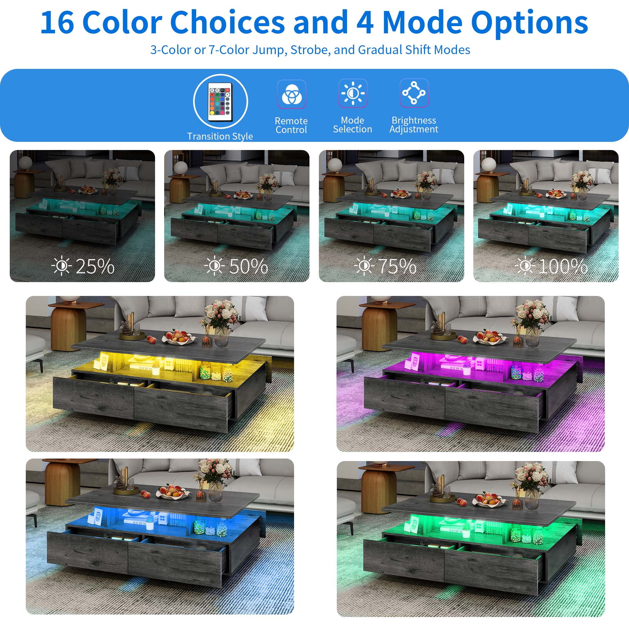 Step into a world of dynamic ambiance with our LED coffee table, boasting 16 vibrant colors, 4 exciting modes, and adjustable brightness, all controlled by a convenient remote. Whether you’re seeking a cozy night in or gearing up for a lively soiree, this table sets the mood just right.But wait, there’s more! Say goodbye to clutter with its generous storage space, including open compartments and sliding drawers to keep your essentials neat and orderly, creating your own oasis of tidiness.