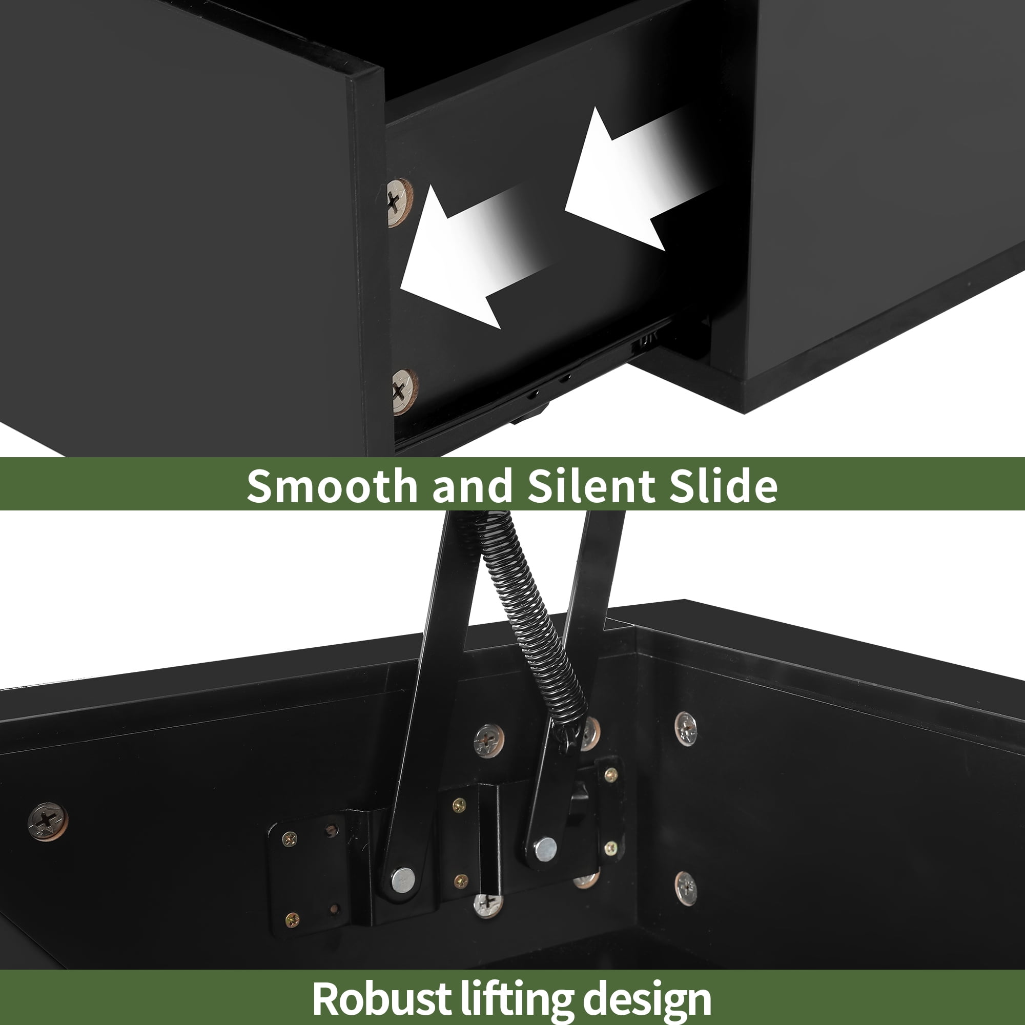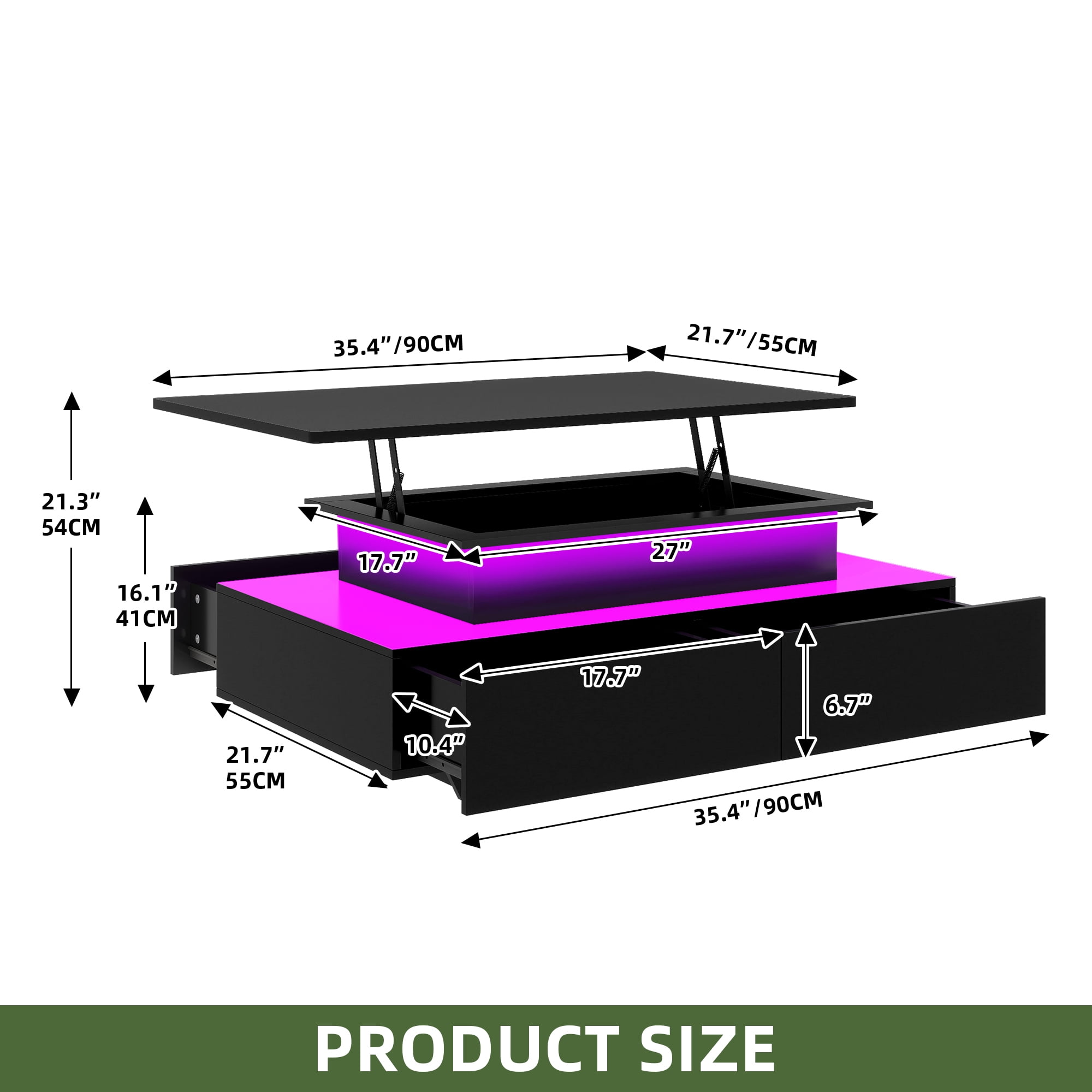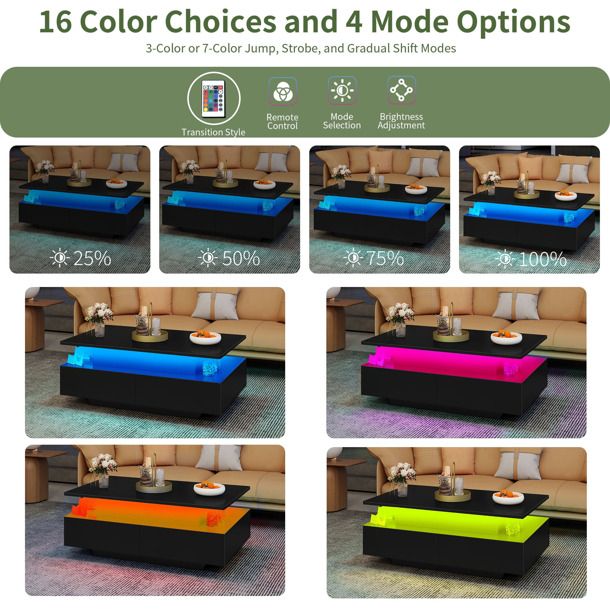 Hidden Storage and Drawers: The coffee table comes with a hidden storage area, an open shelf, and four spacious drawers, providing ample space to store a variety of items such as blankets, snacks, electronics, laptops, chess sets, remotes, and more. Versatile Lifting Mechanism: The rectangular coffee table features an innovative lift mechanism that allows you to easily adjust the table height. You can lift it up for dining, gaming, or as a workstation, and lower it for stylish storage. Craftsmanship and Design: Crafted from robust engineered wood, the black coffee table is designed with elegant rounded edges for safety and a sleek, polished finish for easy maintenance. The attention to detail in the design ensures that style meets function seamlessly, enhancing the overall aesthetic of your living space. Multifunctional Storage: In addition to the hidden compartment, the coffee table features an open shelf and four spacious drawers for organized storage. This multifunctional approach allows you to neatly arrange items and create a tidy and stylish living space. RGB LED Lights: Taking functionality to the next level, the coffee table is equipped with built-in RGB LED lights that can be controlled remotely. You can personalize your ambiance with dimmable settings, a range of colors, and dynamic modes, creating a captivating atmosphere in your living room.