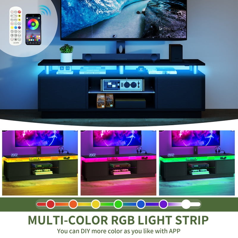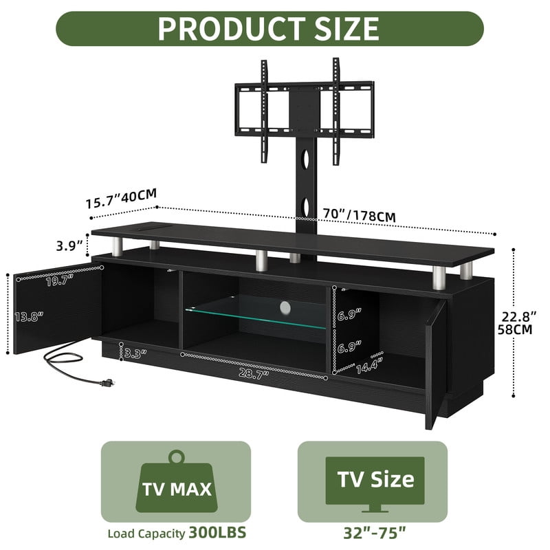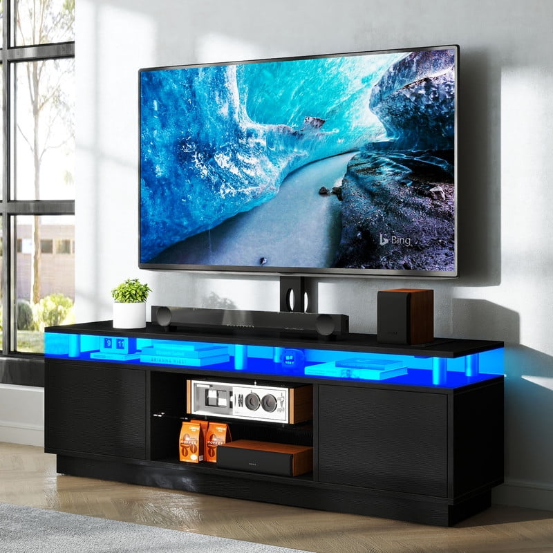 Flexible TV Mounting Magic: Transform your viewing experience with our adjustable TV mount, designed to fit TVs from 32″ to 75″. Easily adjust the position up, down, left, or right to achieve the perfect viewing angle. For an elevated setup, simply mount it on the wall and enjoy! Power-Up Convenience: Say goodbye to dead batteries! With 4 AC outlets and 2 USB ports conveniently located on the tabletop, your gaming consoles, phones, and tablets stay charged and ready for action. Stay connected and keep the fun going without interruption. Robust Storage Solutions: Crafted from durable engineered wood, this entertainment center is built to last. It features 4 spacious open areas and 2 hidden compartments to keep clutter out of sight, combining style with practicality. The tempered glass ensures a break-proof surface for lasting enjoyment. Mood-Enhancing LED Lights: Whether you’re hosting a party or enjoying a movie night, easily adjust the LED light colors and brightness with just a click to set the perfect ambiance. The press-to-open cabinets add a sleek and modern touch to your space. Effortless Assembly: Setting up your new TV stand is a breeze! With easy-to-follow instructions and numbered parts, even beginners will feel like DIY experts. Plus, our expert support ensures a smooth and enjoyable setup experience.