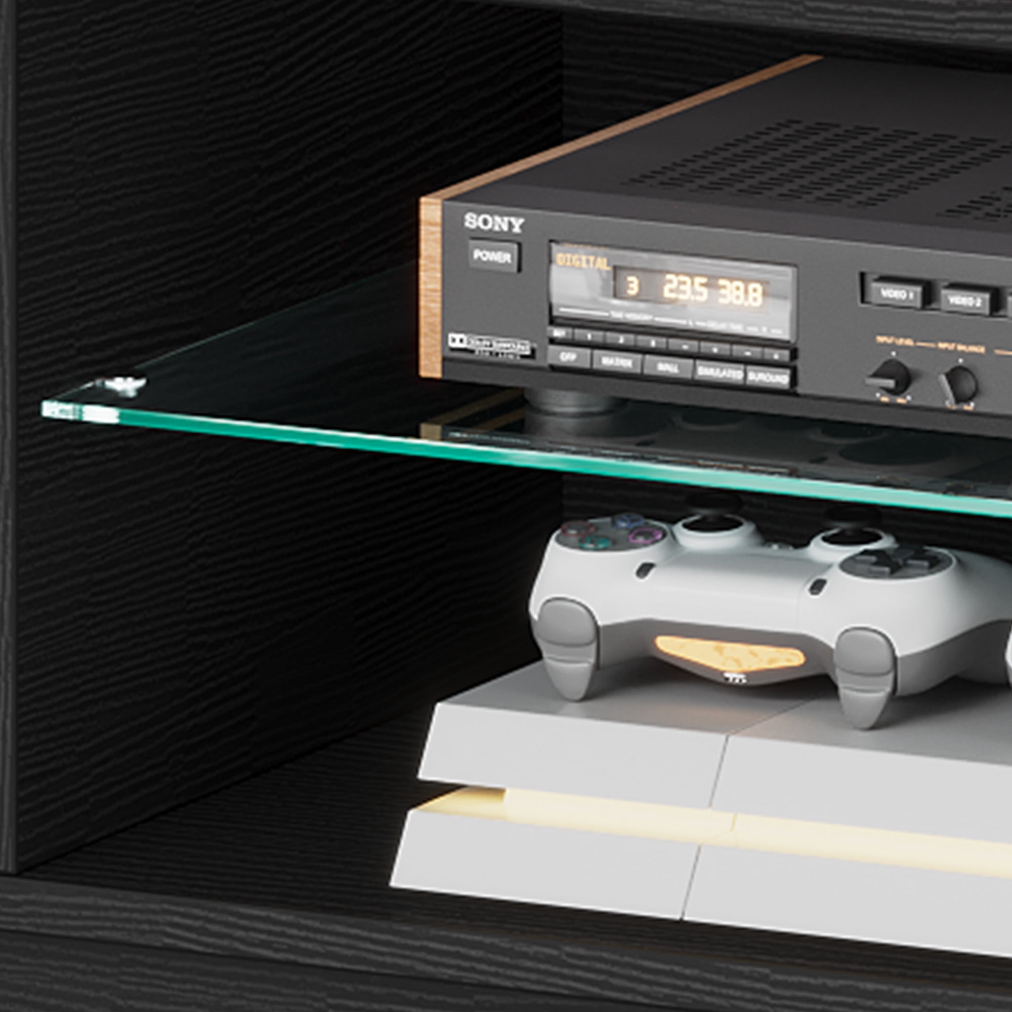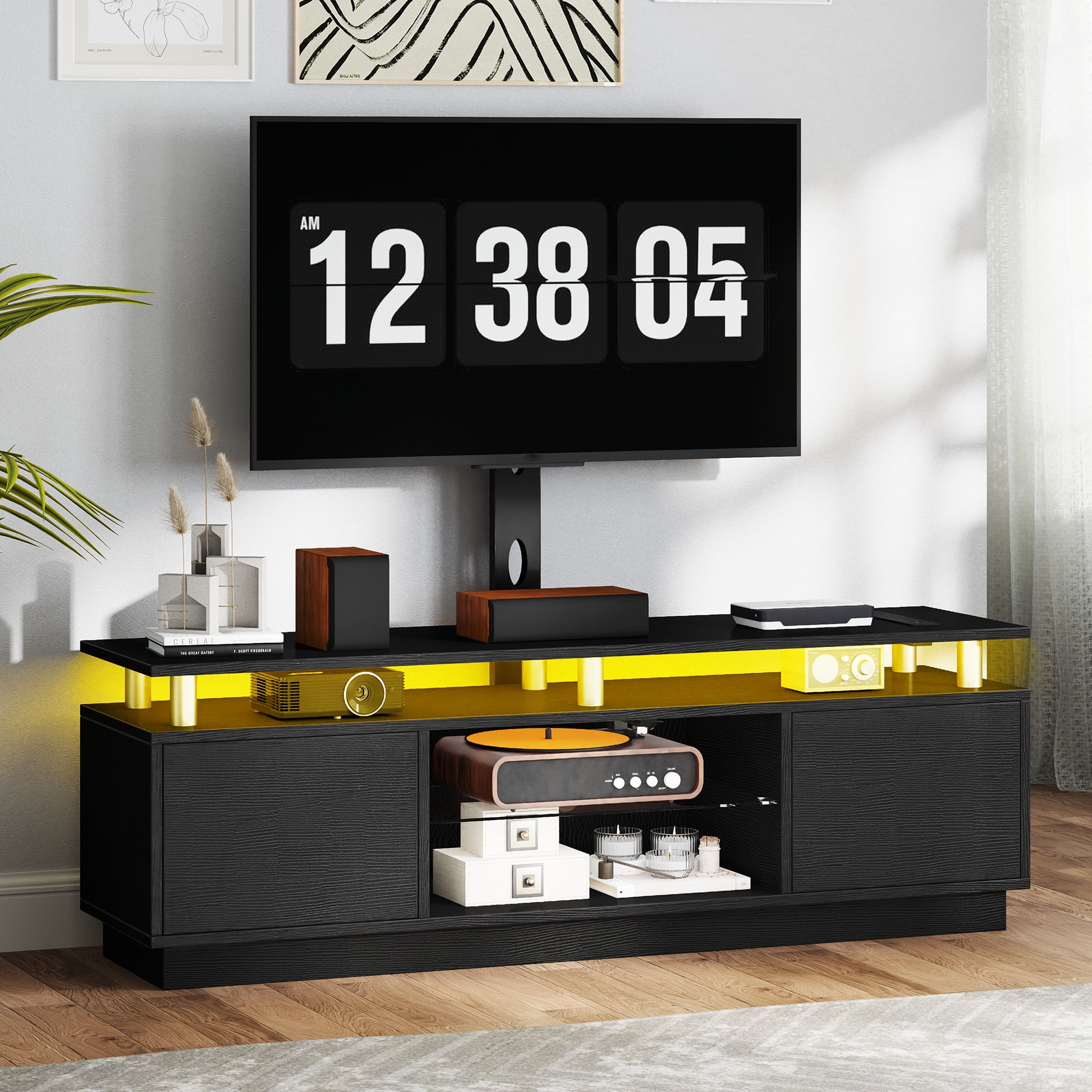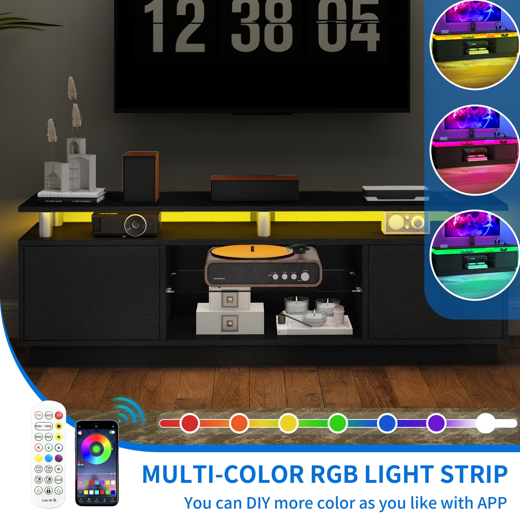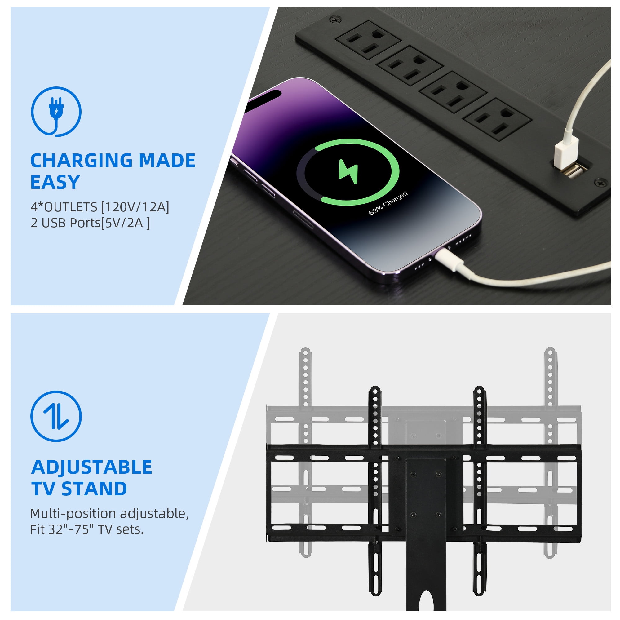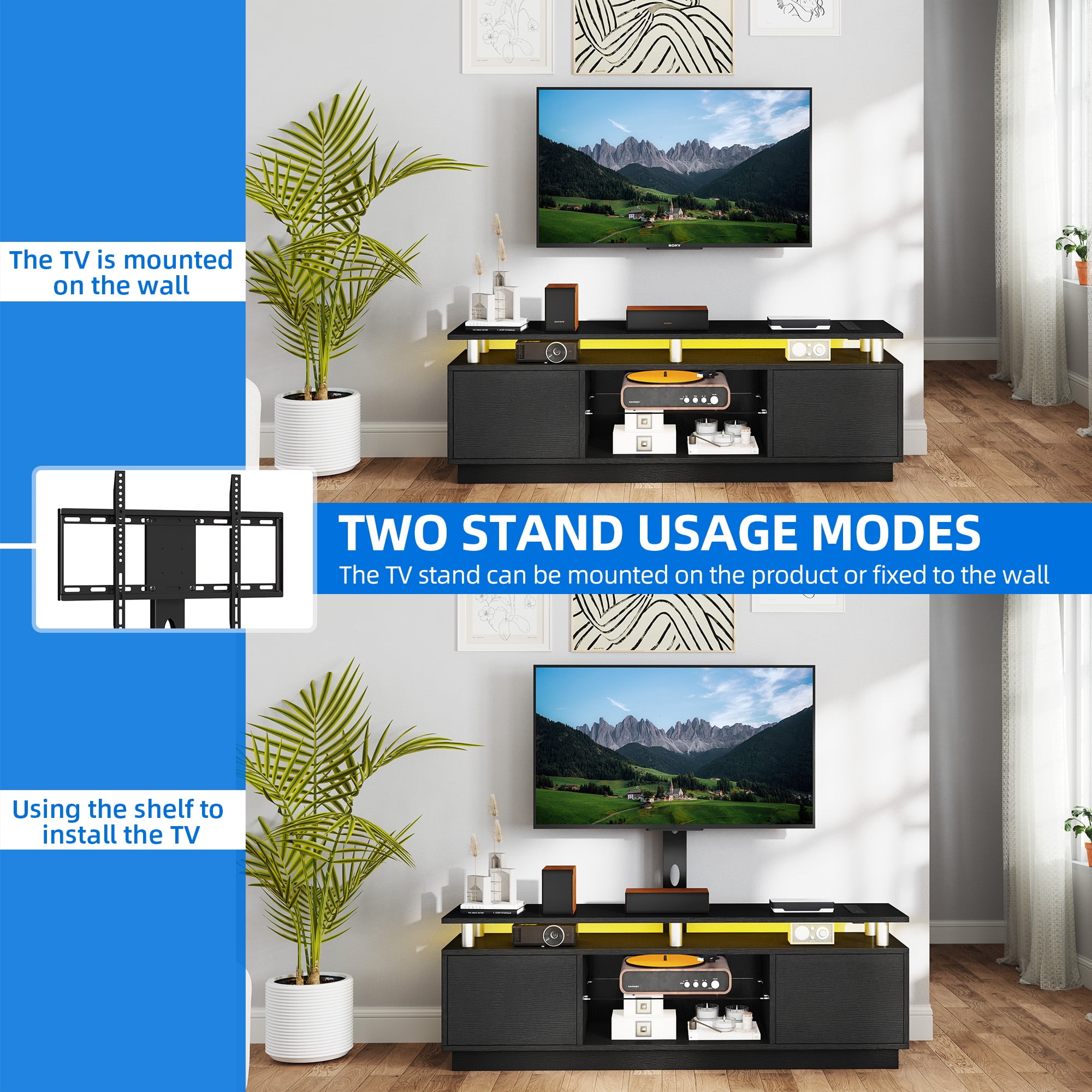 Adjustable TV Mount: Boost your viewing experience with our adaptable TV mount, suitable for TVs ranging from 32″ to 75″. It allows you to adjust the angle for the best view, whether you want it up, down, left, or right. For a more elevated setup, wall mounting is also an option. Convenient Power Access: Keep your devices powered up with 4 AC outlets and 2 USB ports conveniently located on the tabletop. Ideal for gaming consoles, phones, and tablets, ensuring they’re always ready for use. Durable and Spacious Storage: Crafted from strong engineered wood, this entertainment center offers ample storage with 4 open areas and 2 hidden compartments, keeping your space organized and clutter-free. The tempered glass is designed to be break-proof, ensuring durability. Ambient LED Lighting: Set the mood for any occasion with adjustable LED lights. Easily change the colors and brightness to match the atmosphere, whether it’s a party or a cozy movie night. The cabinets feature a press-to-open design for a sleek and modern look. Simple Assembly Process: Assembly is a walk in the park with clear instructions and numbered parts, making it beginner-friendly. Our expert support is on hand to ensure a smooth and enjoyable setup experience.