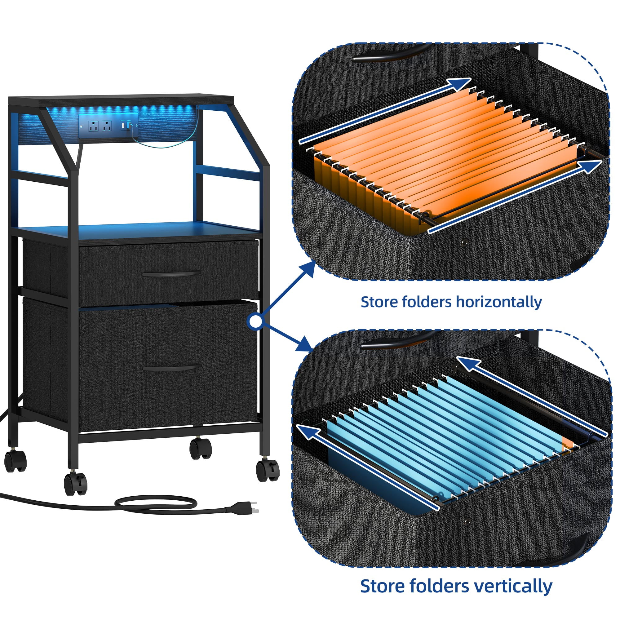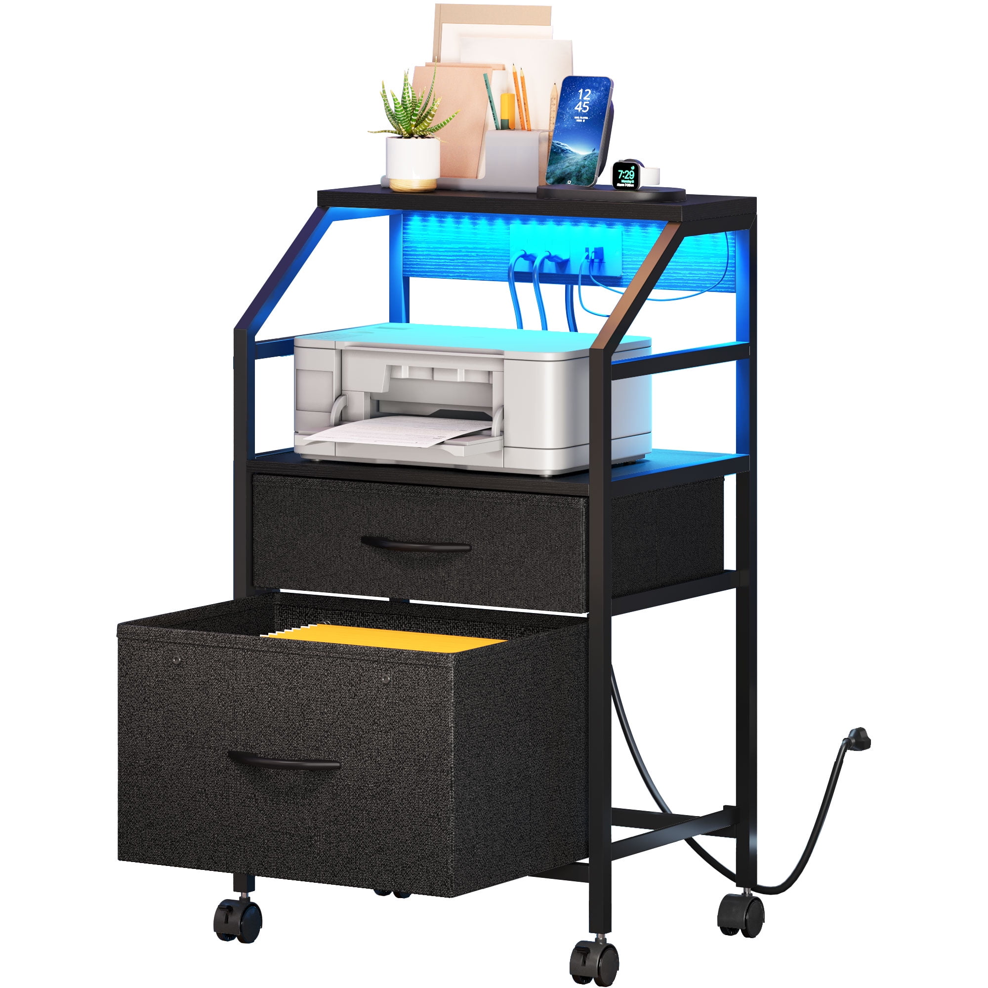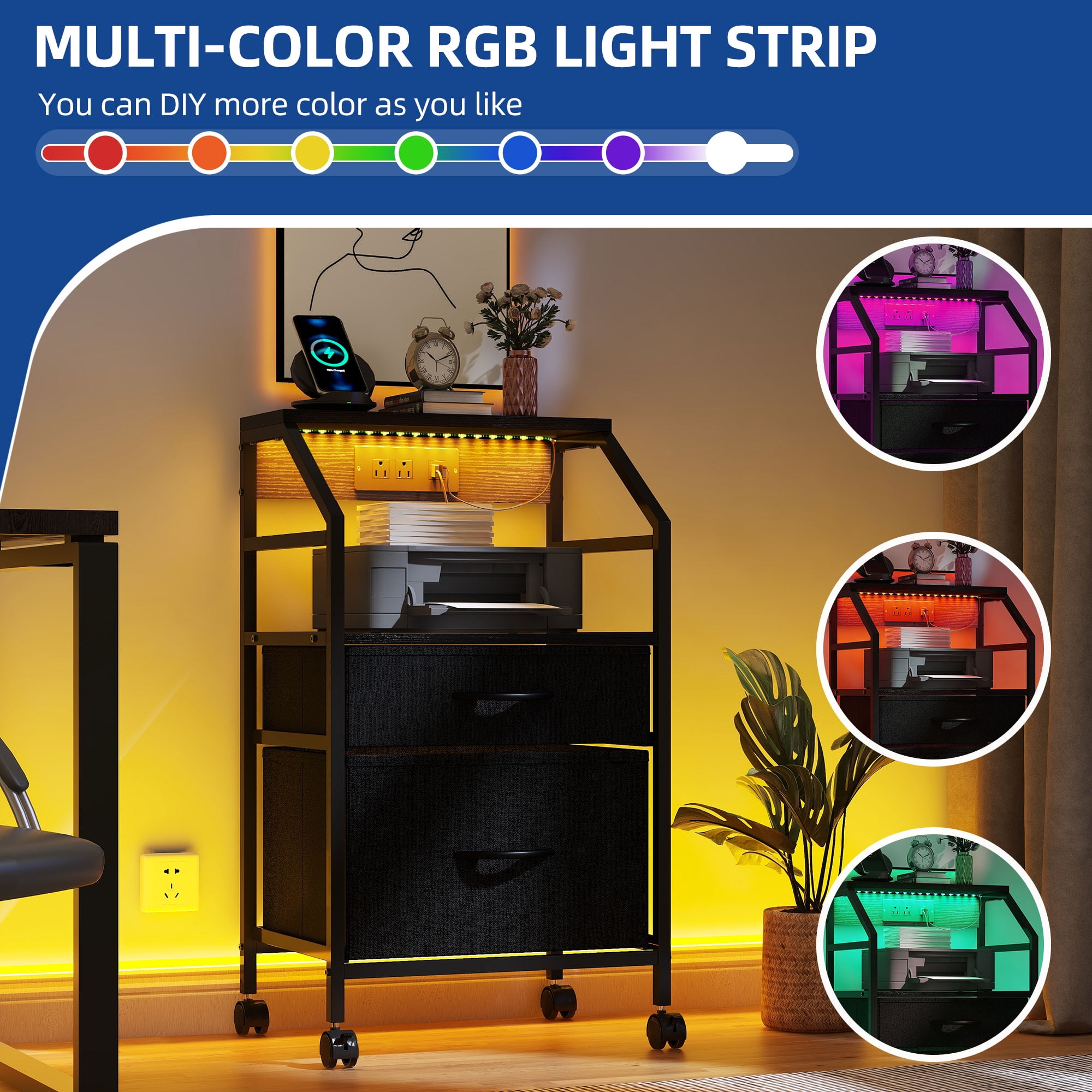 Dual Drawers File Cabinet: Organize effortlessly with a bottom drawer for letter or A4 files, a top drawer for office essentials, and a roomy top surface for your printer, ensuring easy access to everything you need. Charging Convenience: Our vertical filing cabinet features 2 AC outlets and 2 USB ports for keeping your devices powered. With an extended cord, it adds extra convenience while maintaining a tidy workspace. Dynamic Lighting: Elevate your home office with Bluetooth-enabled dynamic lighting in our file cabinet. Adjust settings effortlessly for a personalized workspace ambiance, from soothing to invigorating, enhancing your workspace with ease. Strong & Stylish: Crafted with a simple, dependable layout. The robust steel frames ensure stability, while robust fabric drawers securely hold your office items, maintaining their shape and offering a sleek appearance. Convenient Mobility & Assembly: Four robust casters ensure easy relocation. Its easy-to-clean design is ideal for any home office and ensures straightforward assembly. Enjoy your new filing cabinet effortlessly!
