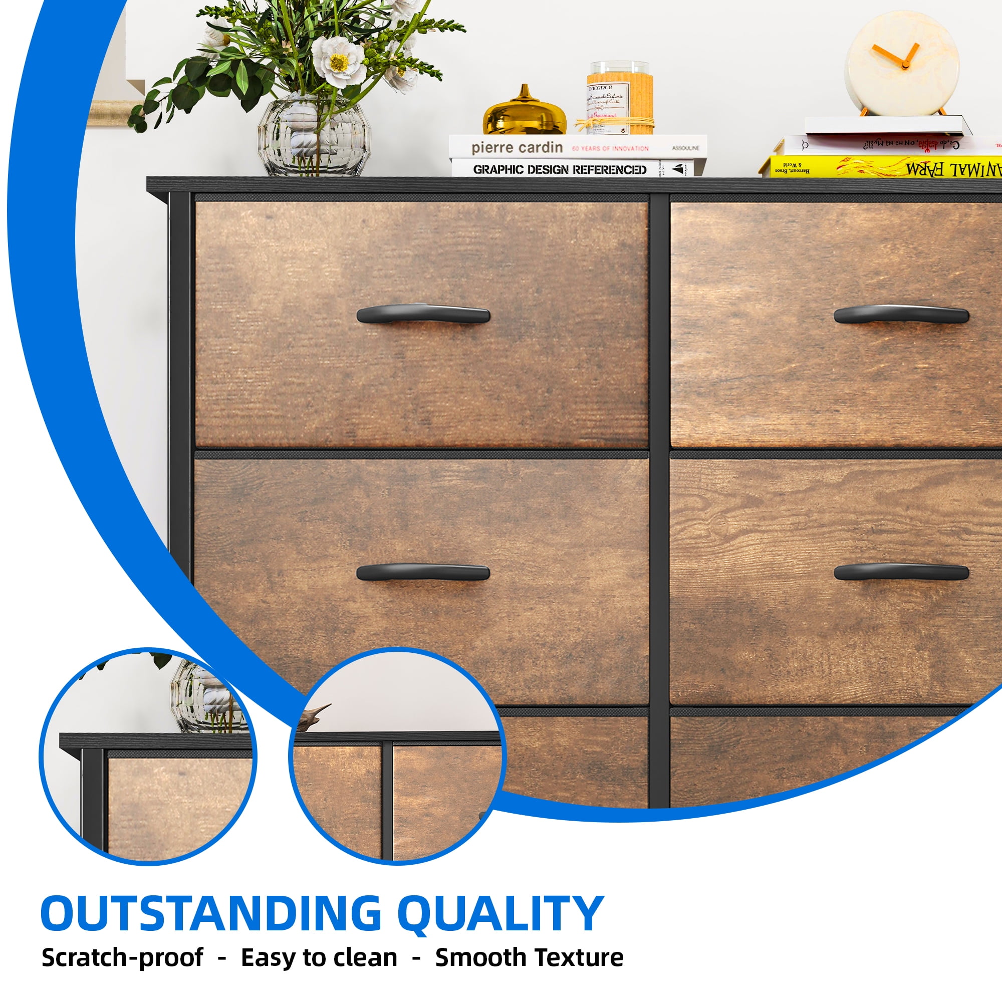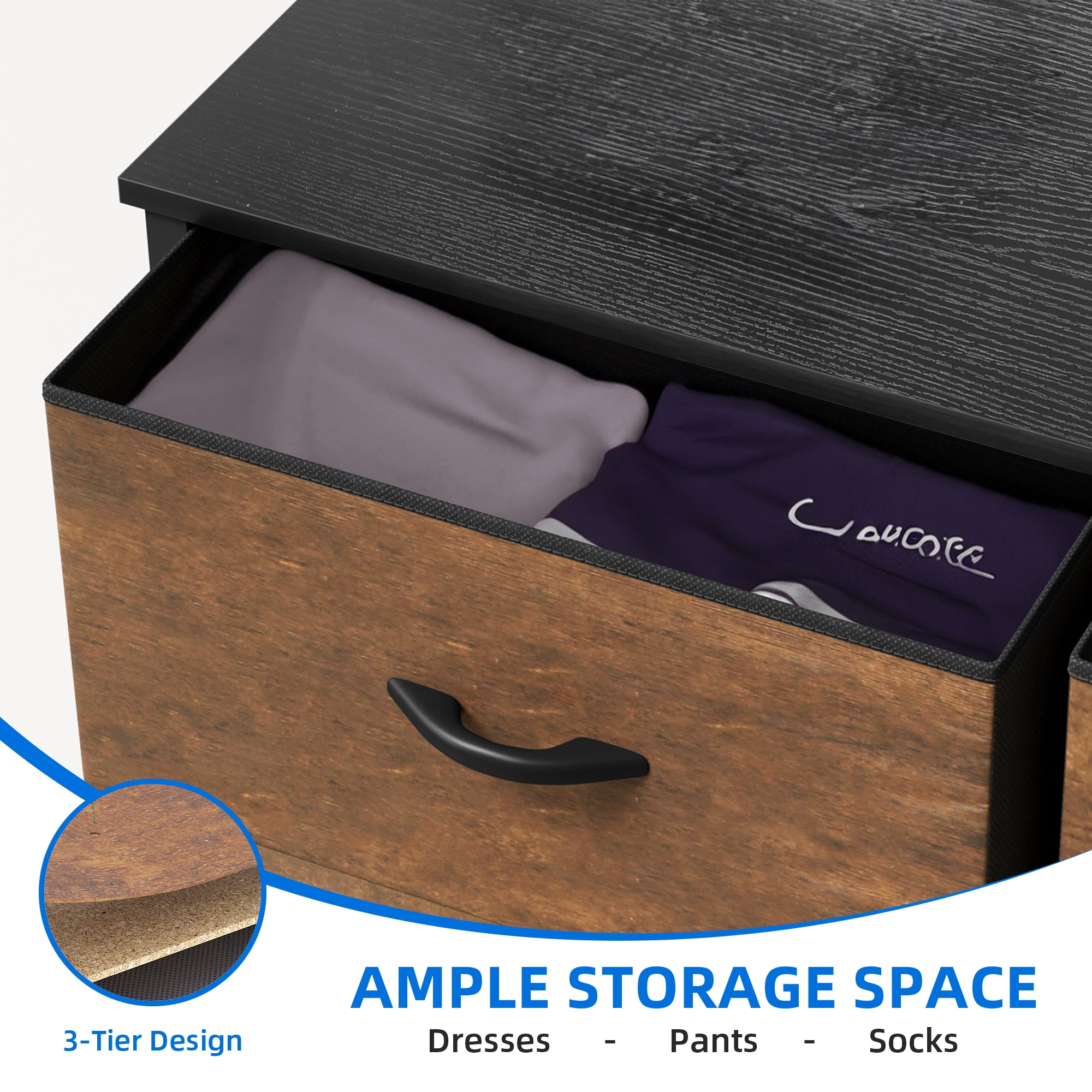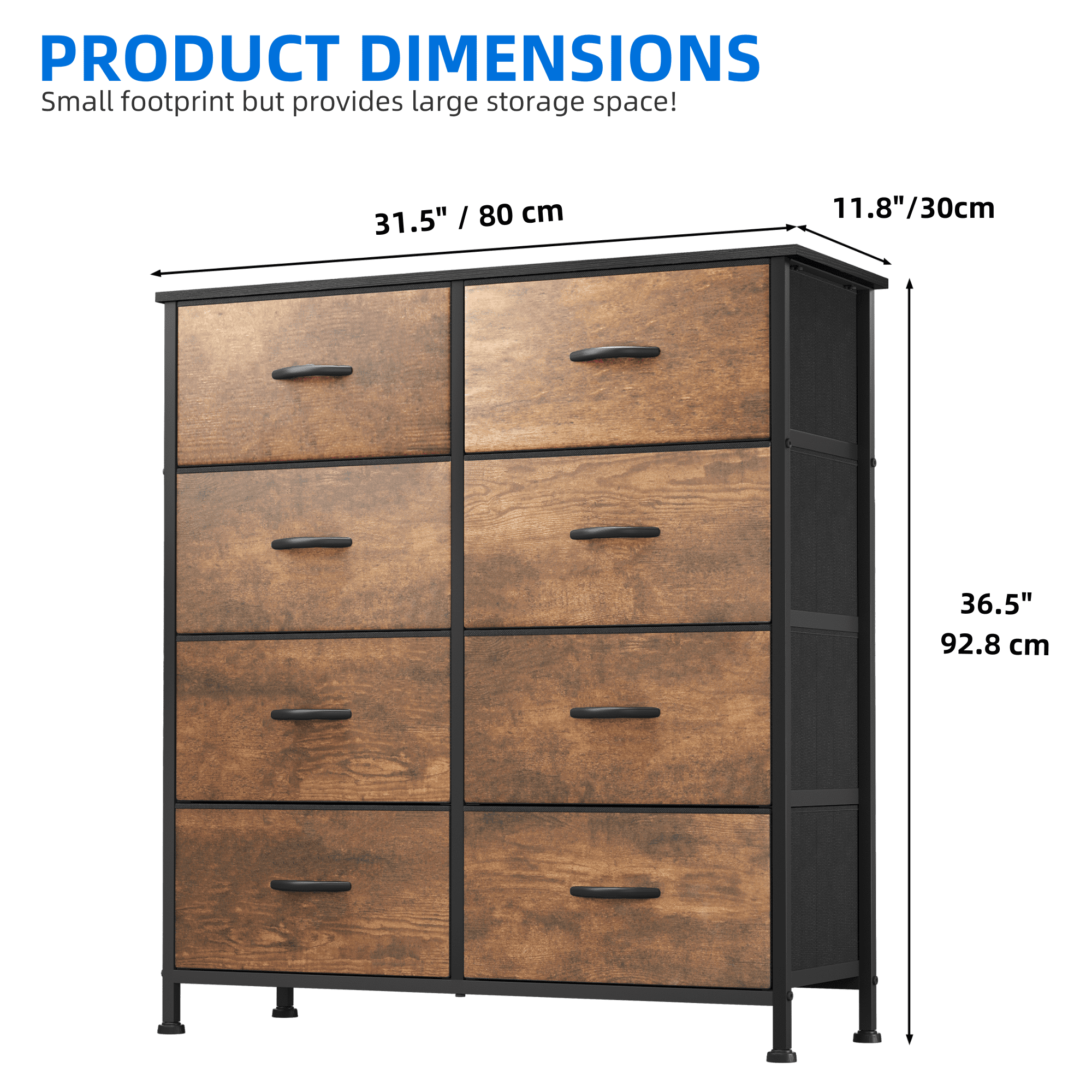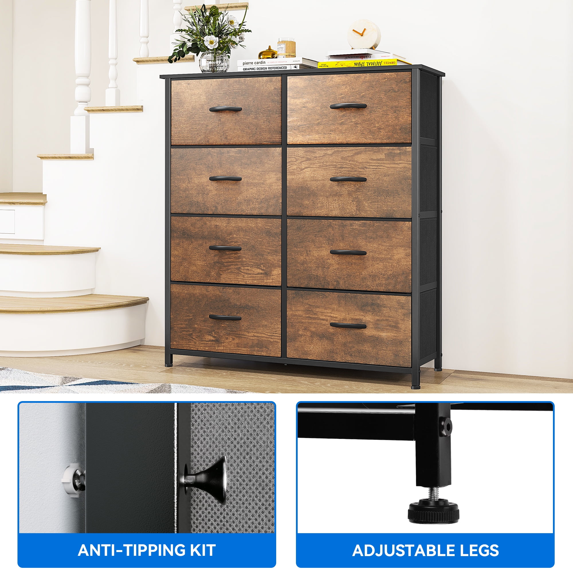 Ample Storage for Organization – Designed for adults and teens, this 8-drawer fabric dresser efficiently stores clothes, scarves, socks, T-shirts, pants, sunglasses, books, and more. Overall dimensions: 33.7″ L x 11.8″ W x 38.4″ H. Drawer dimensions: 15.5″ L x 11″ W x 8.4″ H. Quick & Easy Assembly – Includes detailed instructions and an installation video for a hassle-free setup. All necessary parts and accessories are provided, requiring only a few screws to be tightened. Premium Fabric Drawers – Features high-quality cationic polyester fabric fronts, with breathable, non-woven synthetic fabric on the sides for durability and easy maintenance. Simply wipe clean with a damp cloth and air dry. Modern & Versatile Design – This dresser blends rustic brown fabric drawers with a sturdy black metal frame, a crossbar design, and a wooden top. Perfect for bedrooms, living rooms, hallways, entryways, and closets. Secure to the wall with included screws for added safety.
