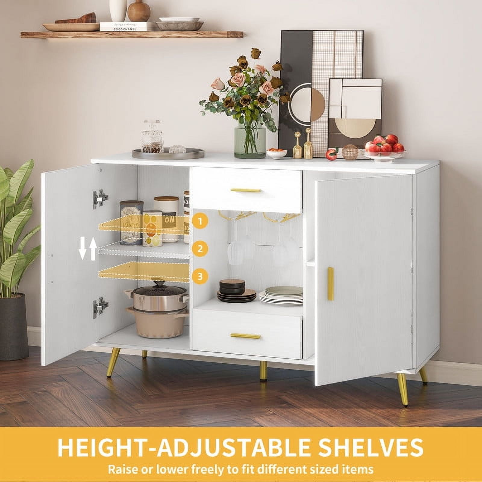 Uforic Sideboard Buffet with Doors& Drawers Buffet Cabinet with Adjustable Shelf& Wine Glass Holder, Modern Coffee Bar Cabinet for Living Room, Dining Room,White