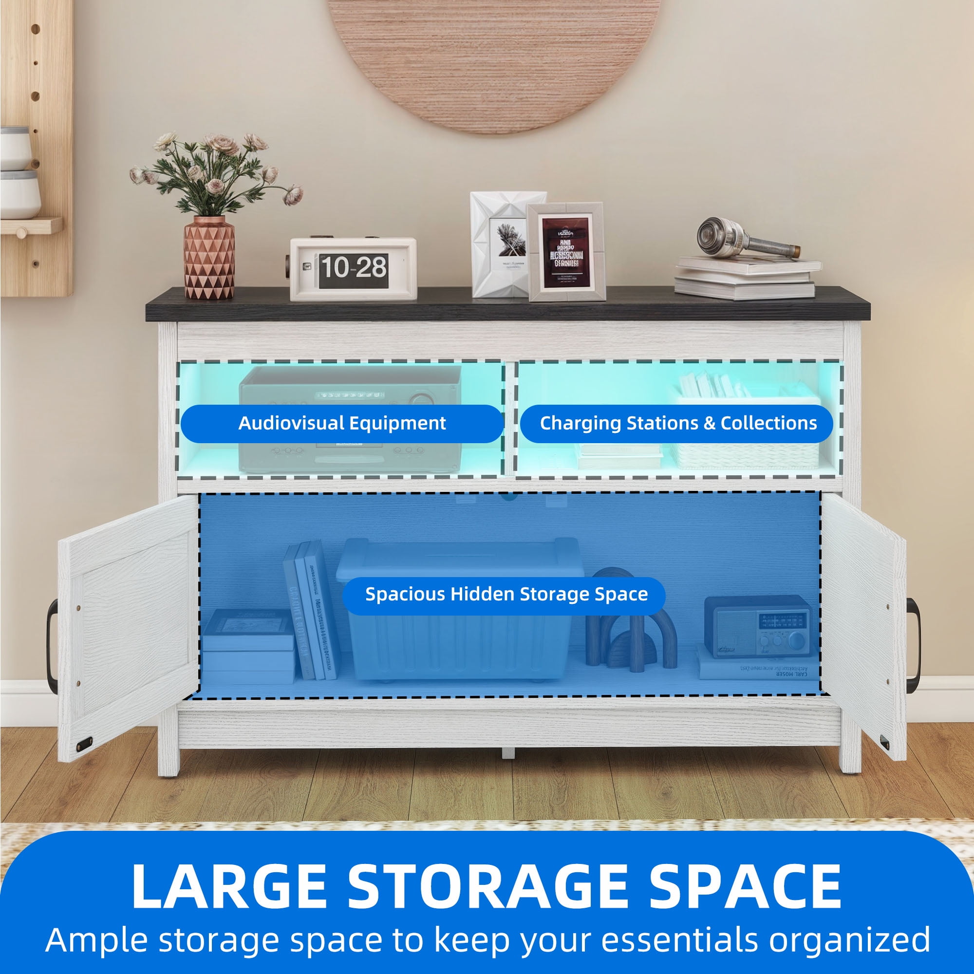 Imagine cozy movie nights with the ideal mood lighting, thanks to this TV stand’s built-in light strip! Made from sturdy materials, it offers plenty of storage for all your entertainment essentials. The black and white finish adds a touch of modern farmhouse style that complements any decor. Plus, it has built-in outlets and USB ports to keep all your devices charged and ready to go. This stand is the ultimate blend of style and functionality for your living room.