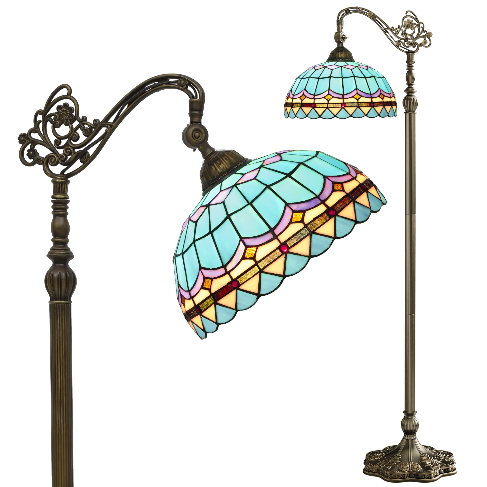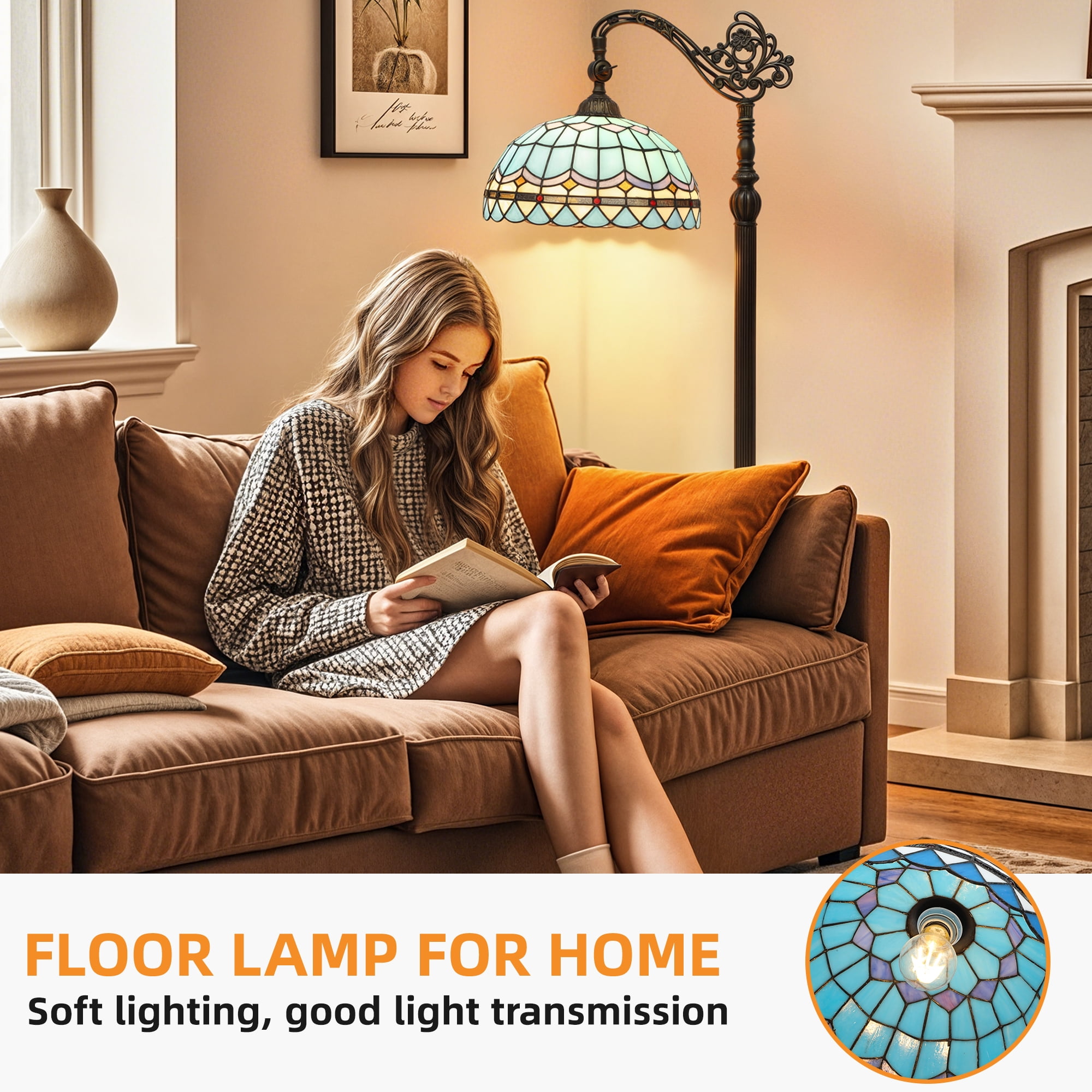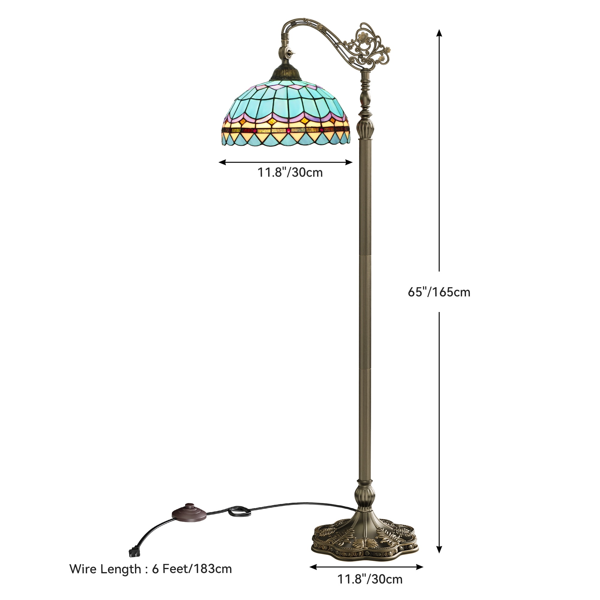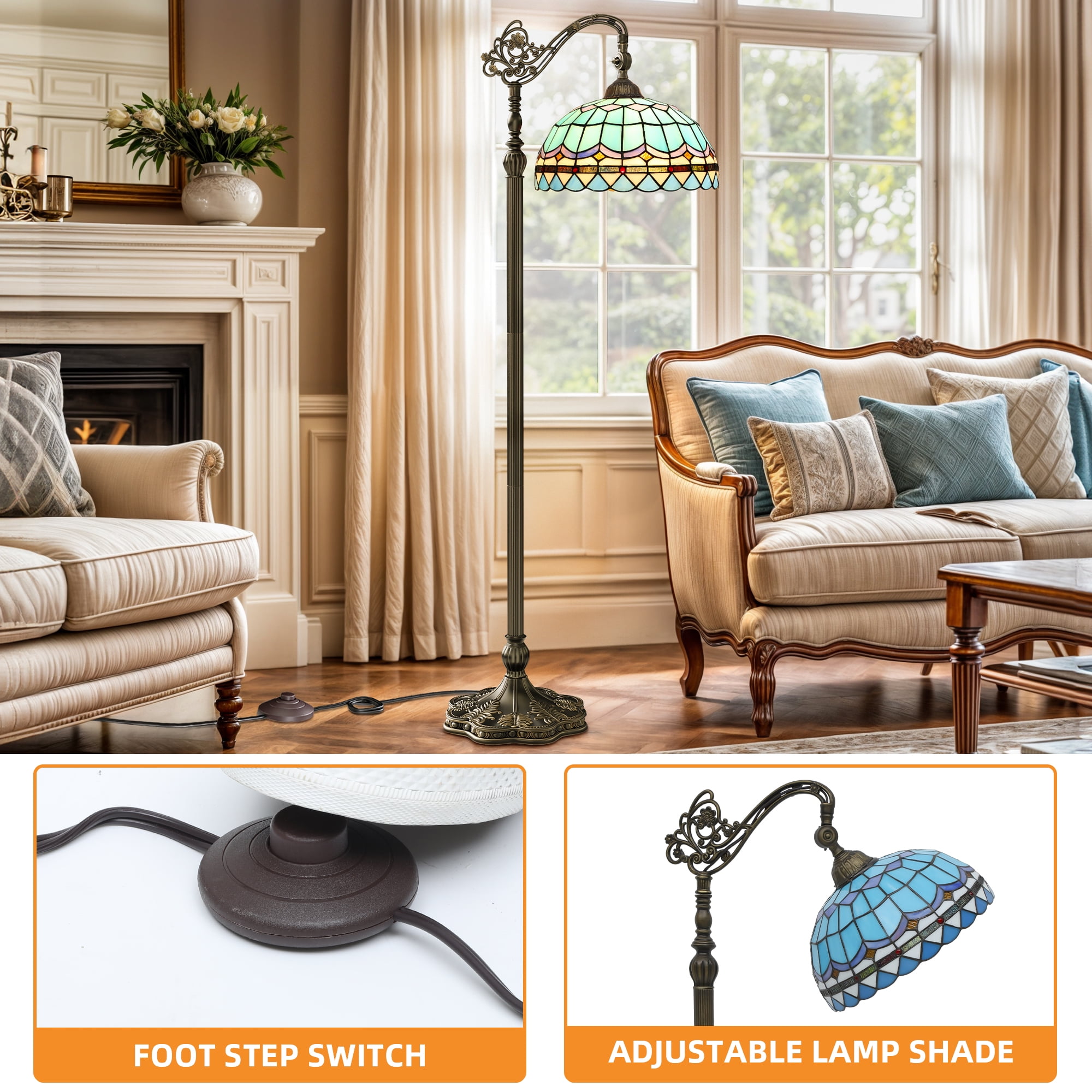 Certified Safety: Our Tiffany floor lamp is UL certified for use with a 120V power supply and features a convenient foot switch for easy operation. Equipped with an E26 socket, it accommodates various light sources (bulb not included) up to 100W Effortless Setup: This Tiffany floor lamp is designed for easy setup, with clear instructions for a hassle-free experience. Perfect for those who appreciate simple installation processes Adjustable and Versatile: Perfect for bedrooms, living rooms, and studies, this floor lamp provides adjustable lighting with a lampshade that tilts up to 90 degrees. The power cord extends about 156 inches, with a visible length of around 76 inches after assembly Robust and Sophisticated: Standing tall at 64 inches, the floor lamp boasts a handcrafted glass lampshade (φ31*18cm) and a sturdy resin base (Dia.280mm) in antique bronze. Its weight ensures stability, preventing any accidental toppling Artisanal Lampshade: The glass lampshade changes color from dark to vibrant with high-watt bulbs, adding beauty. Each lamp is uniquely handcrafted with slight variations. Before use, gently wipe off any residual protective oil with a soft cloth