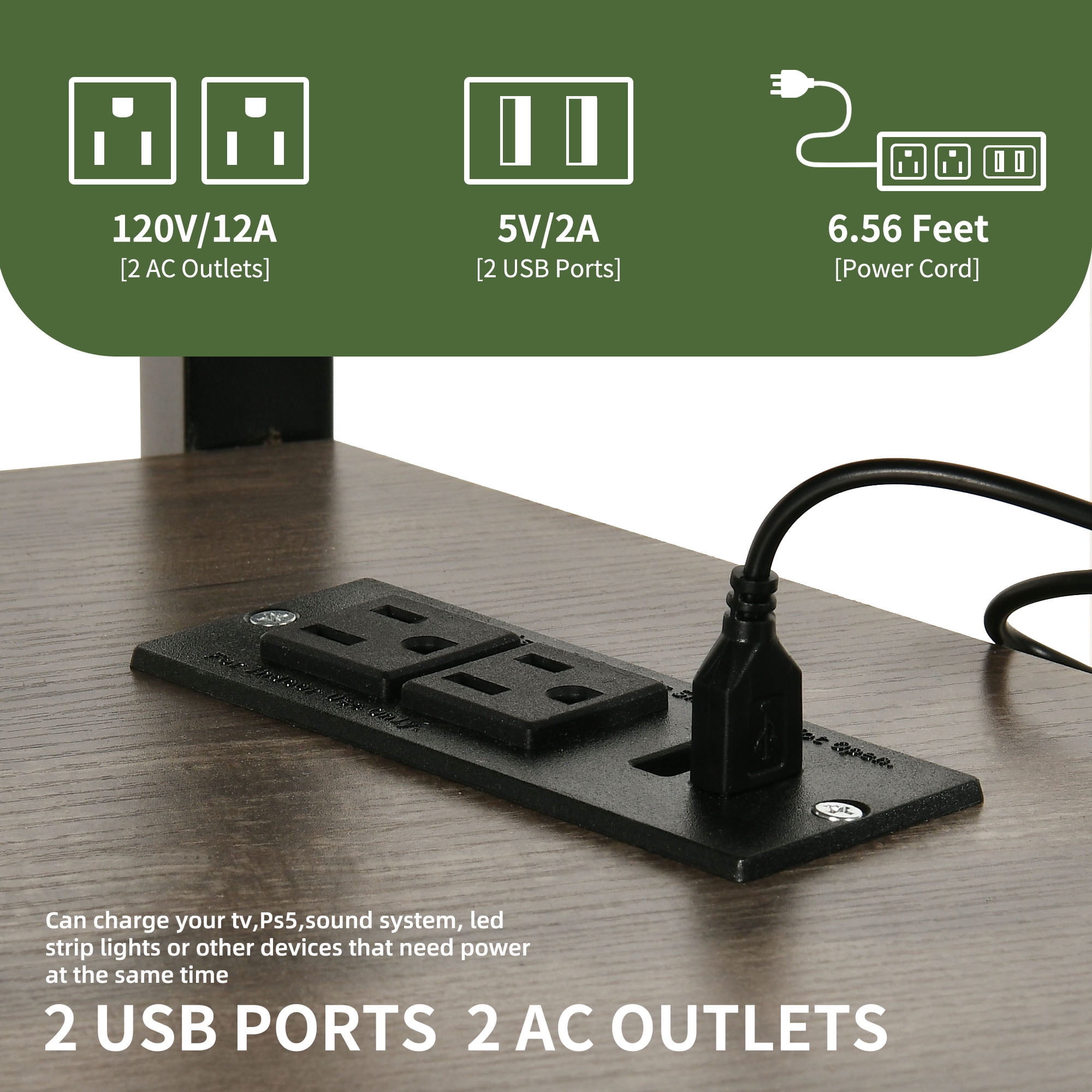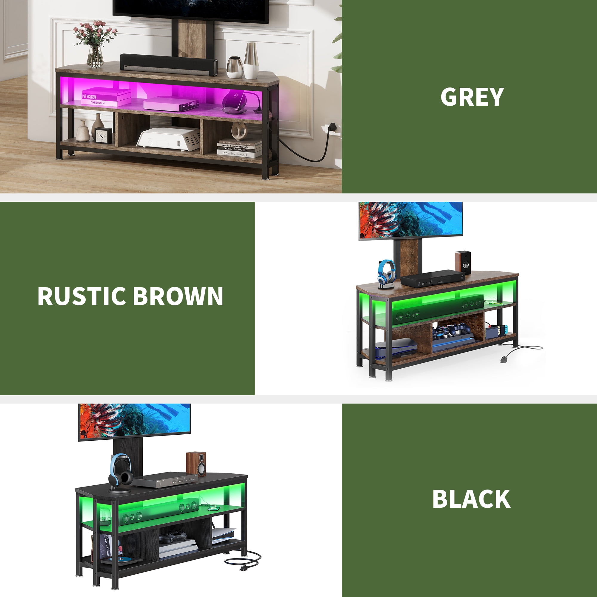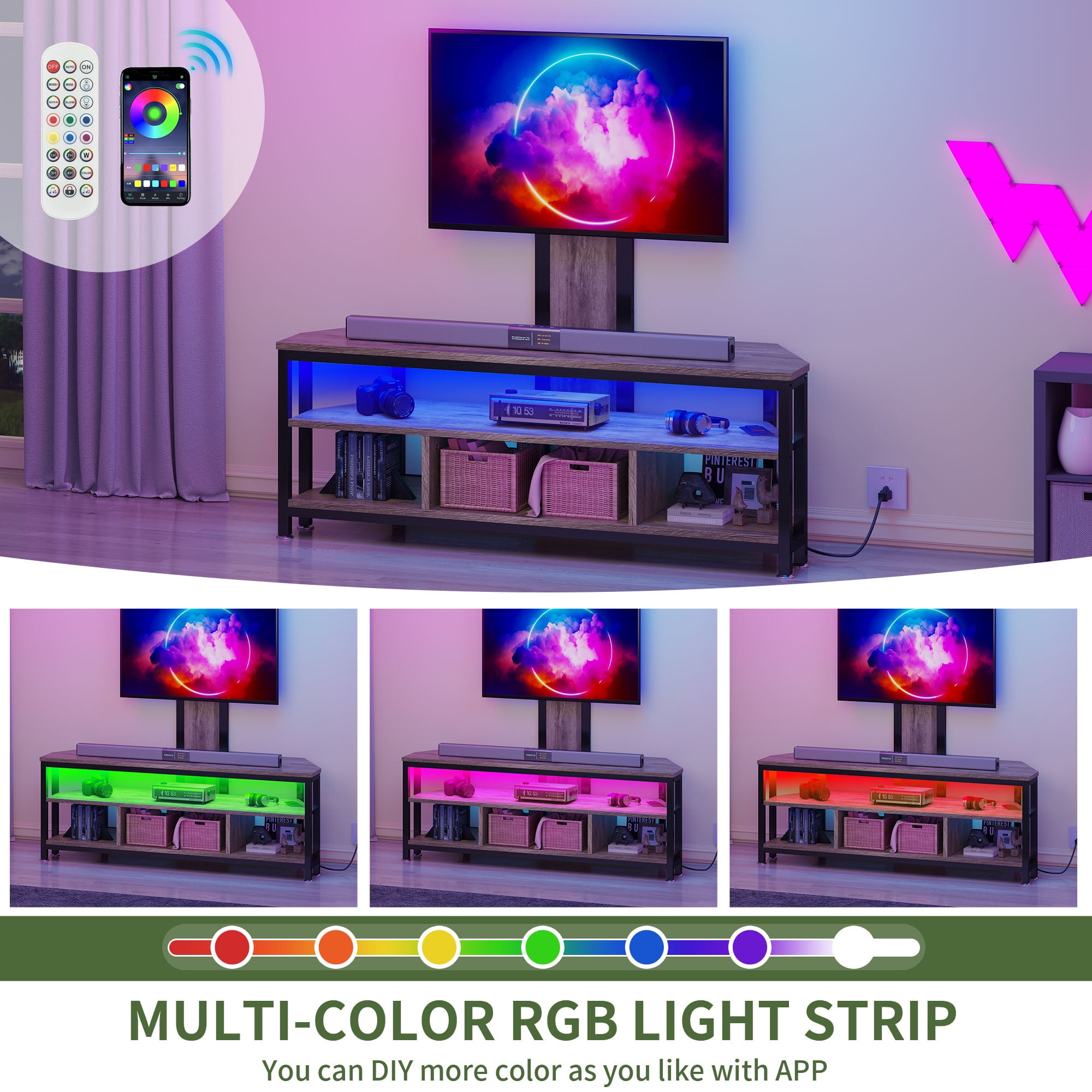 Secure TV Mounting: The TV stand is designed to securely hold your TV on any table, providing stability and safety. The universal TV mounting bracket accommodates a wide range of TV sizes, from 32 to 70 inches, offering versatility and convenience. Ample Storage: With three open shelves, this TV stand provides generous storage space for organizing DVDs, books, decorative items, and more. This blend of fashion and functionality enhances your living space while keeping your entertainment essentials organized. Smart LED Lights: Elevate your viewing experience with the built-in RGB LED strip, controllable via a wireless remote. Choose from 20 colors and 19 dynamic modes to create a captivating home theater ambiance, adding a touch of style and sophistication to your entertainment setup. High-Quality Safety Features: The TV stand includes a built-in power strip with four AC power outlets, offering convenient charging options for your TV, gaming devices, and other electronics. This feature helps maintain a clutter-free and organized entertainment area. Reliable Construction: Crafted from sturdy particle board, this TV stand is durable and scratch-resistant. It can support up to 110 pounds for the tabletop and 200 pounds for the television, ensuring stability and longevity. The materials used meet high standards for quality and environmental friendliness, complying with EPA TSCA Title VI and Carb Certification requirements.