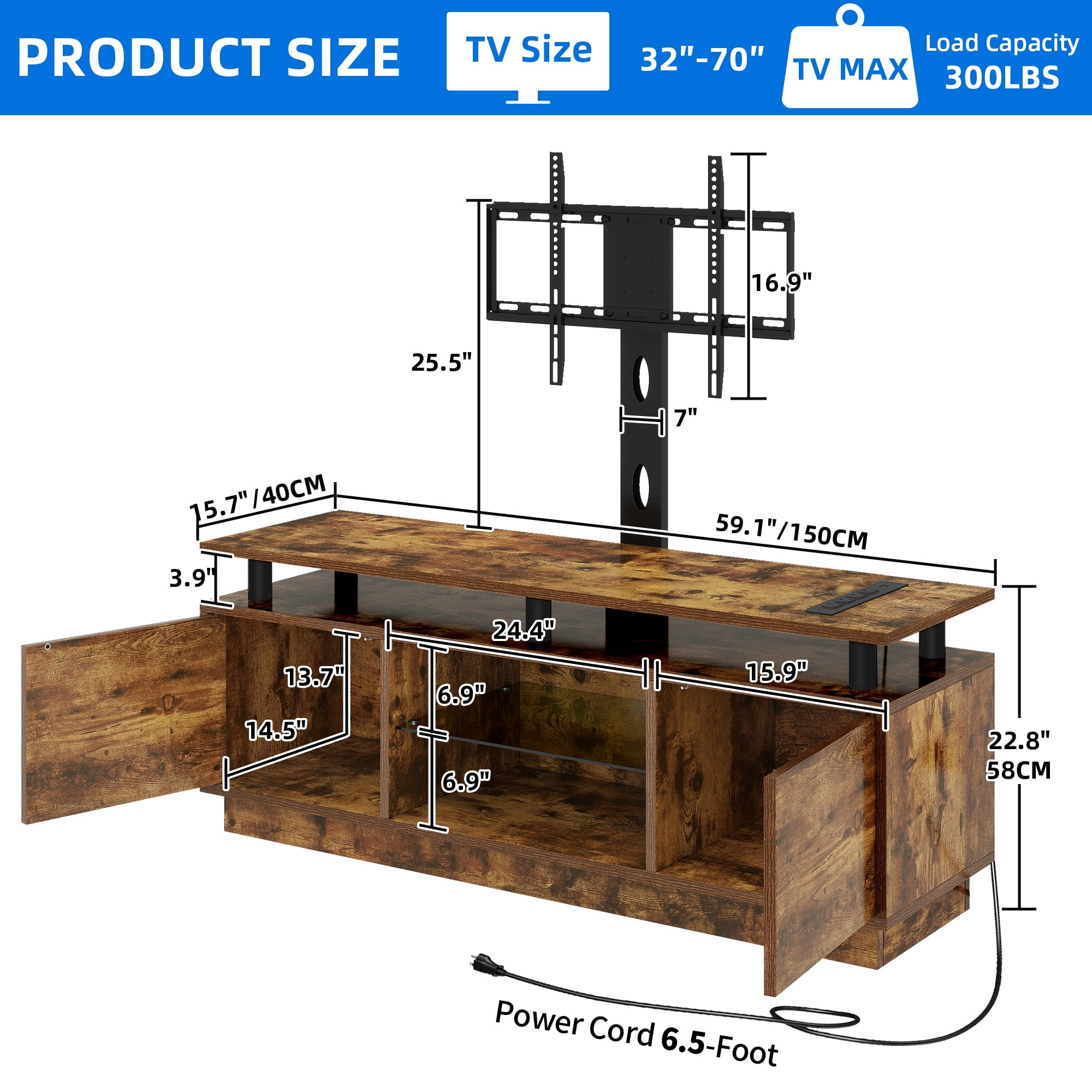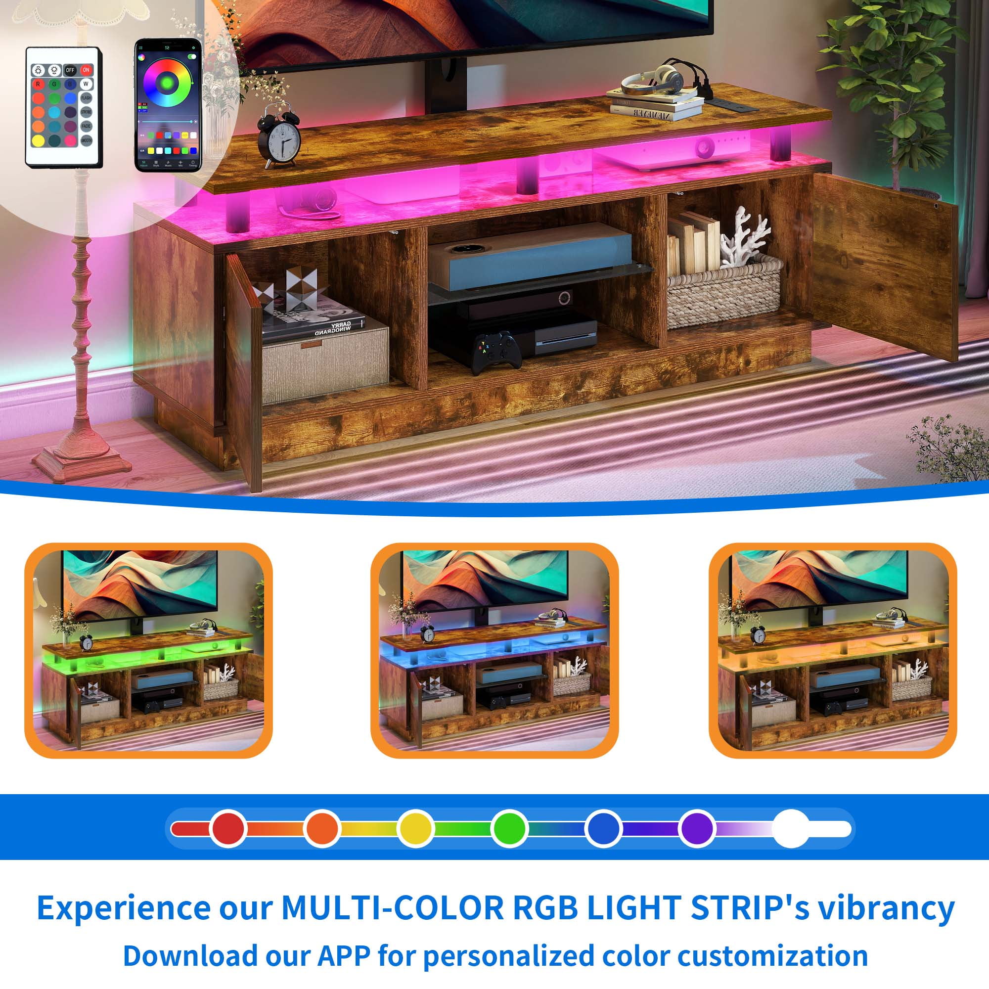 Adjustable TV Mount: Enhance your viewing experience with our versatile TV mount, compatible with TVs ranging from 32″ to 70″. Adjust it to the perfect position, up, down, left, or right, for optimal viewing. For a higher setup, wall-mounting is also an option. Convenient Power Access: Keep your devices powered up with 4 AC outlets and 2 USB ports on the tabletop. Ideal for gaming consoles, phones, and tablets, ensuring they’re always ready for use. Durable and Spacious Storage: Crafted from strong engineered wood, this entertainment center offers ample storage with 4 open areas and 2 hidden compartments, keeping your space organized and clutter-free. The tempered glass is designed to be break-proof, ensuring durability. Ambient LED Lighting: Set the mood for any occasion with adjustable LED lights. Easily change the colors and brightness to match the atmosphere, whether it’s a party or a cozy movie night. The cabinets feature a press-to-open design for a sleek and modern look. Simple Assembly Process: Assembly is a walk in the park with clear instructions and numbered parts, making it beginner-friendly. Our expert support is on hand to ensure a smooth and enjoyable setup experience.