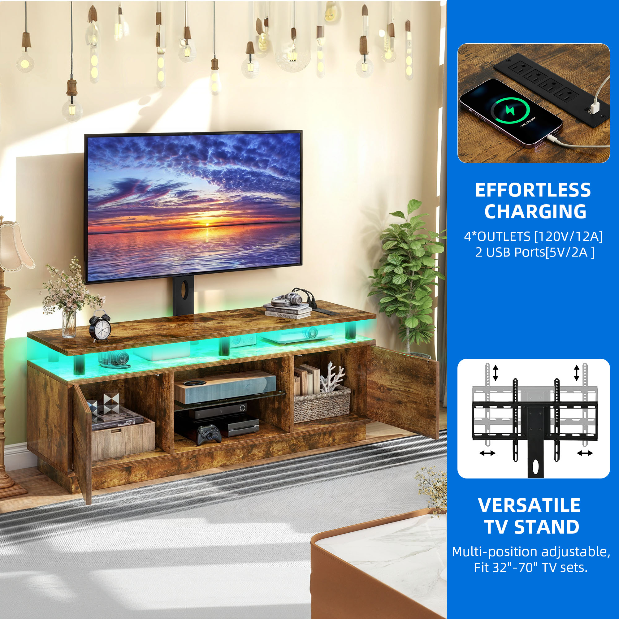 Revamp your living room, bedroom, or game den with this striking TV stand, perfect for TVs ranging from 32” to 70”. It features adjustable mounting options and vibrant LED lights to enhance your movie nights. Equipped with 4 AC outlets and 2 USB ports, it ensures your devices are always charged and ready for use. The stand offers 4 spacious storage areas and 2 hidden cabinets to keep your living space organized and clutter-free. Constructed from sturdy engineered wood and durable glass, this TV stand combines strength with style. Plus, with its easy assembly, you’ll be the DIY standout in your home!