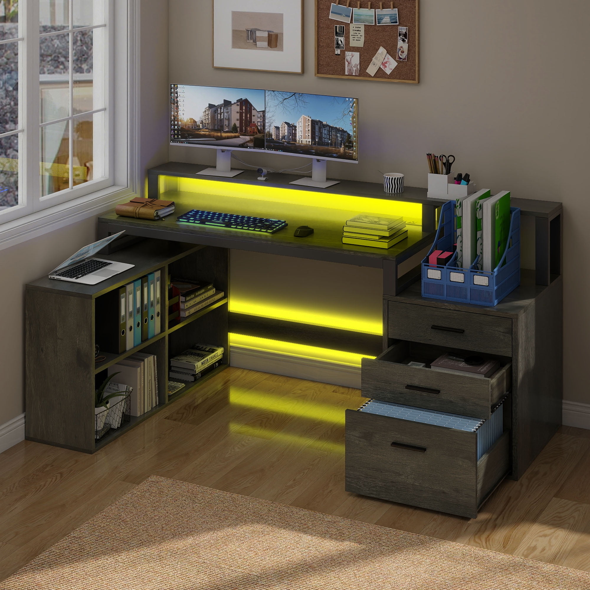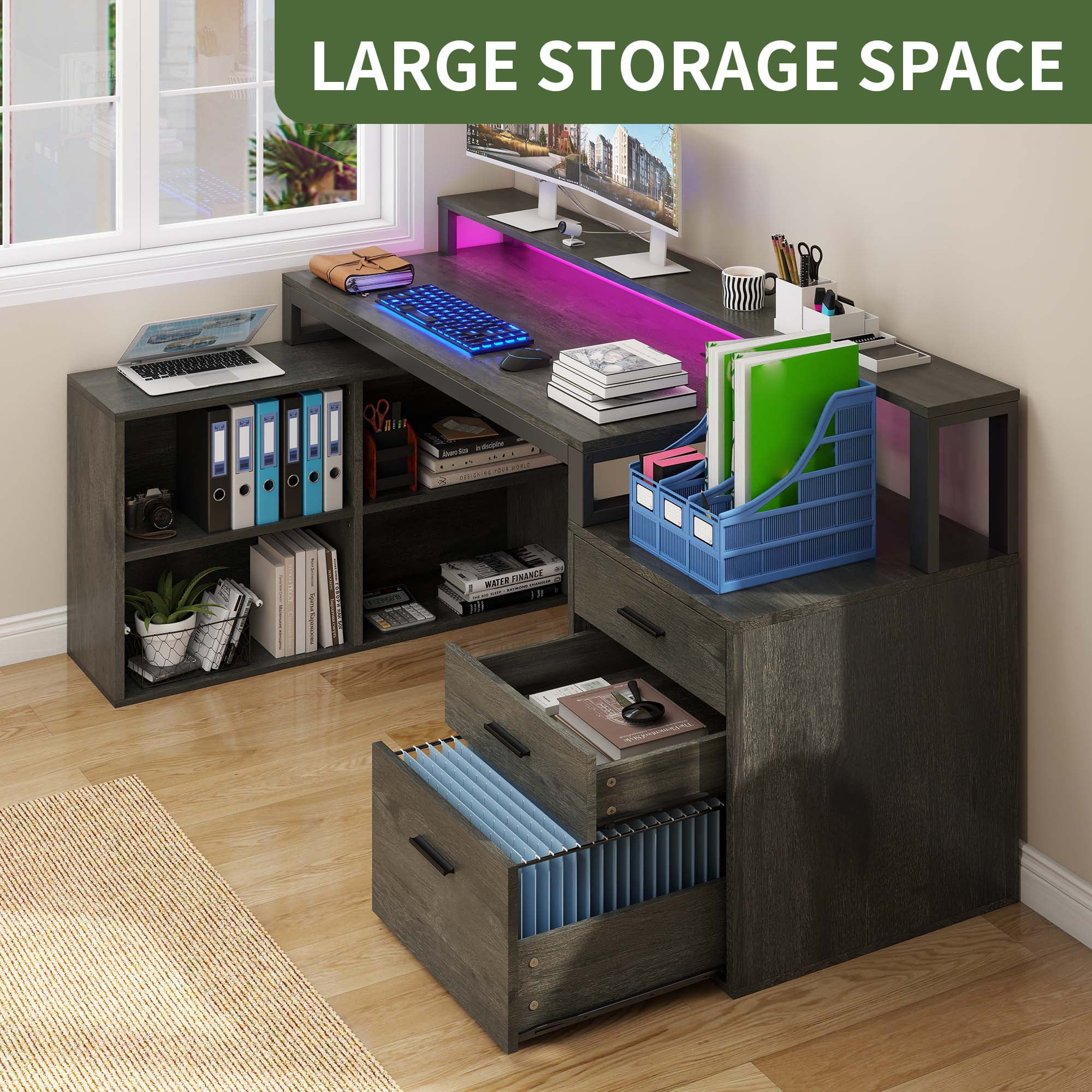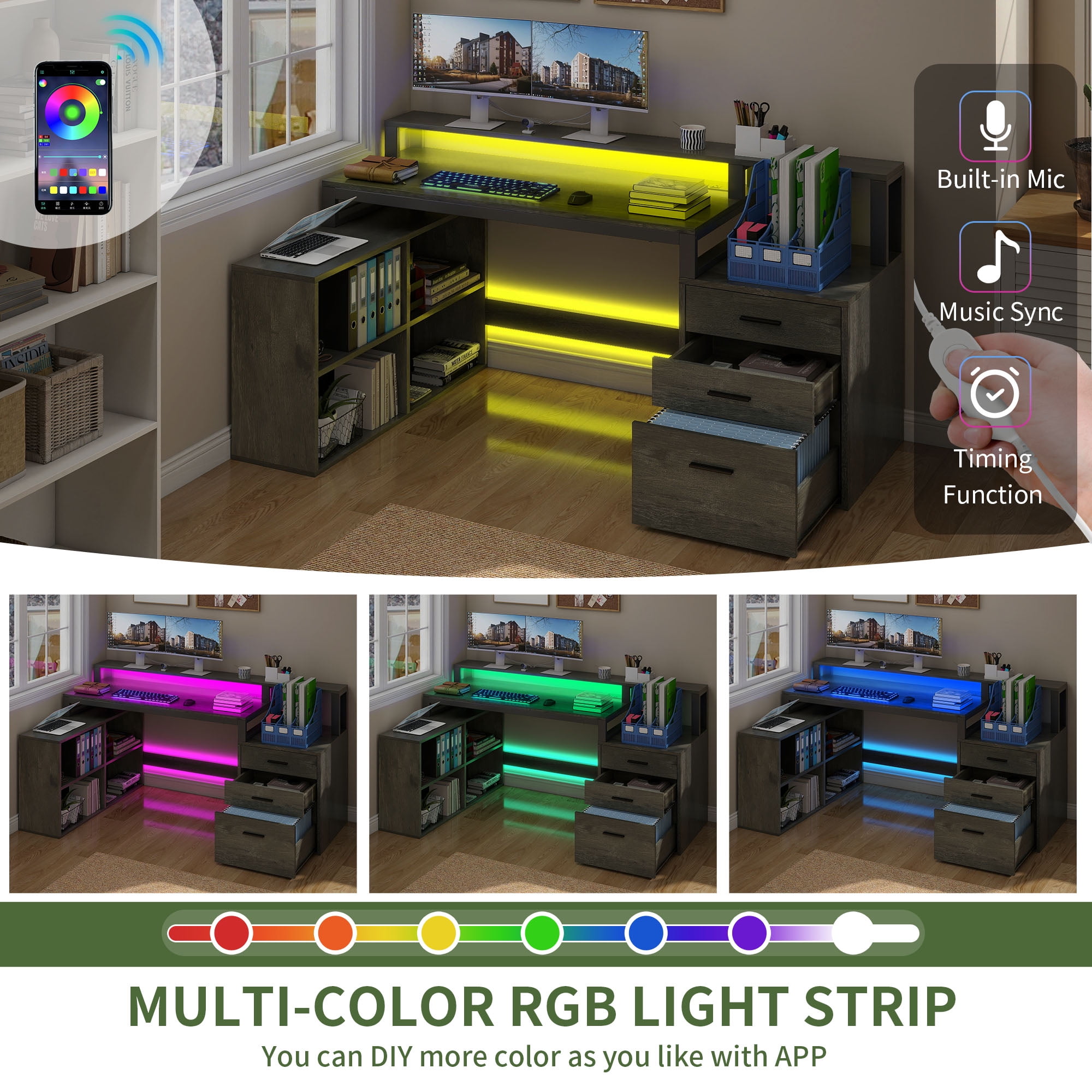 Upgrade Your Workday Vibes: Ready to elevate your productivity while working from home? Our L-shaped desk has you covered! With its spacious design and convenient features, it’s the ultimate workspace solution. Boost your workday experience. Curate Your Space: Our desk features a spacious tabletop and monitor stand, ideal for 2 monitors, a keyboard, and gadgets. Plus, it includes a printer stand, a large drawer for A4 and legal files, 2 smaller drawers, and 4 shelves for extra storage. Long-Lasting Appeal: Built from strong engineered wood, our computer desk ensures lasting longevity and dependability. It repels water and scratches, making it ideal for maintaining a polished look while standing up to daily use. Elevate Your Atmosphere: Transform your workspace with our desk’s colorful LED lights! Control them easily with a light strip switch or app, adjust the built-in mic, sync with music, and set timers for a personalized experience. Tidy Up, Power Up: Our desk includes 4 AC outlets and 2 USB ports, making it simple to charge your devices! Say goodbye to tangled cords and hello to a clean, efficient workspace that boosts your productivity and keeps you connected. Age_group: Adult