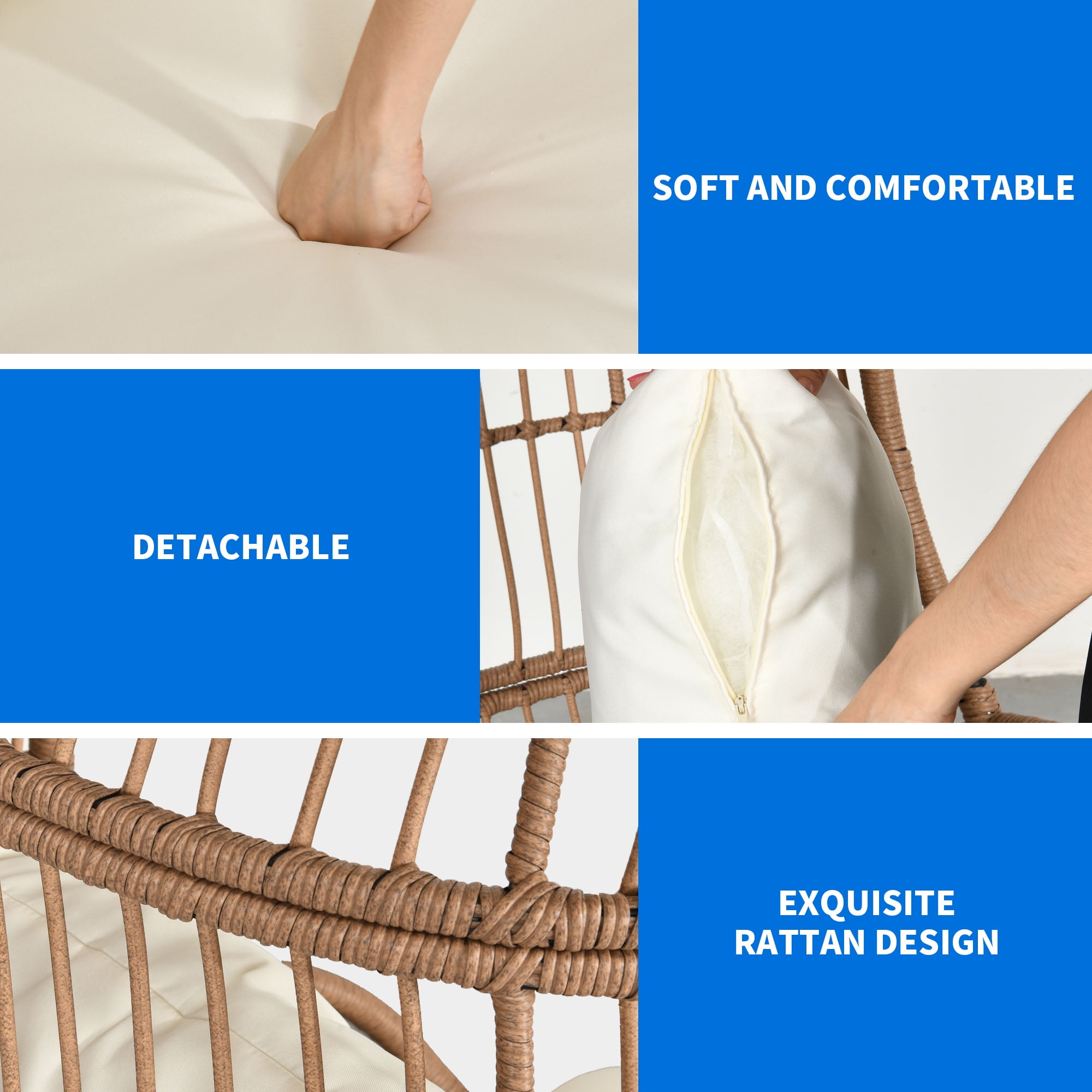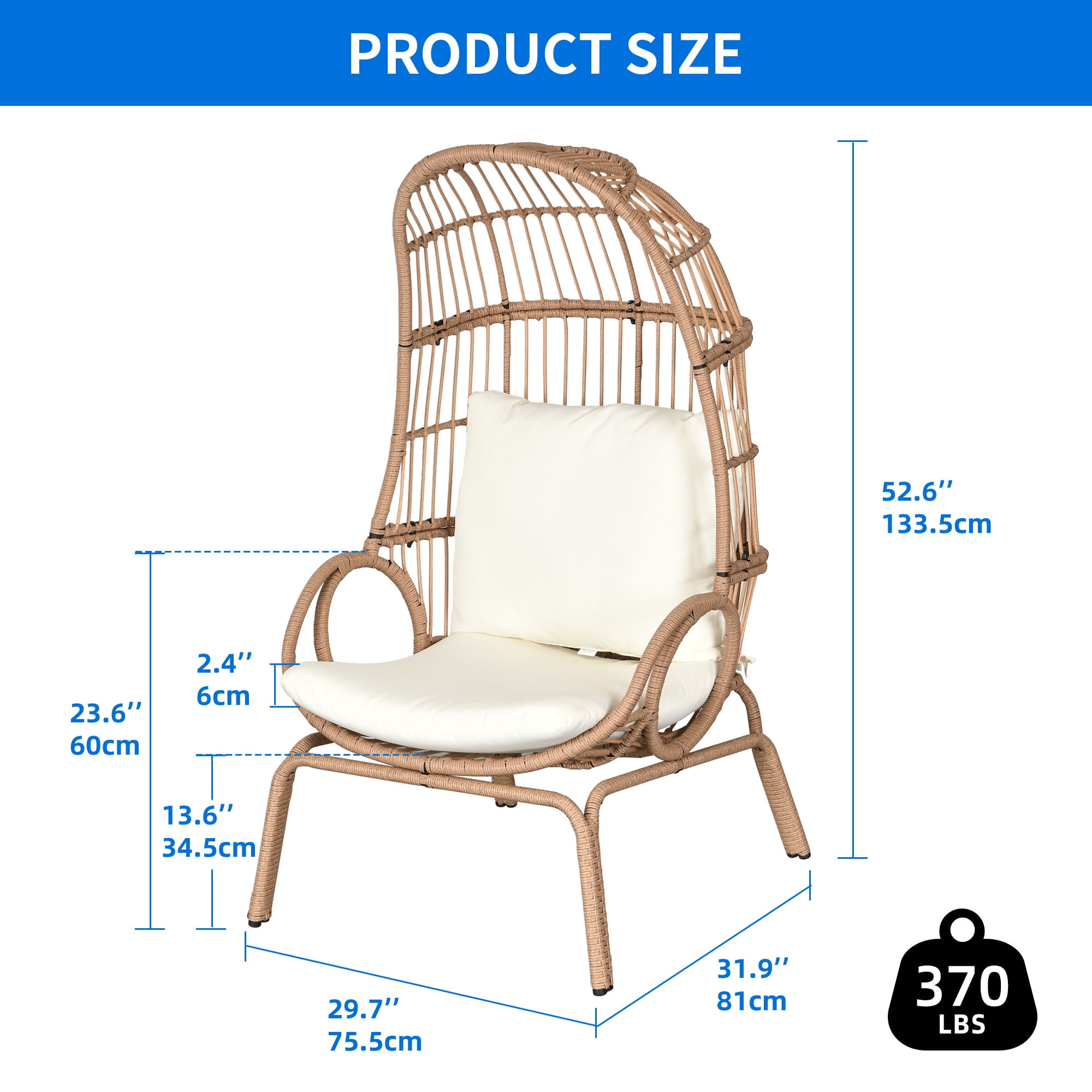 Introducing the outdoor slender wicker egg chair, a patio rattan basket chair capable of supporting up to 370lbs. These indoor egg chairs, accompanied by a stand and cushion, exude a cocoon chair essence ideal for the bedroom, patio, or balcony. Adorned in a refined beige tone, this piece offers a sanctuary of comfort and elegance, blending harmoniously with its environs.s. Specifications: Material: Wicker / Rattan Color :Beige egg chair: 29.7″D x 31.9″W x 52.6″H Weight Capacity:370 lb. Package Included: 1 x egg chair 1 x seat cushions 1 x sponge-padded back cushions 1 x accessories kit 1 x assembly instructions