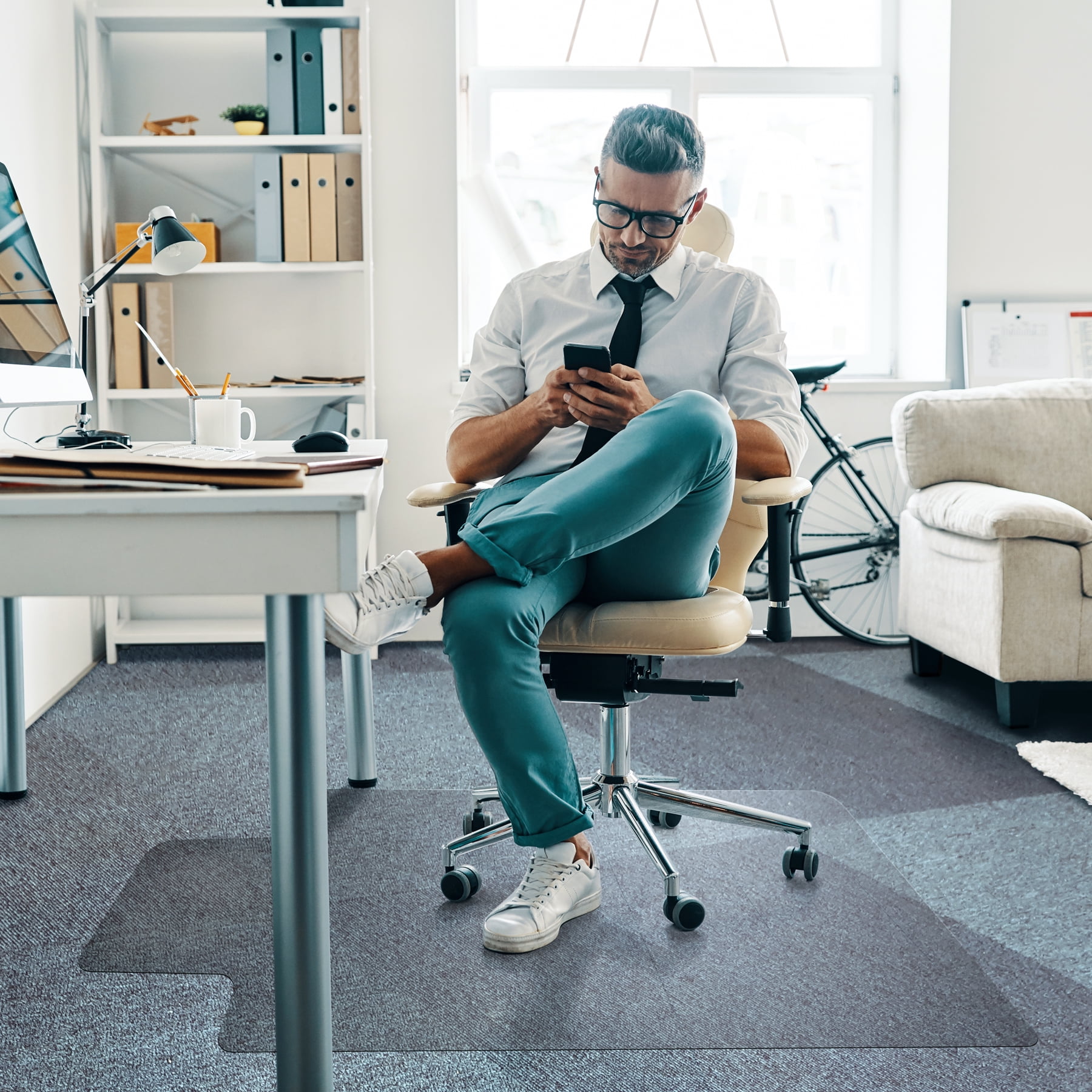 Made from original Floortex polycarbonate. Our premium plastic mats are incredibly tough and durable with twice the impact strength of vinyl to provide a perfectly flat and rigid ergonomic easy glide roll surface. Material is used in aircraft windscreens and bulletproof glass Rectangular office chair mat, with extended lip for additional protection under your computer desk. Protects your carpeted floors from general wear and damage caused by casters on rolling chairs Our clear Polycarbonate floor protector will not sink, crack, curl, cup, discolor or smell. The high clarity allows flooring to show through for an attractive and highly effective addition to your office or home environment Lies instantly flat from delivery for immediate and effective use. No need to wait for the mat to flatten. Compatible with under floor heating systems Eco-friendly manufacturing with 50% of our manufacturing site’s energy coming from on-site and external renewable sources. 100% recyclable. Free from Phthalates, tin, lead and cadmium. Child and pet safe. GreenGuard certified Please note, due to the manufacturing process this product has a +/- 5% size tolerance. All measurements are rounded to the nearest inch Gripper back for use on low to medium pile carpets (up to 1/2″). Not suitable for hard floor applications. Product Size – Rectangular 48” x 60″ (Lip Size 25″ x 12″). Limited Lifetime Warranty