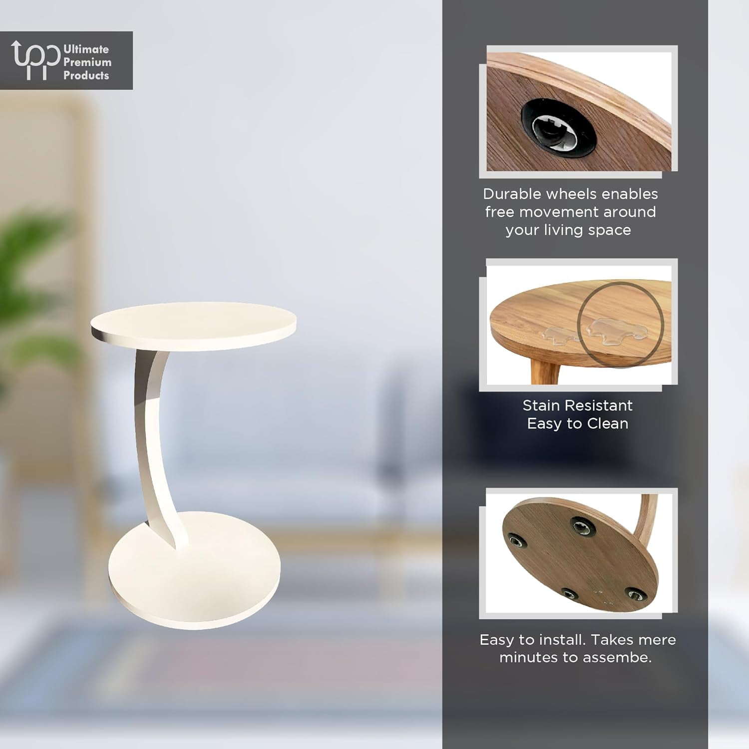 Ultimate Premium Products C-Shaped Round End Table with Rolling Wheels White