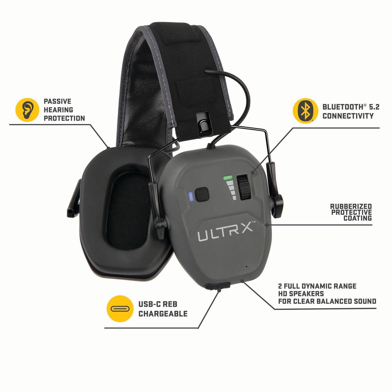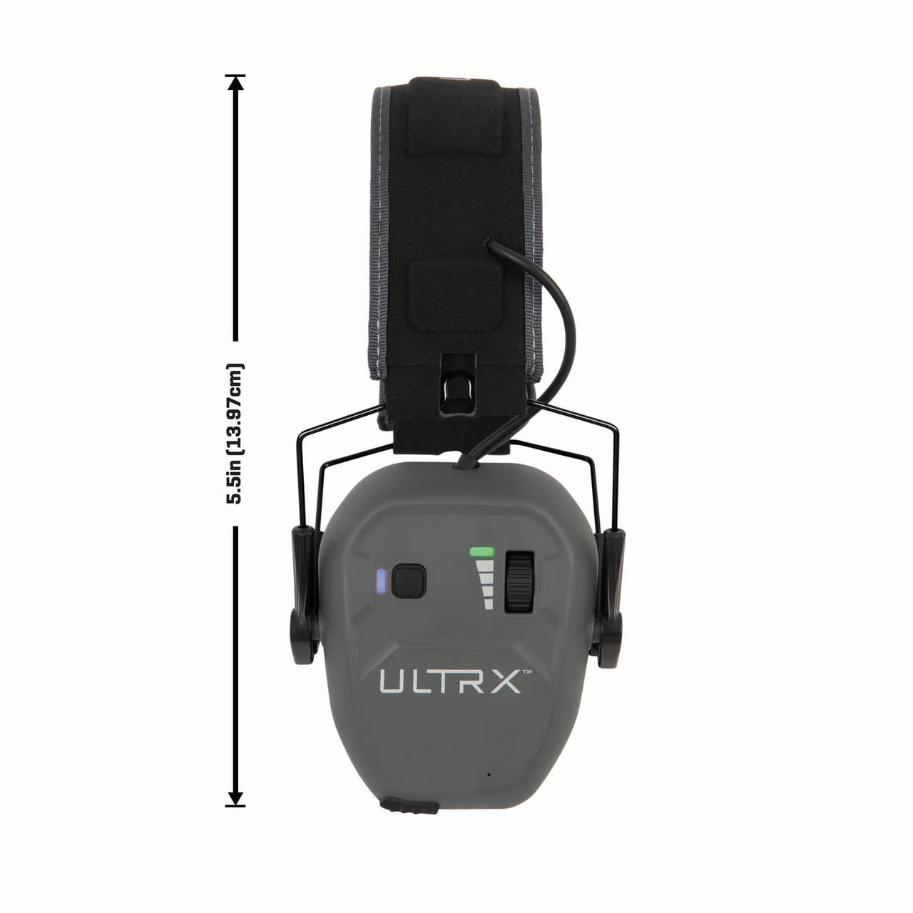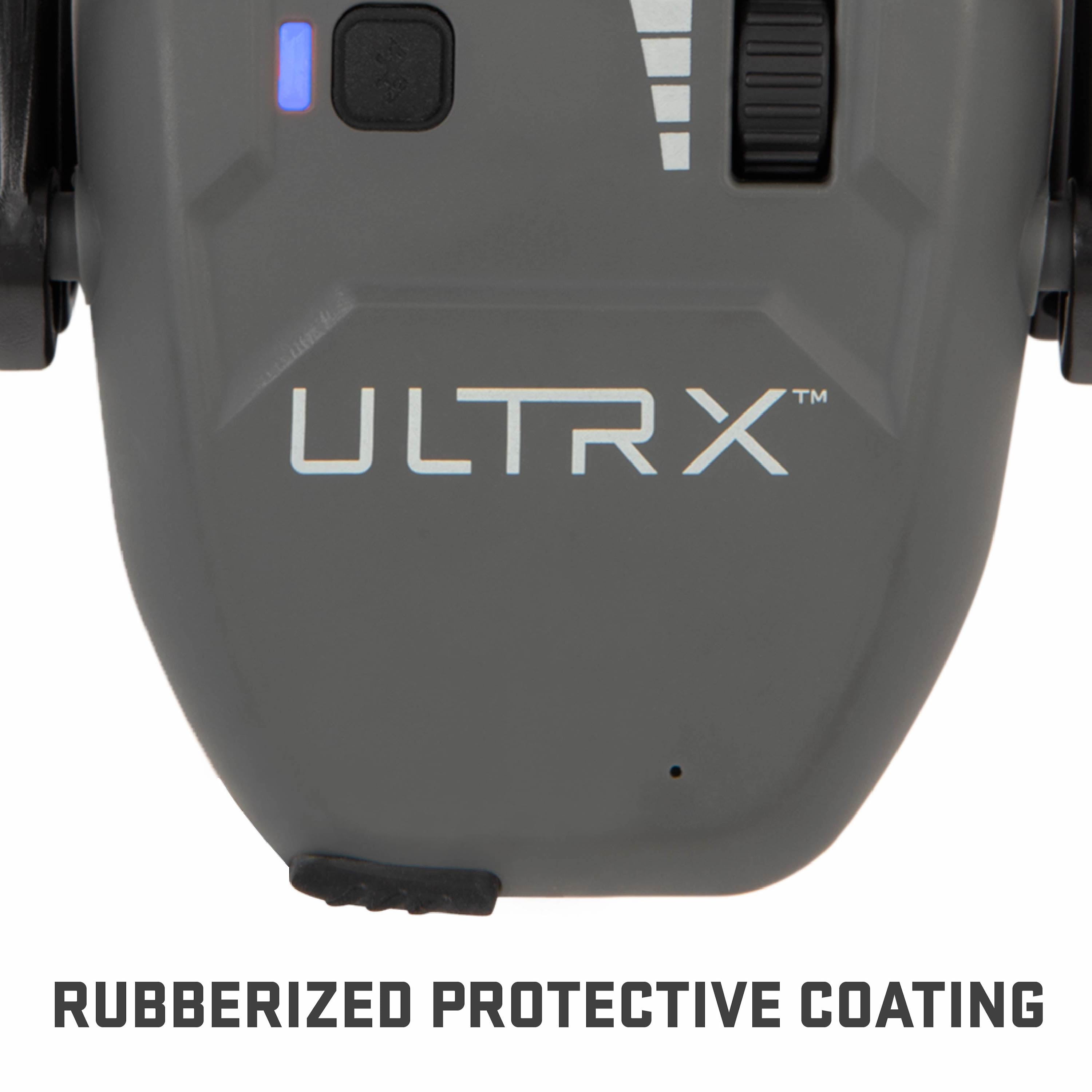 Bluetooth earmuff, NRR 23db rated USBc charge/recharge port function Soft, adjustable headband Contains dual full dynamic range HD speakers for clear balanced sound Includes a polymer lithium battery Made of a rubberized, soft-touch coating Ultrx Bionic Bluetooth Earmuffs Nrr 22 Decibels Gray 0.52 lb Model 2242A