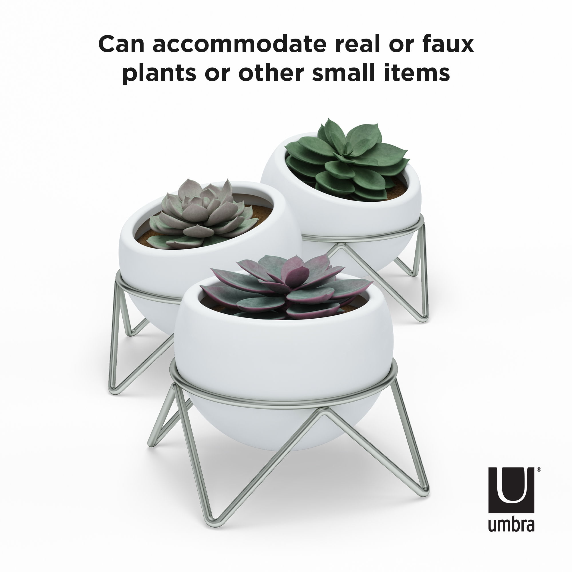 The Potsy Planter is the perfect solution for introducing plants indoors. Its modern and metallic wire stand displays plants to be shown off at their best angle. This trio of ceramic planters can be placed in your living room, kitchen, desk, bedroom or window sill to add the perfect amount of greenery inside. Looking for a decorative indoor pot for faux plants No problem. Accommodating a variety of indoor faux or real plants, succulents, cacti and more, these modern planters make decorating simple and also make for a great gift. Potsy’s simple and modern design adds a unique decorative element and is perfect for opening up small living spaces. Its metallic matte brass or nickel accent adds a pop that contrasts beautifully against the pot and the greenery inside