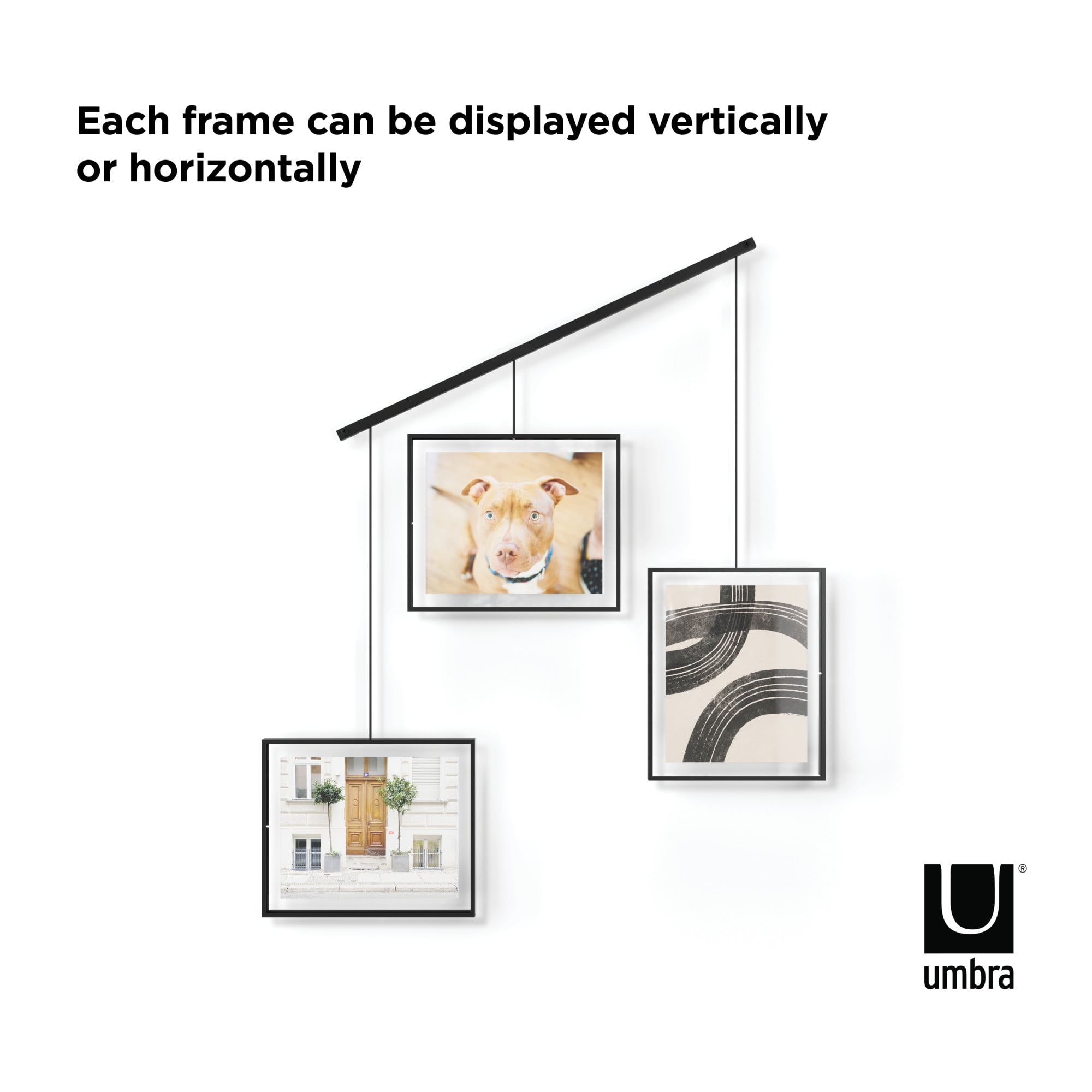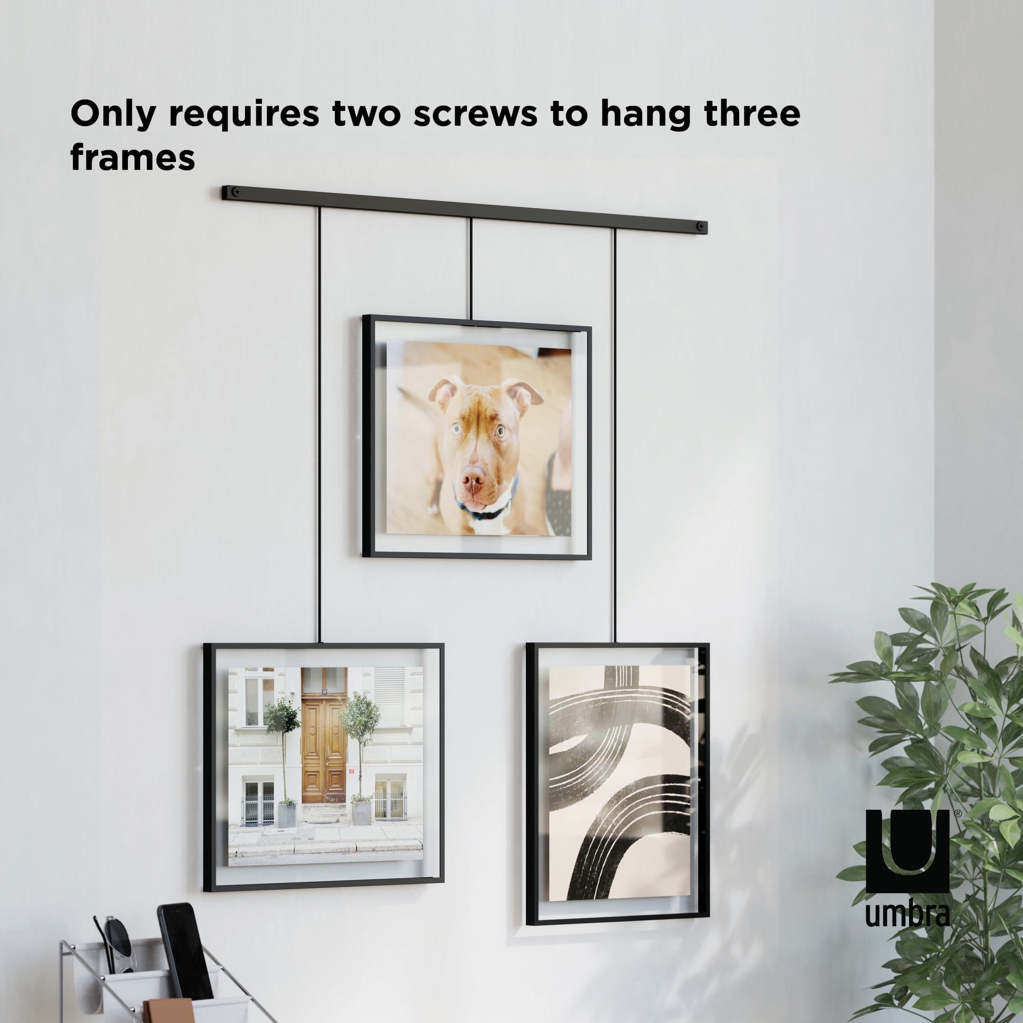 MULTI-PHOTO WALL DISPLAY: Display your favorite photos in an eye-catching fashion using these three hanging, gallery-style frames suspended from a modern and sleek beam; each frame floats a 5×7″ image CUSTOMIZABLE LAYOUT: Each picture frame can be moved around the included metal beam, while the hanging rods can be interchanged to create multiple configurations to best fit your space UNIQUE WALL DECOR: Exhibit makes for an eye-catching and modern wall art display. Add a second Exhibit to create an engaging wall decor statement CREATES LESS DAMAGE: Avoid the damage created by hanging multiple picture frames on your wall, Exhibit only requires two screw holes to hang 3 frames (includes mounting hardware) 5-YEAR MANUFACTURER WARRANTY: Shop with confidence knowing that all Umbra products are backed by a 5-Year Manufacturer Warranty