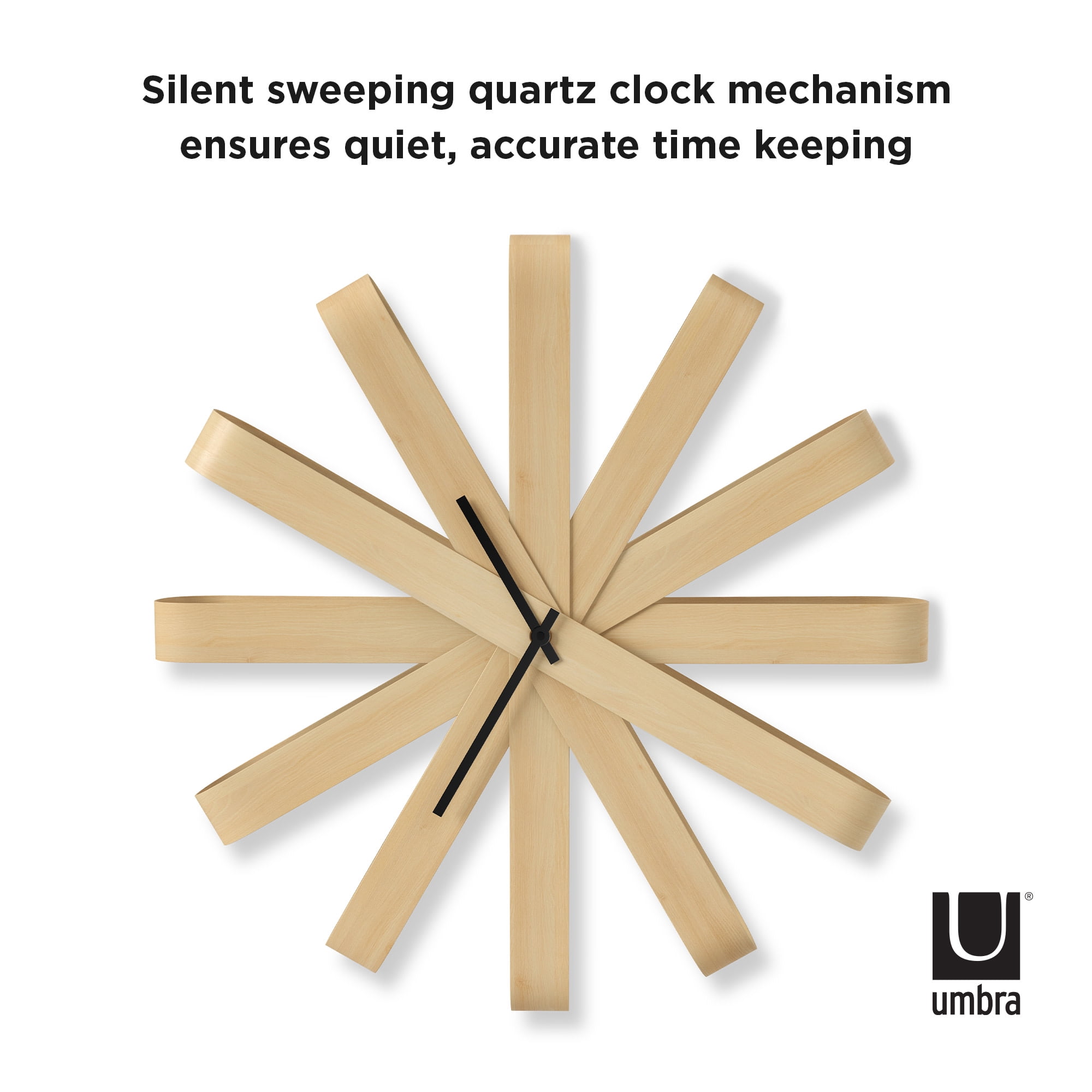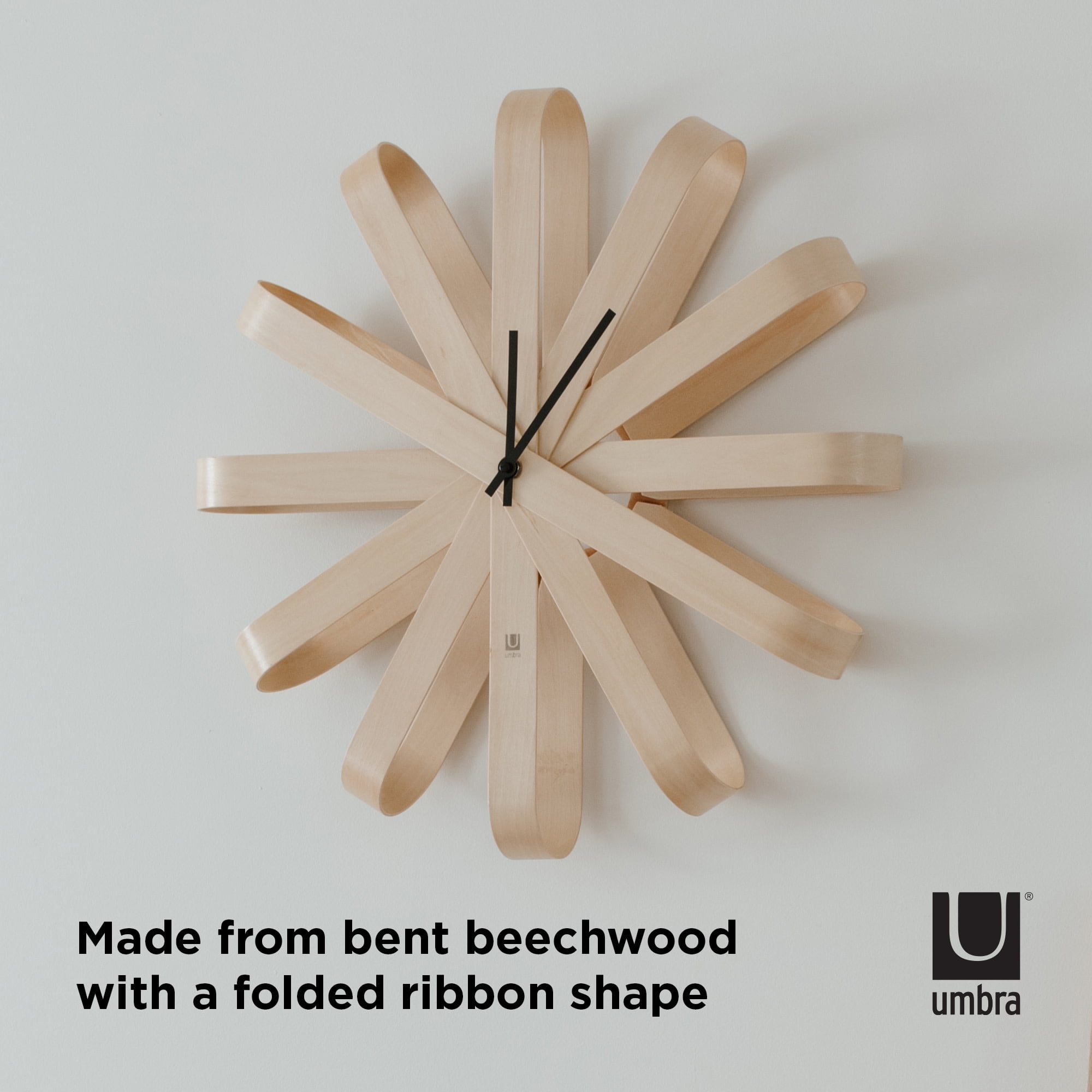 LARGE MODERN WALL CLOCK: This contemporary wall clock utilizes beech wood that’s gently bent into folded ribbon shapes – with each fold of the ribbon representing an hour on the clock SILENT SWEEPING QUARTZ CLOCK MOVEMENT: Each Ribbonwood wall clock features a non-ticking Quartz movement that runs silently and is maintenance free (no winding required) MADE OF BENT BEECHWOOD: The process of molding bent plywood is very expensive. It involves high pressure equipment, heat, special adhesives, and a lot of hands-on workmanship to ensure quality control ALL UMBRA CLOCKS ARE TESTED IN-HOUSE: Inside our factories is a wall where every single one of our clocks is tested to make sure it ticks just right UP TO A 5-YEAR MANUFACTURER WARRANTY: Shop with confidence knowing that all our products are backed by the added security of a warranty up to 5 years