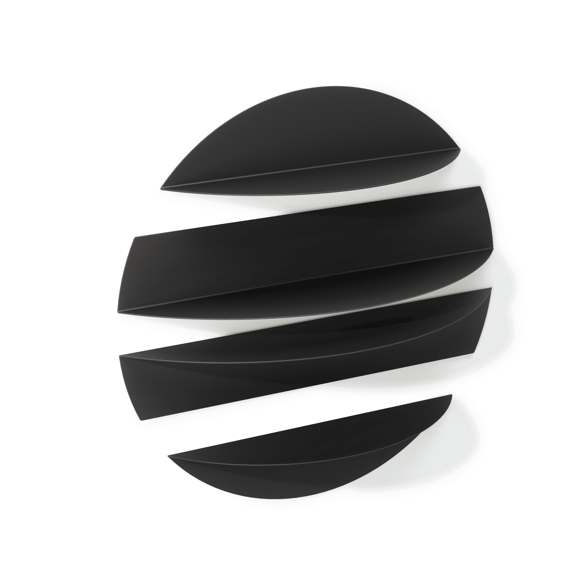This set of four unique wall shelves are made of bent metal and can be used together to create an eye-catching wall display that doubles as storage. Made up of two large and two smaller shelves, each shelf can be mounted individually or placed together. Each shelf can also be mounted with the shelf surface facing upwards or downwards. Use Solis to display or store books, decorative items, candles, picture frames and more. Small shelf load capacity of 10 lbs (4.5 kg) and large of 15lbs (6.8 kg). Patent 中国外观设计专利 CN 307176665 S